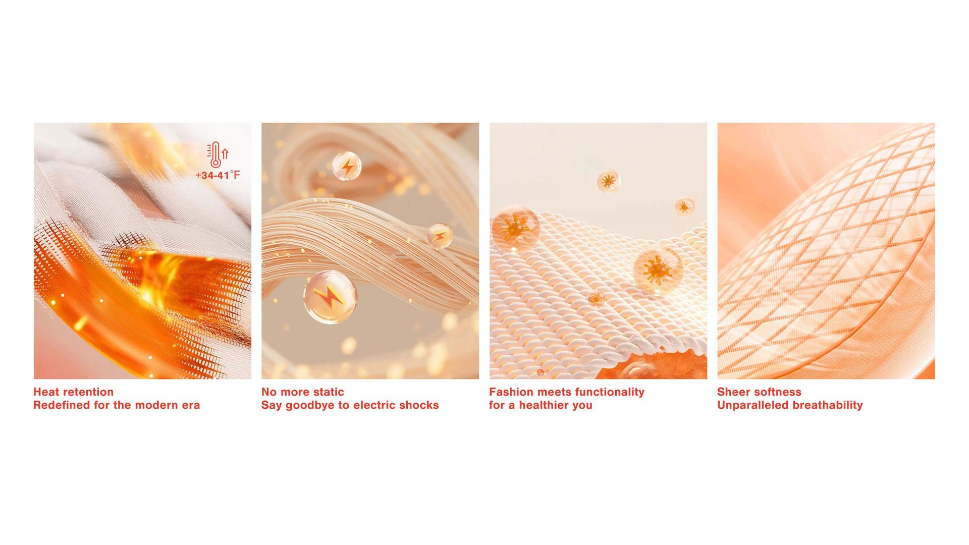 The core functional fabric, certified to national standards, boasts an infrared emissivity of 0.94, enabling a 1–5°C increase in perceived body temperature within 3–5 minutes of wear, with an overall thermal performance improvement of approximately 15%. This fabric activates the body’s natural heat for lightweight warmth, avoiding the bulkiness of traditional winter clothing. With 48% high-elasticity fibers, it offers a soft, snug fit with excellent stretch and breathability, ensuring long-lasting comfort. Additionally, the fabric incorporates recycled coffee ground fibers, providing natural antibacterial and odor-resistant properties as well as moisture-wicking capabilities, enhancing hygiene while embracing eco-friendly sustainability.