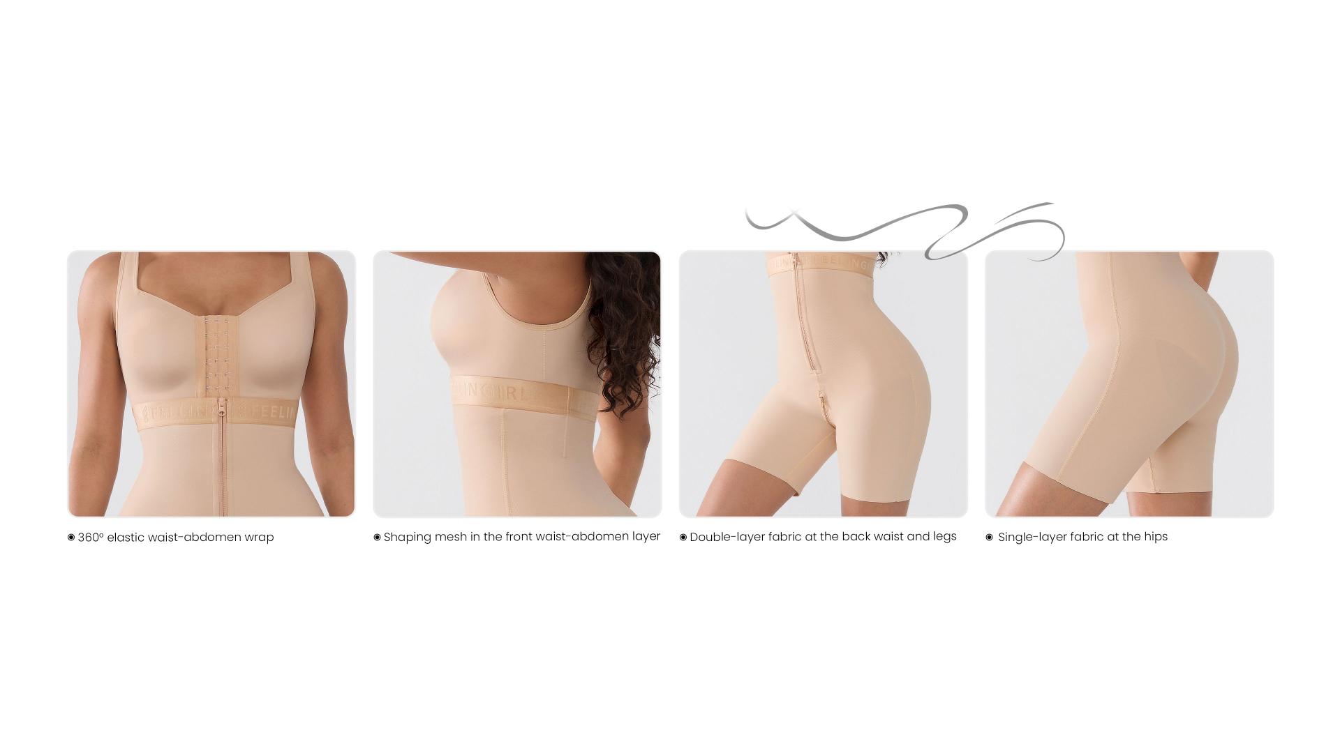 The FEELINGIRL post-surgery series is structurally optimized based on multidimensional human body curve data, utilizing scientific zoned compression technology to provide precise support and shaping control for the waist, abdomen, and lower hip areas. The waist and abdominal region features a 360° four-way stretch wrap design, with a shaping mesh layer in the front waist-abdomen area forming a three-layer structure for enhanced contouring.