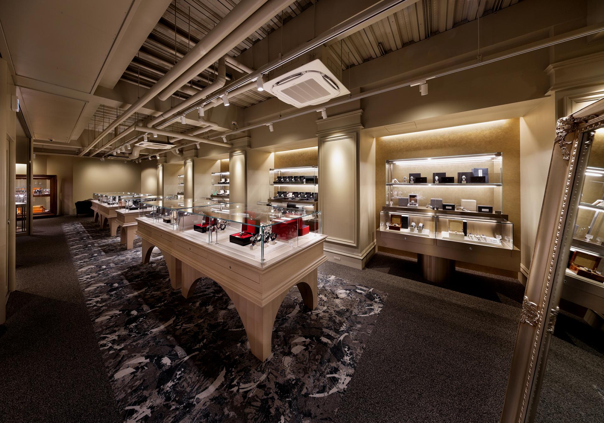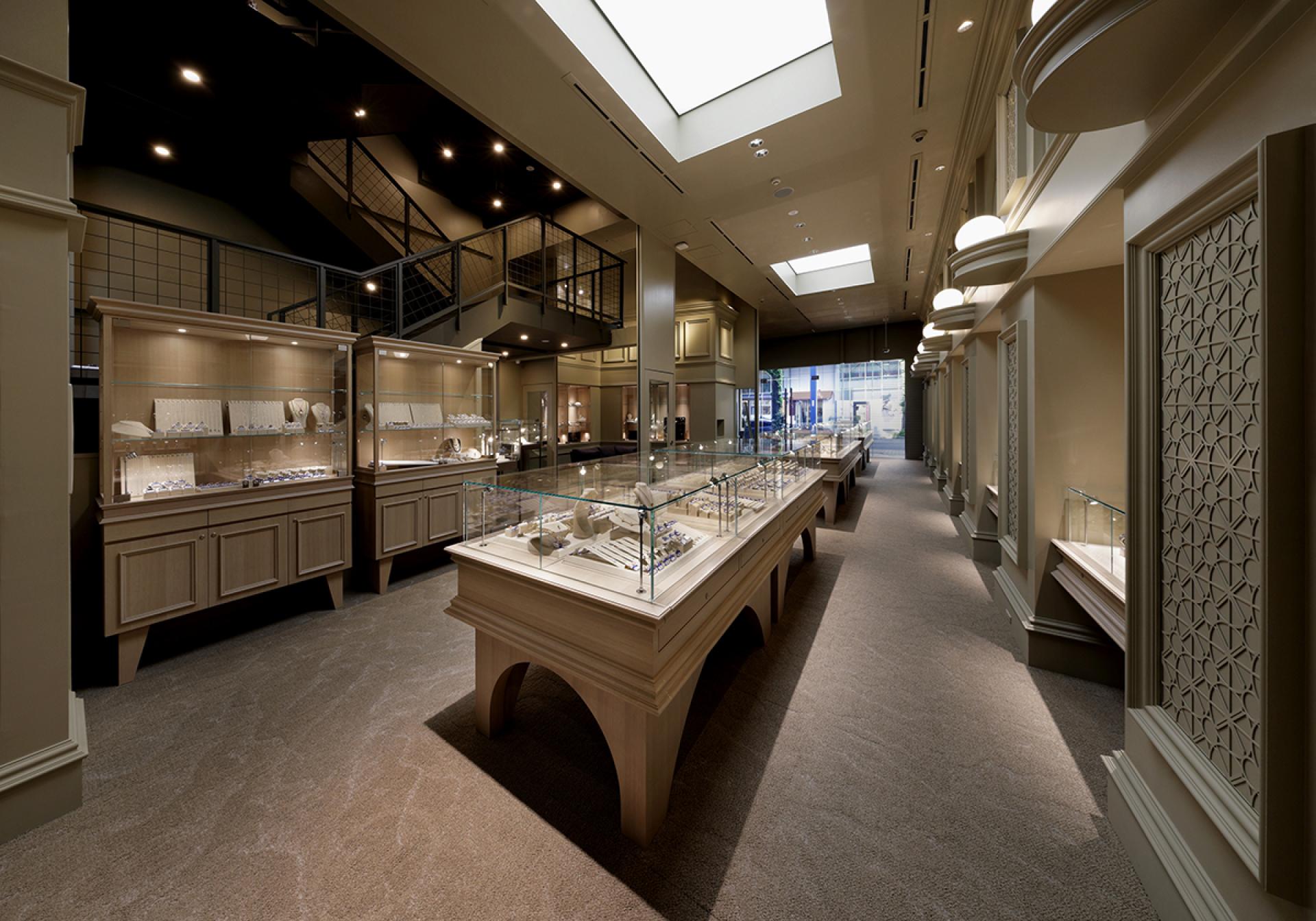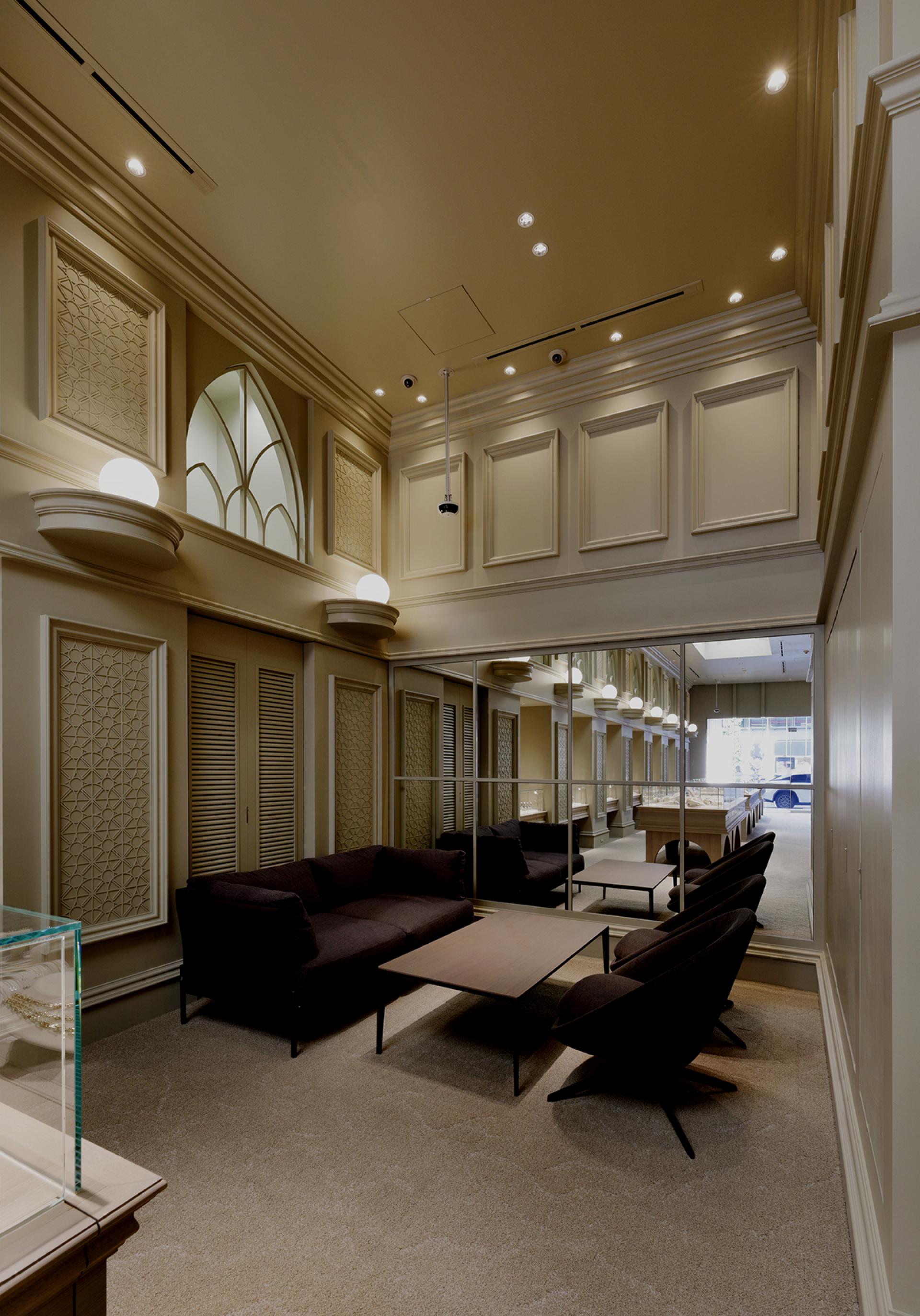 For the room with some depth and high ceiling, indirect lightings imitating lightwell are installed to produce a similar color temperature as natural light and to ease somewhat claustrophobic feeling. In addition, the molding on the display table follows the classic taste while the design is thought out to produce more modern flavor.