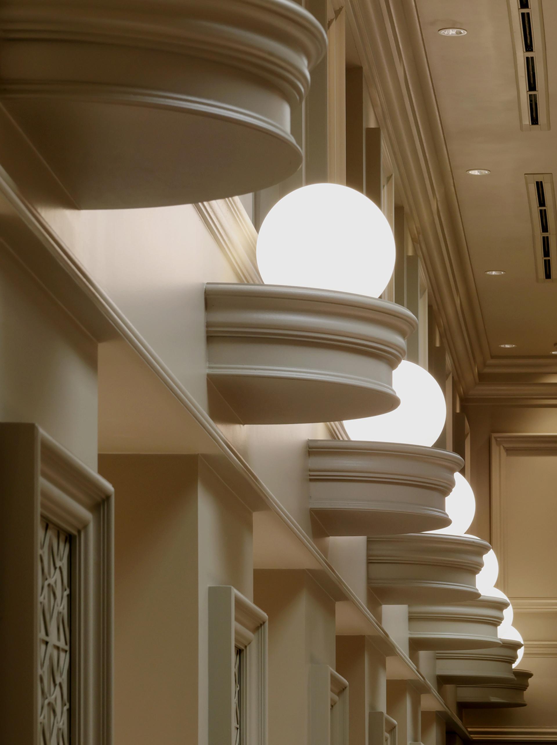 On the wall on the first floor, decorative pillars are placed in a row, arranged with family crest lattice pattern and sconces in a unified ivory color. Indirect lighting through the transom windows aligned above is adding a nice accent.