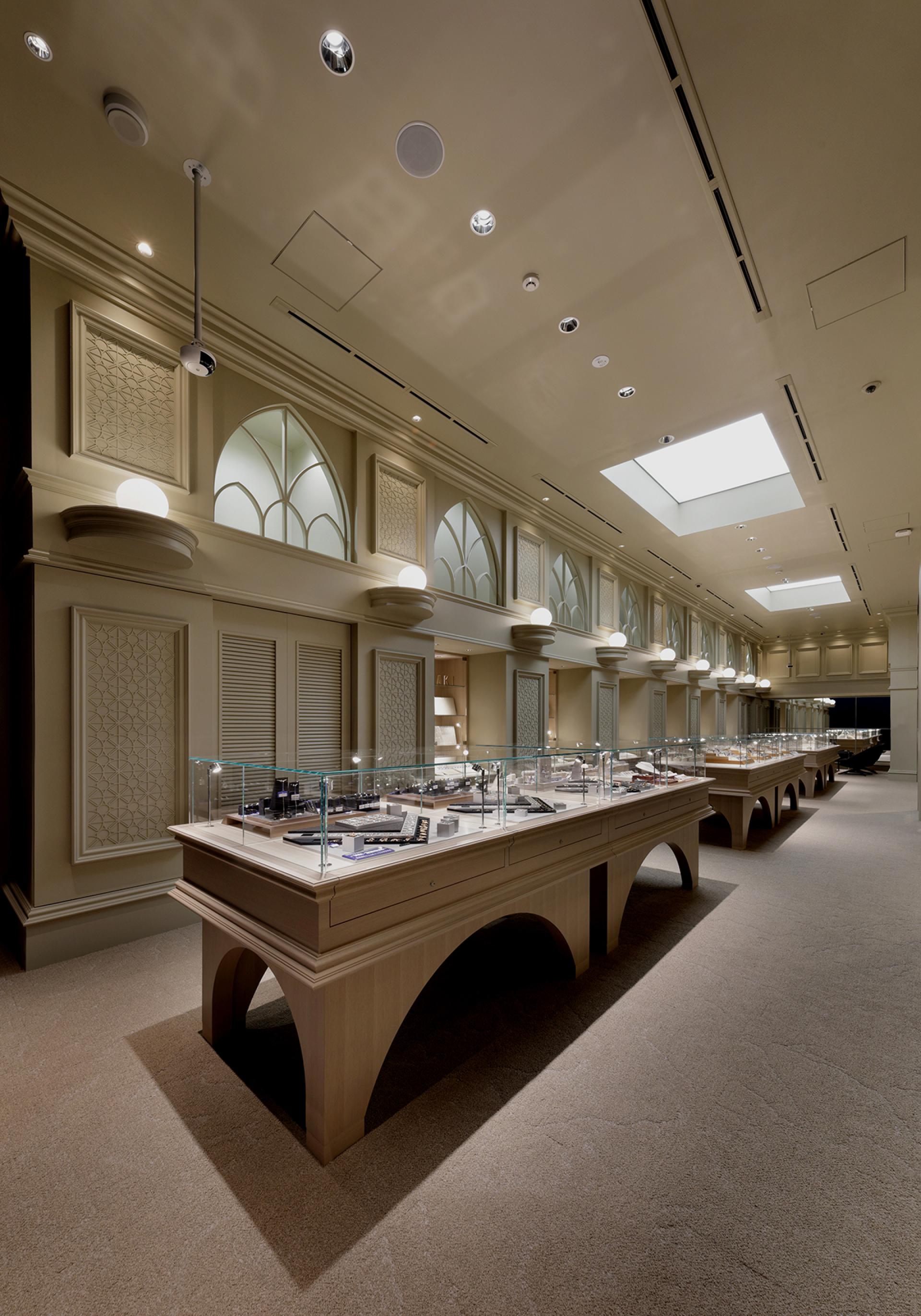 The same decorative pillars are placed on the second floor as well. Between the decorative pillars are the walls in deep gold color. In front of the gold walls, glass display cases are arranged to produce gorgeous, yet calm atmosphere.