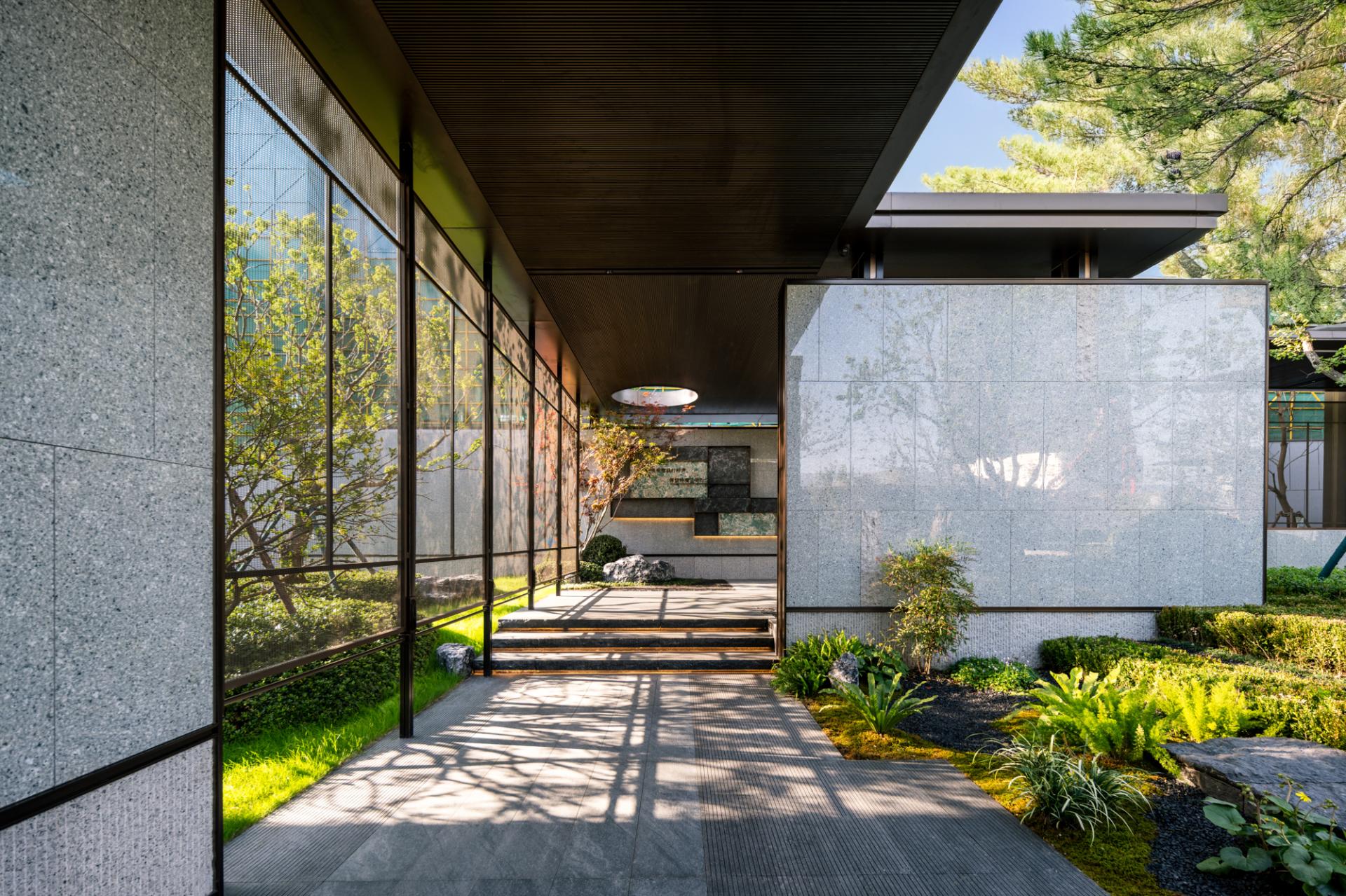 Inspired by the artistic legacy of Four Scenes of Landscape Painting and the "Zhenyue Series" philosophy, the project reinterprets Eastern aesthetics through a design featuring "one garden with three halls" (gate hall, pavilion hall, and main hall). The grand main entrance, spanning approximately 46 meters in width and 6 meters in height, creates a strong spatial presence. Material selections—such as Blue Eye mushroom-faced stone, gray ceramic panels, and metal accents—exude understated luxury.