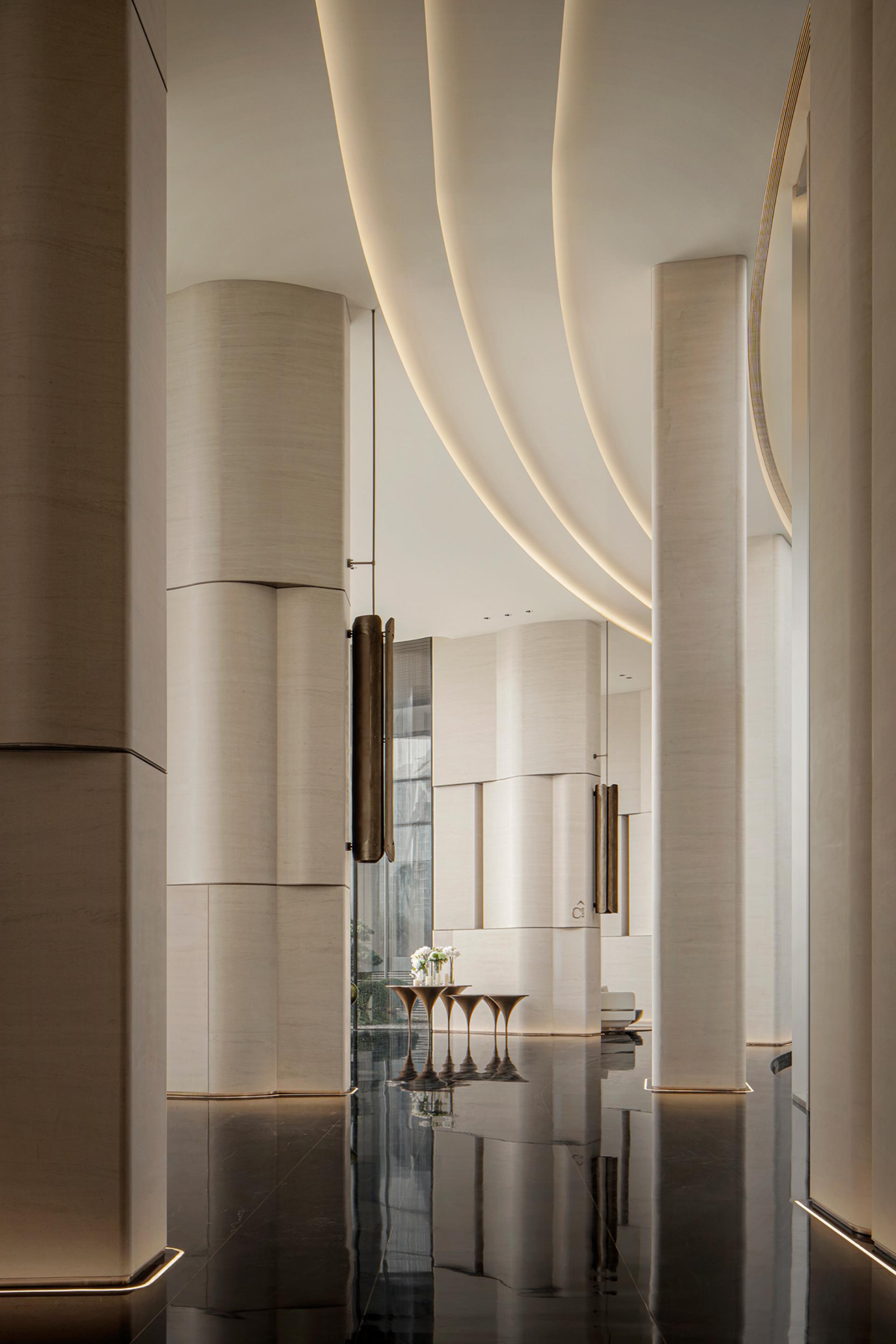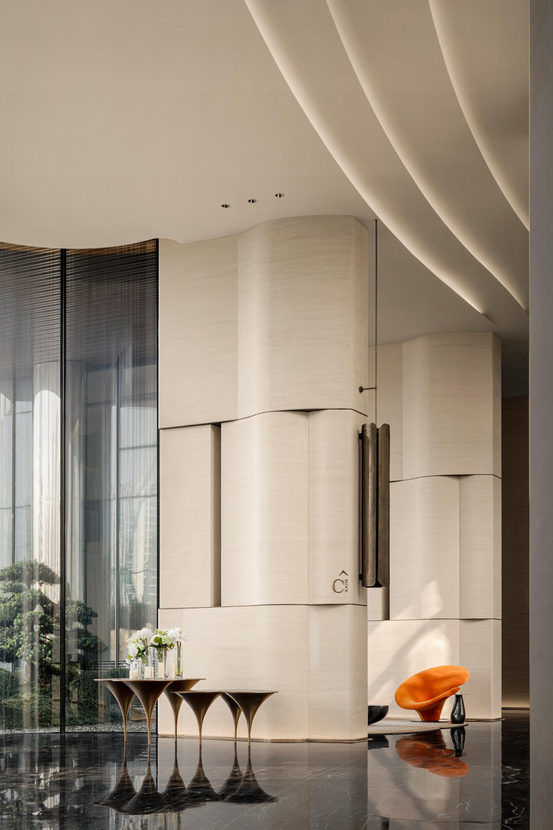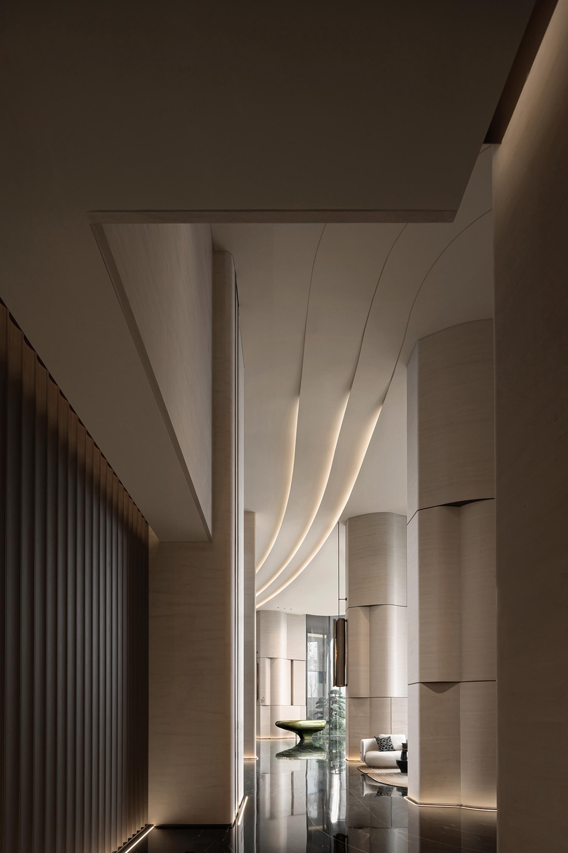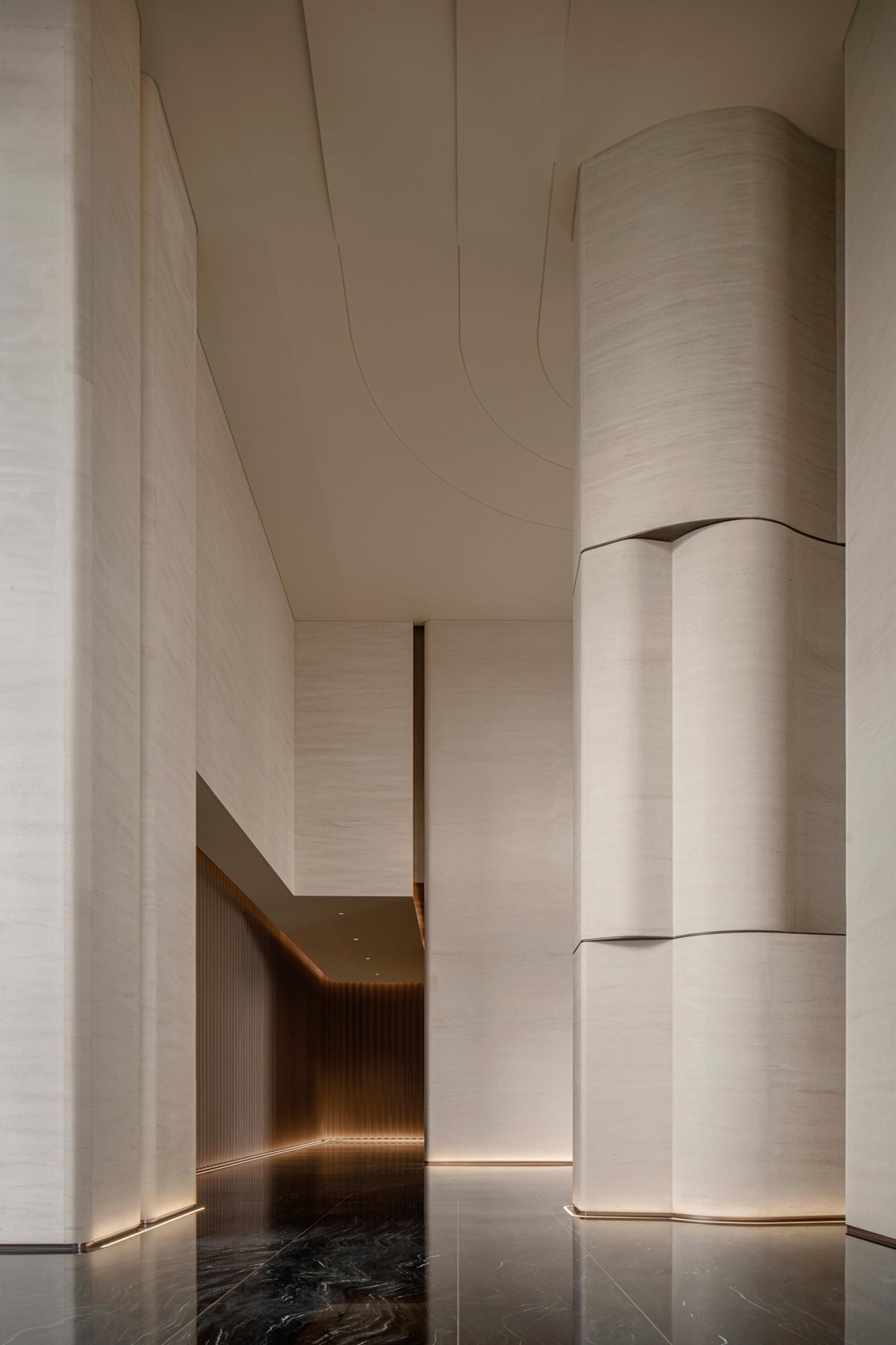 The wall and mountain stand tall and majestic, flowing slowly and gracefully. The column surface is laid with elegant travertine, and the furniture cleverly adopts the extended colors of nature, like the rhythm freely flowing between mountains and waters, guiding the soul into a quiet and profound world.