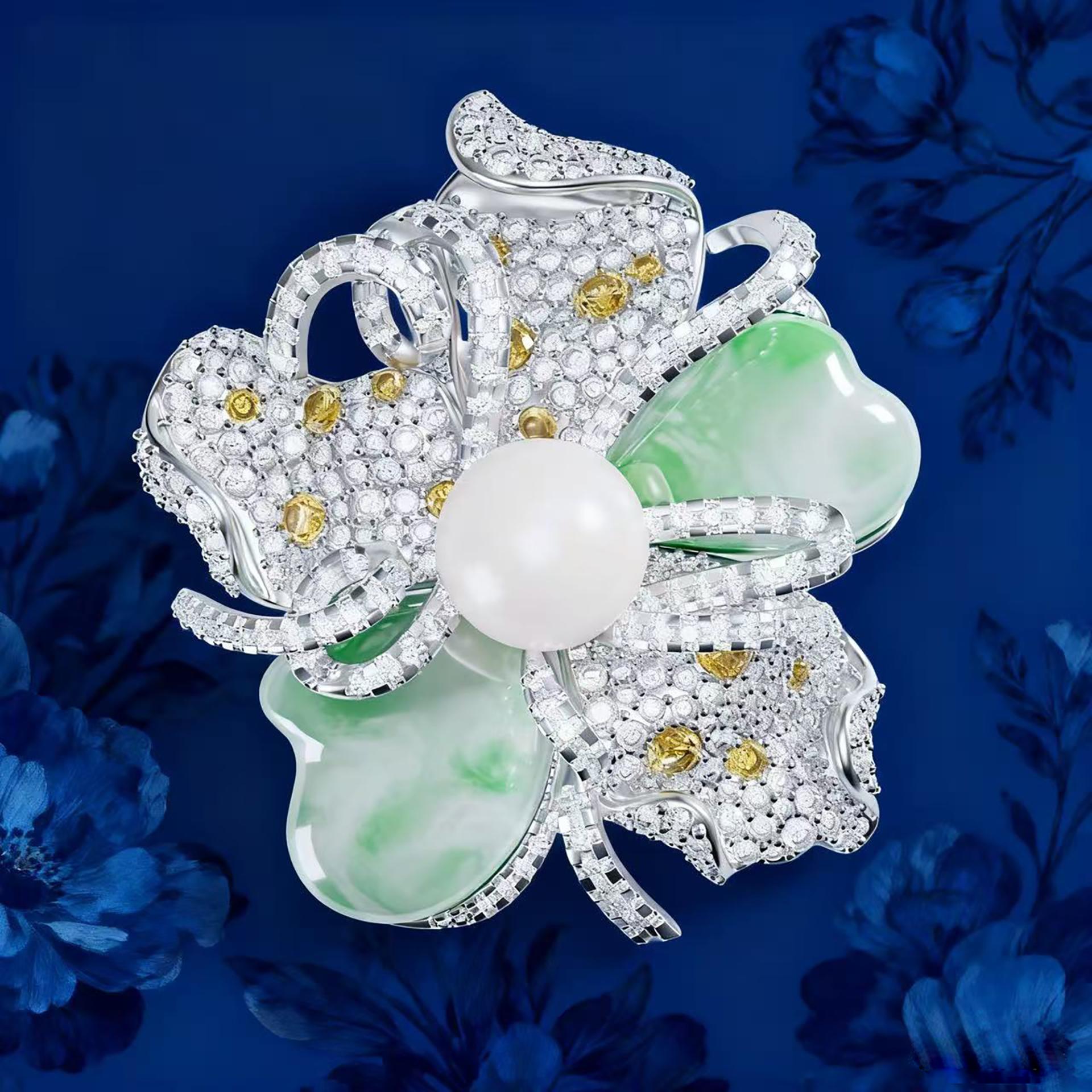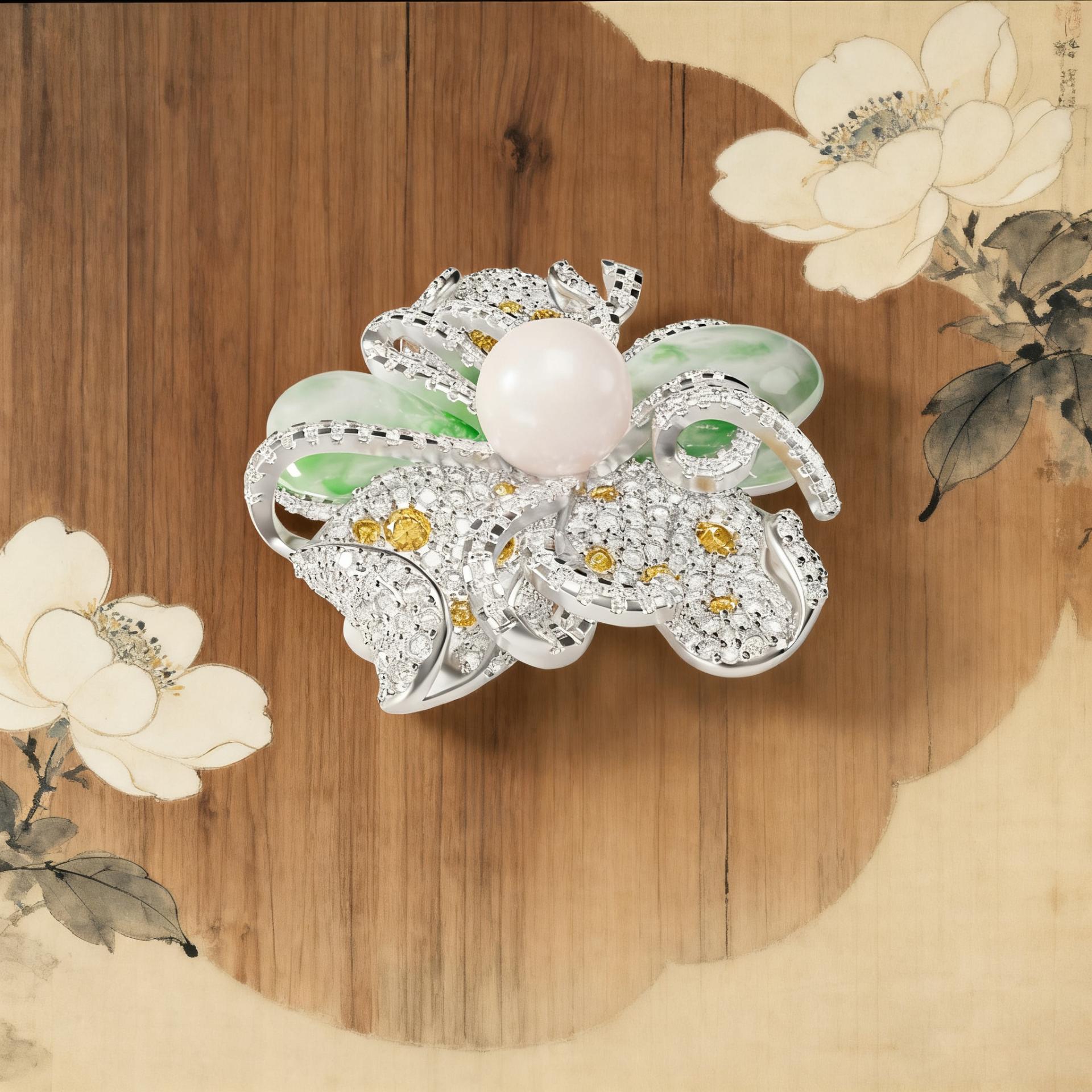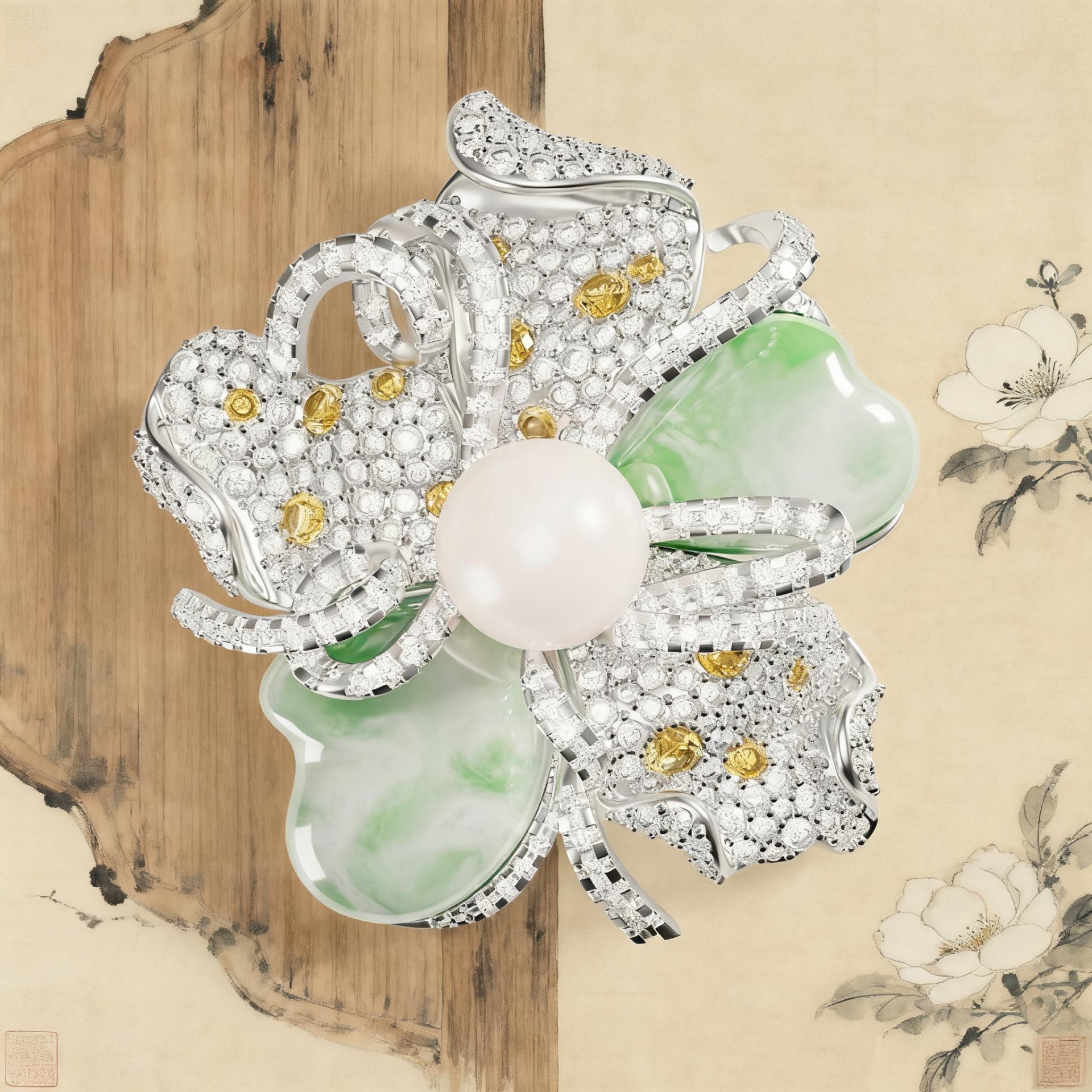 The Spring Dawn Jade Begonia Brooch is a wearable work of art that blends traditional Chinese auspicious symbols with modern jewelry craftsmanship, drawing inspiration from the beloved crabapple flower in classical literature. The petal shapes reference Tang dynasty crabapple-patterned silverware, reimagined with the expressive brushwork of Song dynasty flower-and-bird paintings to capture its blooming posture. Using jade, pearls, yellow sapphires, and diamonds as mediums, the designer condenses natural imagery into a compact form: jade forms the leaves, pearls the flower’s core, yellow sapphires the branches, and diamonds gleam like morning dew, together evoking a poetic scene of an Eastern spring dawn. This allows viewers to perceive the subtle poetry of Eastern aesthetics in its intricate details. When worn on the chest, it serves not only as an ornament but also as an embodied expression of cultural heritage.