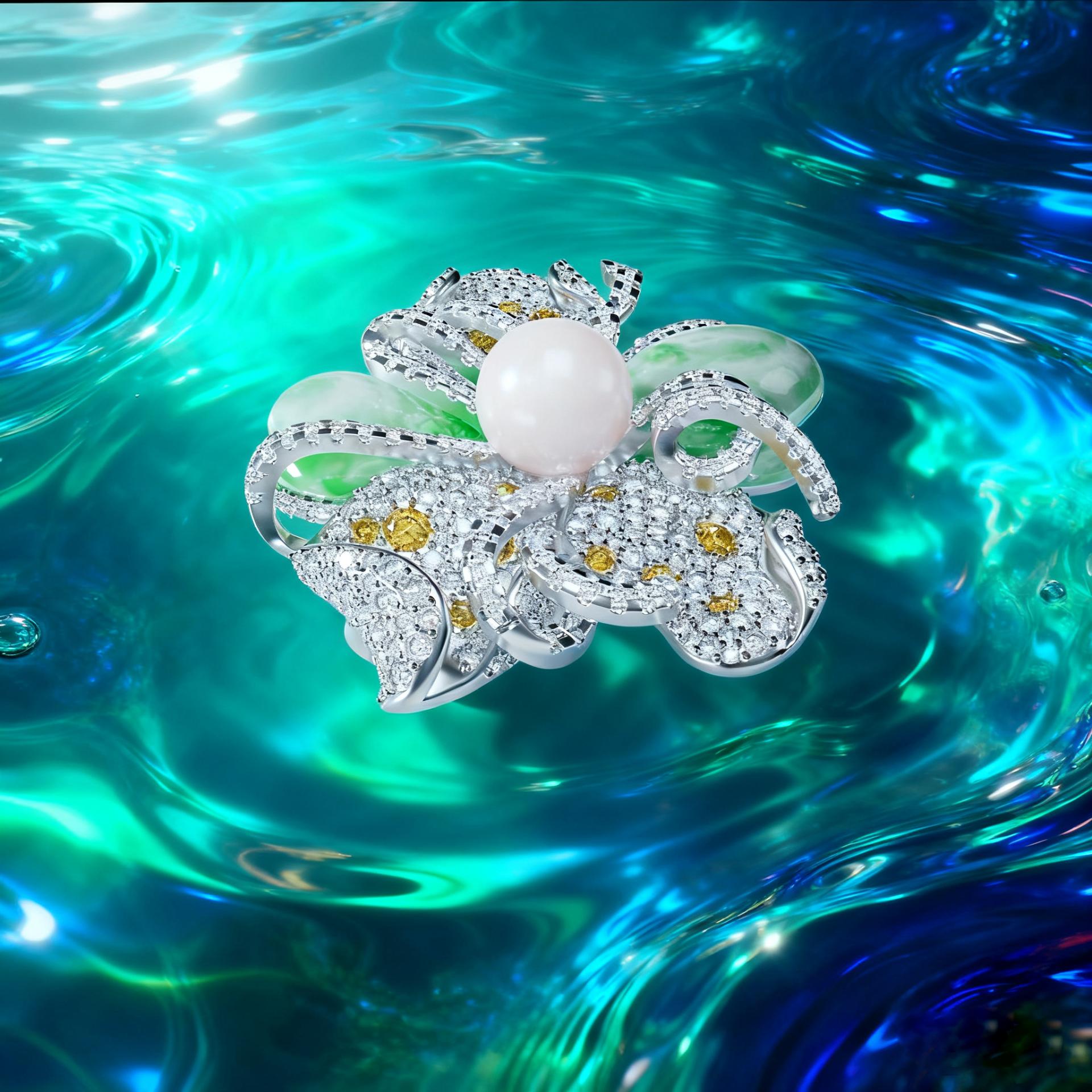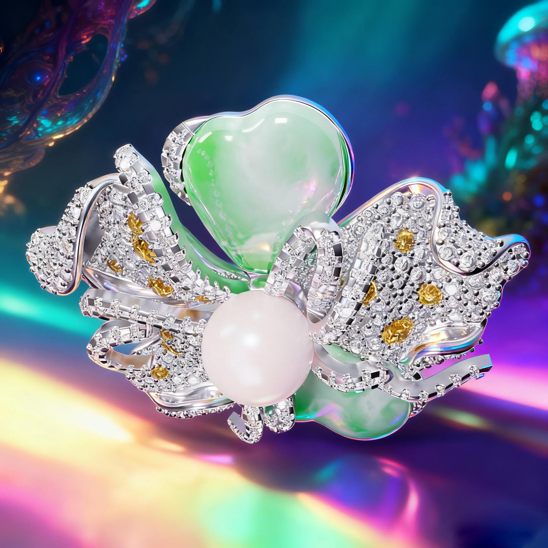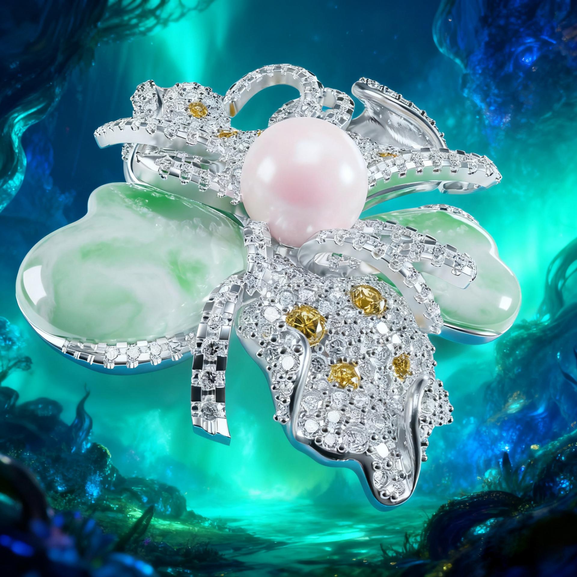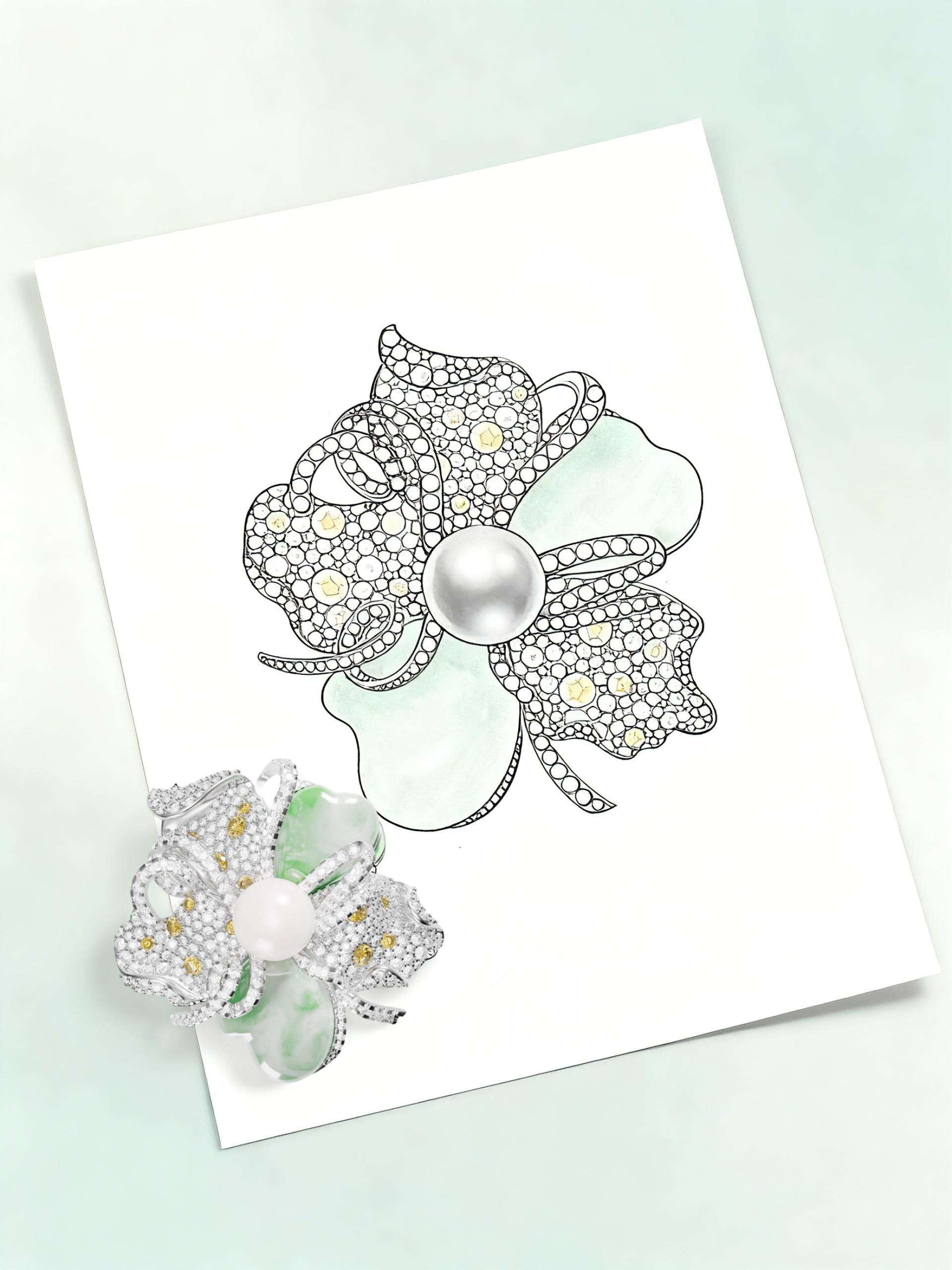 The Spring Dawn Jade Begonia Brooch is a wearable work of art that blends traditional Chinese auspicious symbols with modern jewelry craftsmanship, drawing inspiration from the beloved crabapple flower in classical literature. The petal shapes reference Tang dynasty crabapple-patterned silverware, reimagined with the expressive brushwork of Song dynasty flower-and-bird paintings to capture its blooming posture. Using jade, pearls, yellow sapphires, and diamonds as mediums, the designer condenses natural imagery into a compact form: jade forms the leaves, pearls the flower’s core, yellow sapphires the branches, and diamonds gleam like morning dew, together evoking a poetic scene of an Eastern spring dawn. This allows viewers to perceive the subtle poetry of Eastern aesthetics in its intricate details. When worn on the chest, it serves not only as an ornament but also as an embodied expression of cultural heritage.
