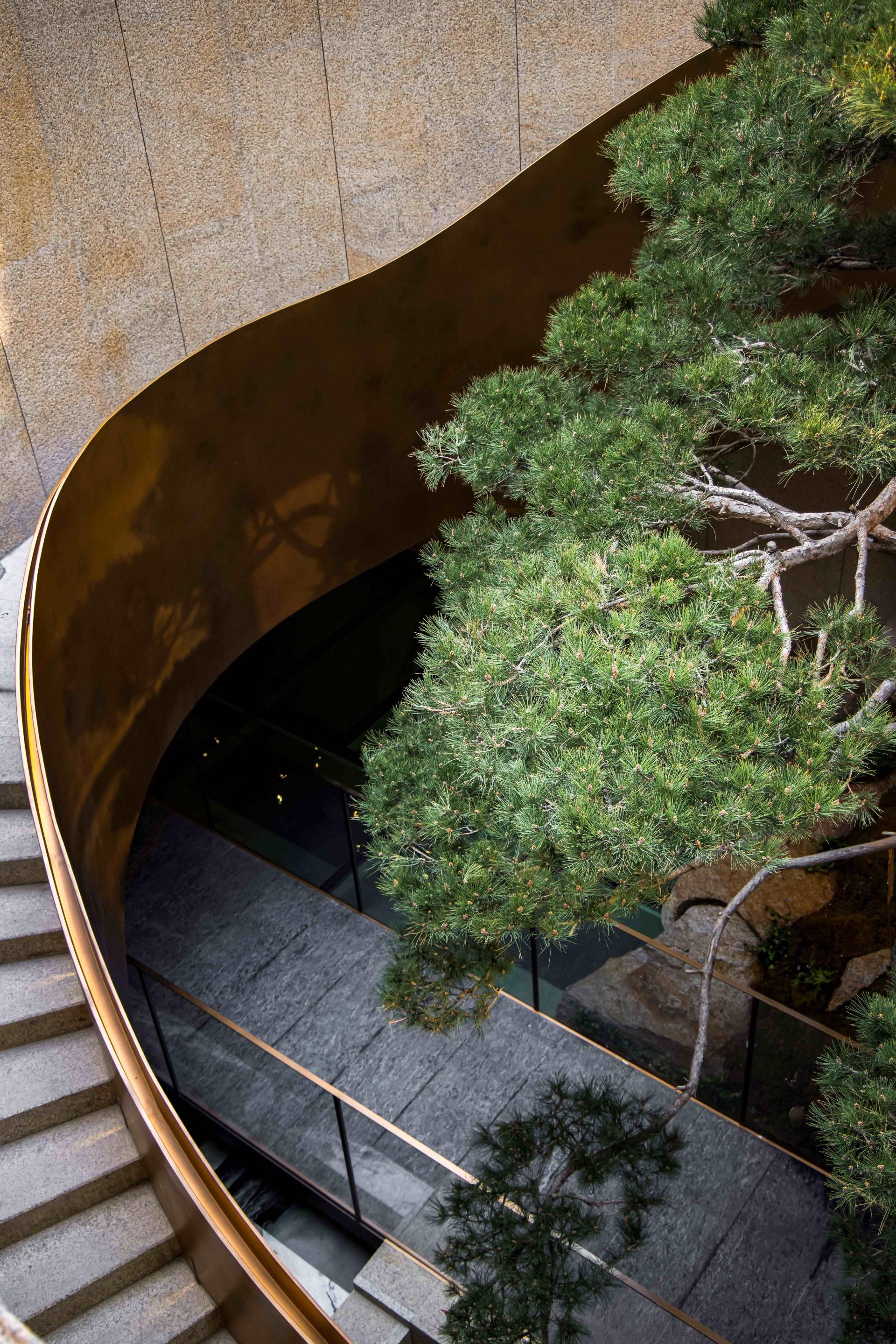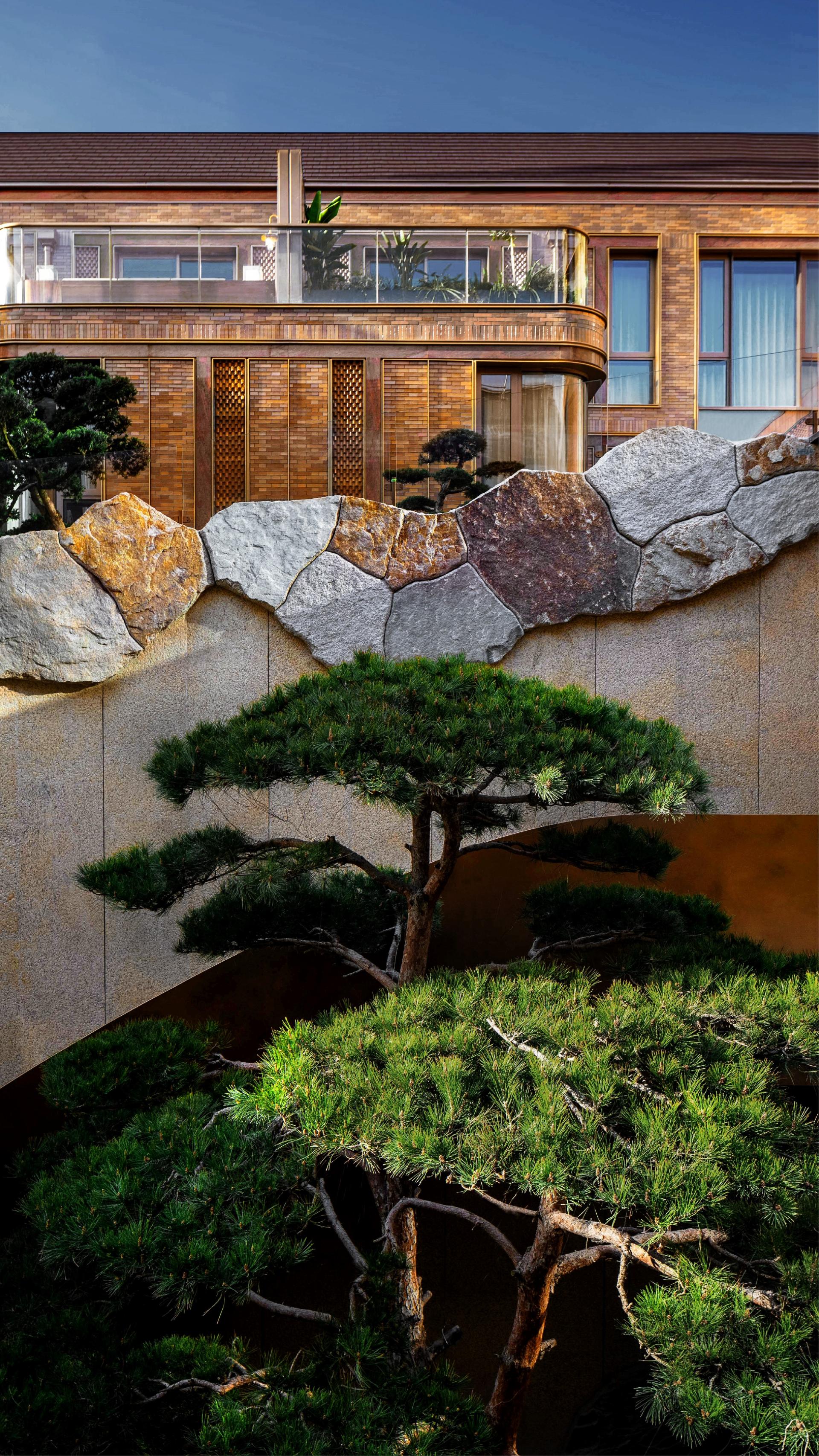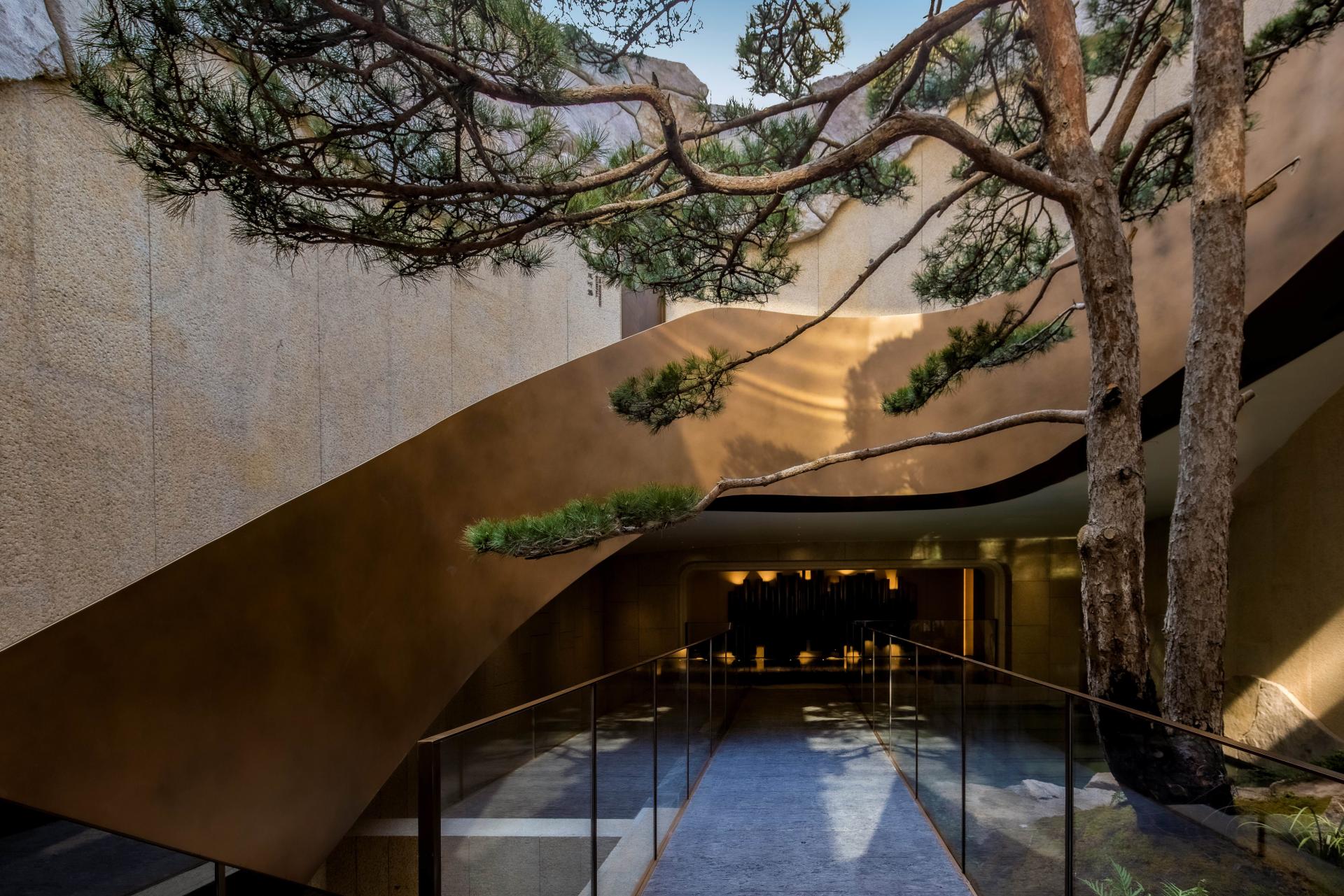 The landscape courtyard brings a strong visual impact, with a vertical depth of 15 meters to create a three-dimensional vertical axis painting. The pine tree rises from the ground, stretching its vitality and tension. Walking slowly along the corridor, a sequence of grids combined with short walls pave a light and rhythmically changing path of ritual homecoming. On the right is a deep and sunken courtyard, with textured stone at the top of the slope creating a continuous "mountain range", like walking on a cliff. On the top, gravel and plants simulate the murmuring stream, meandering through the pine forest.