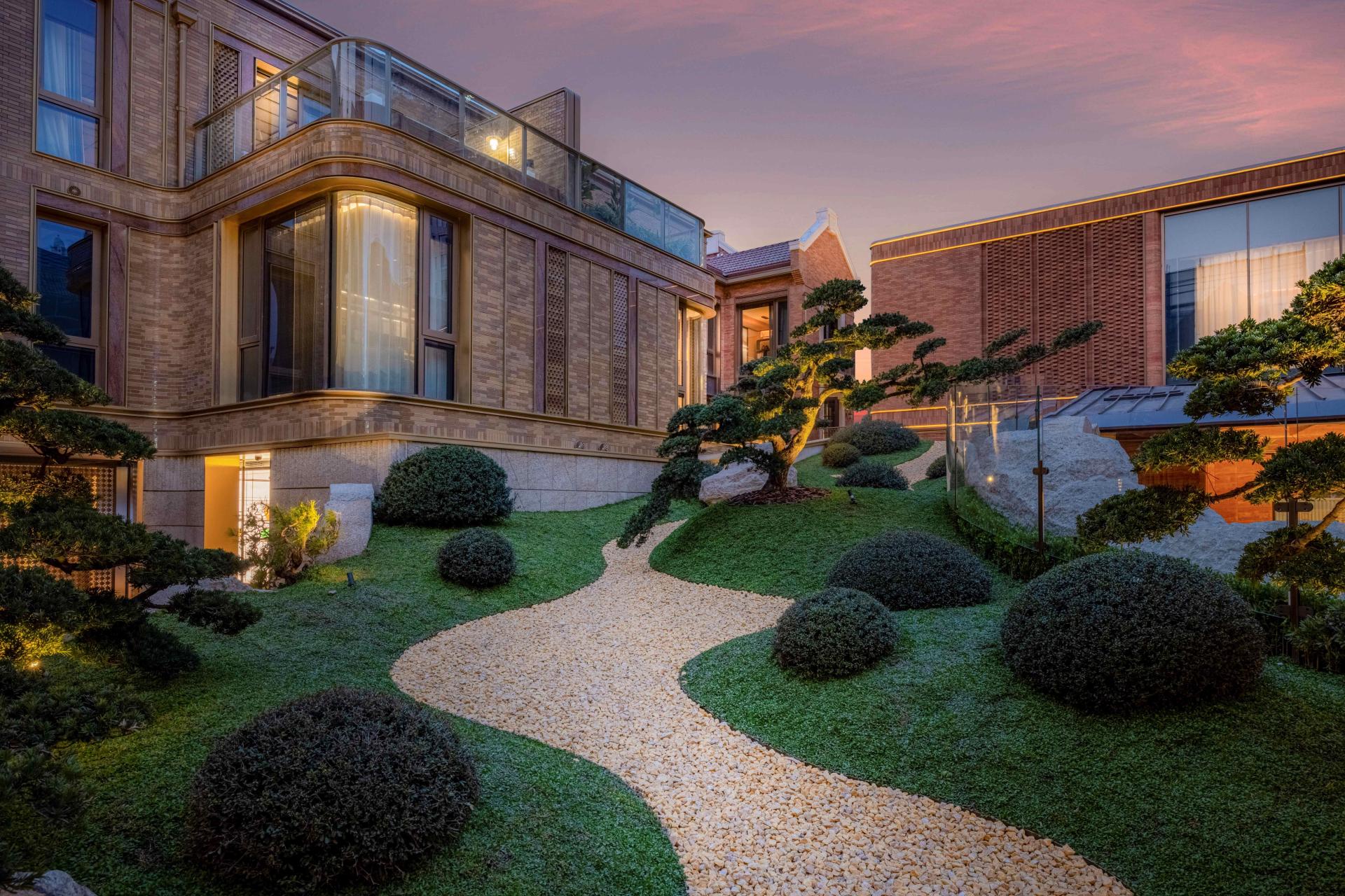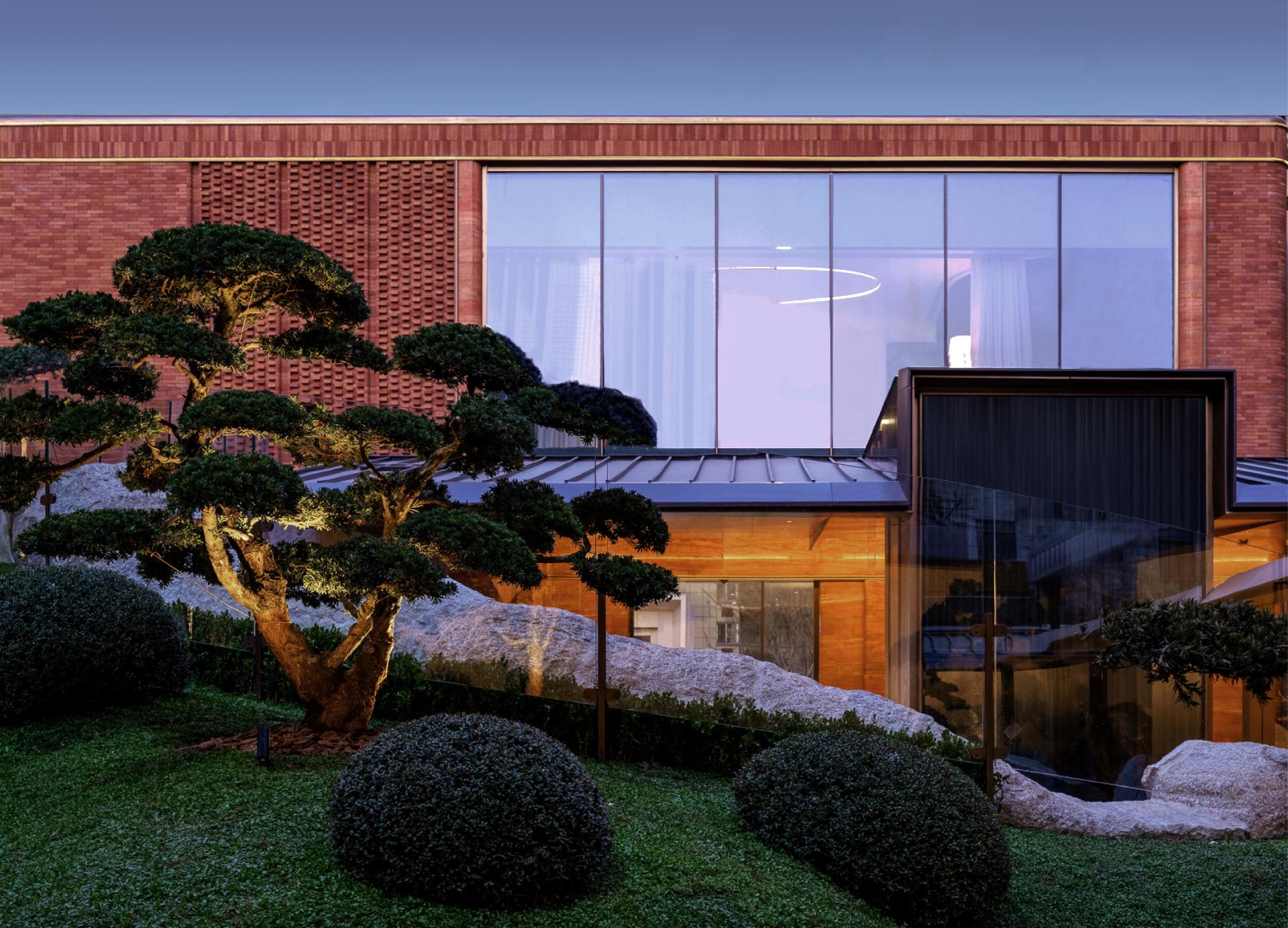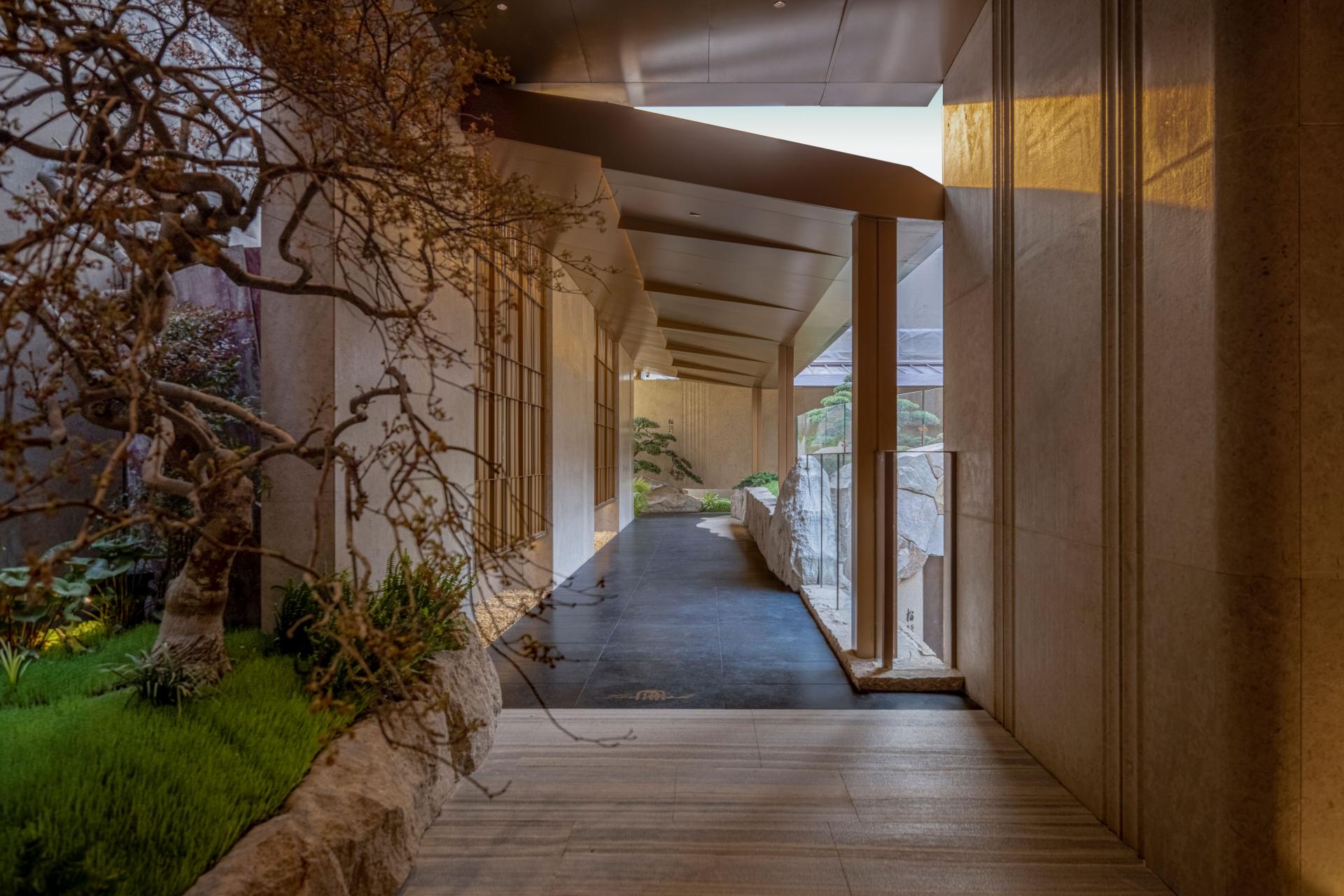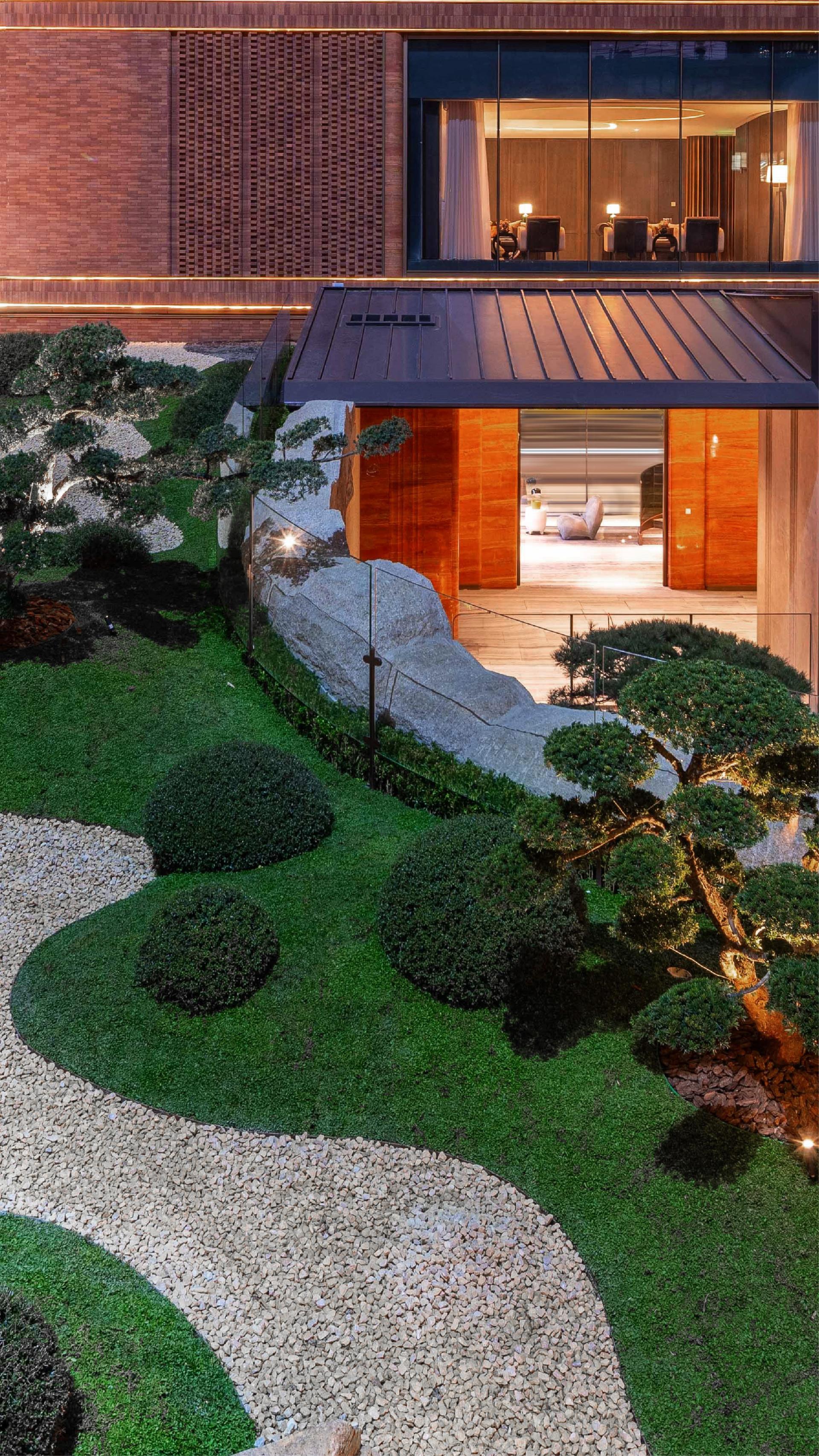 The landscape courtyard brings a strong visual impact, with a vertical depth of 15 meters to create a three-dimensional vertical axis painting. The pine tree rises from the ground, stretching its vitality and tension. Walking slowly along the corridor, a sequence of grids combined with short walls pave a light and rhythmically changing path of ritual homecoming. On the right is a deep and sunken courtyard, with textured stone at the top of the slope creating a continuous "mountain range", like walking on a cliff. On the top, gravel and plants simulate the murmuring stream, meandering through the pine forest.