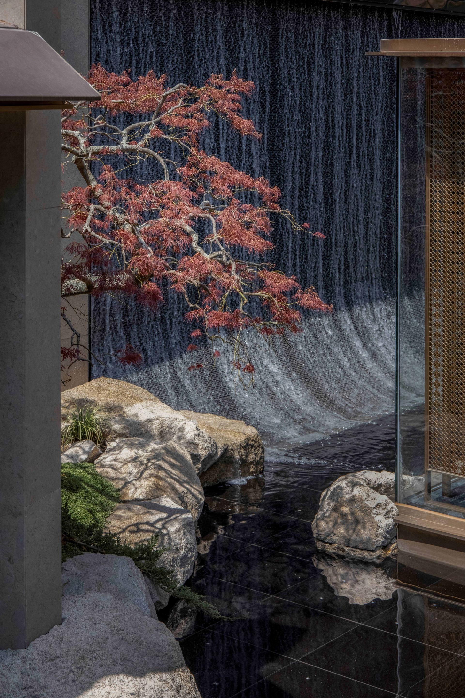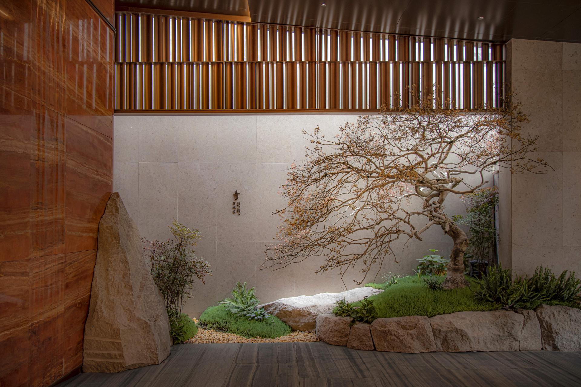 The landscape is based on the memory of the site, drawing inspiration from Fan Kuan's "Traveling amid Mountains and Streams", and integrating the living environment of mountains and rivers. Inquire and contemplate in the mountains and waters, pursue the authenticity of natural landscapes, and construct a spiritual field that is bright and clear, light and long-lasting. The demonstration area showcases the scenery of high mountains and flowing water, creating a bonsai style small and exquisite space in the ultimate space.