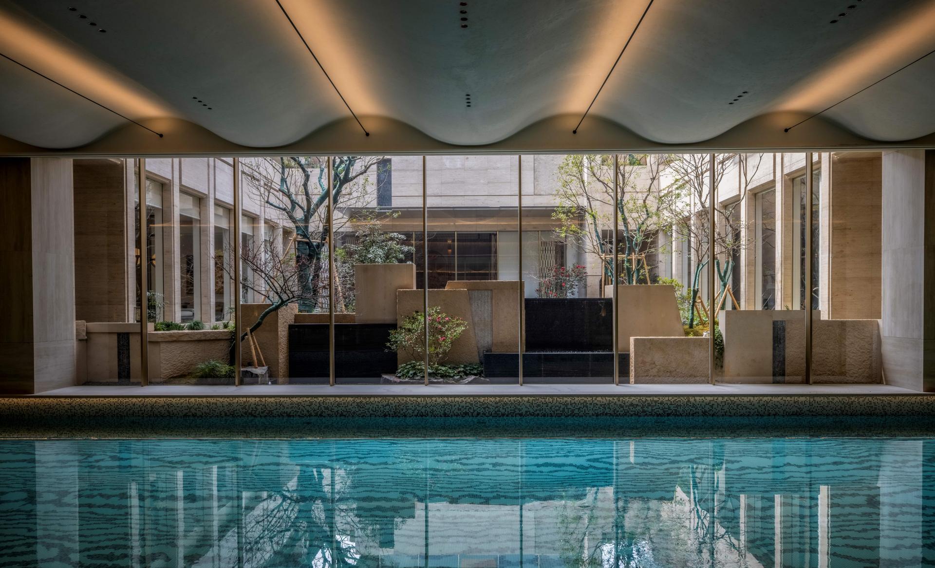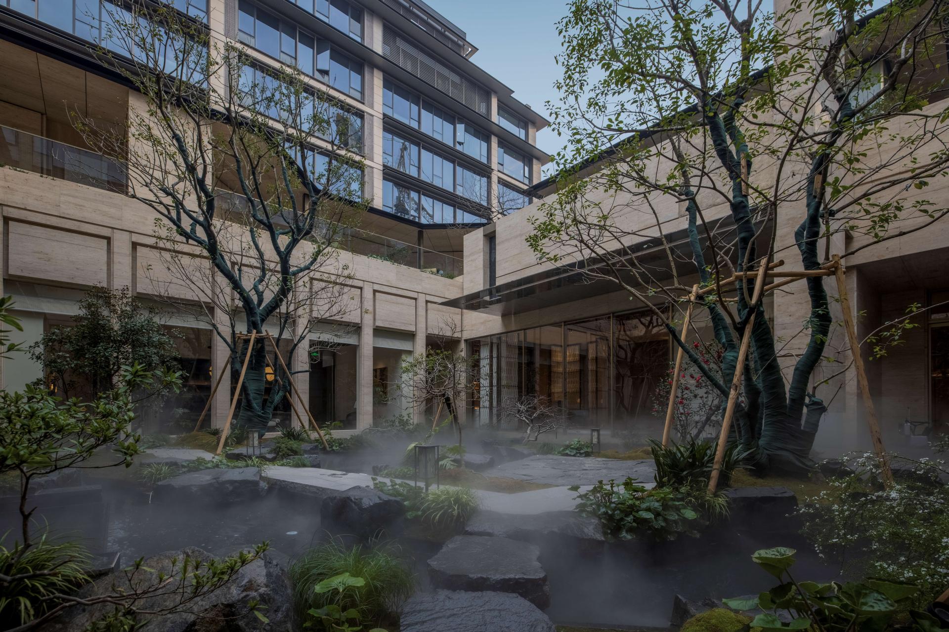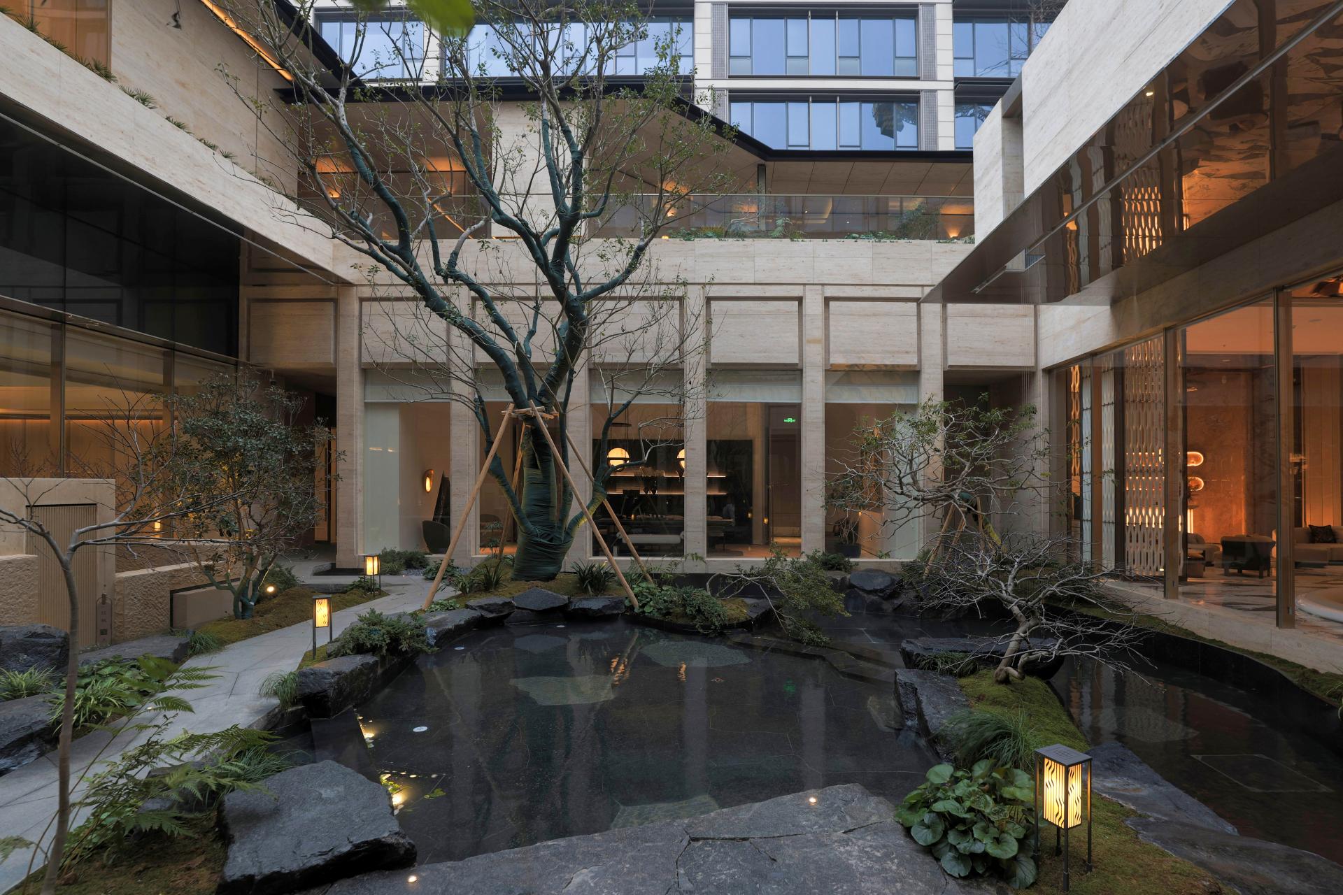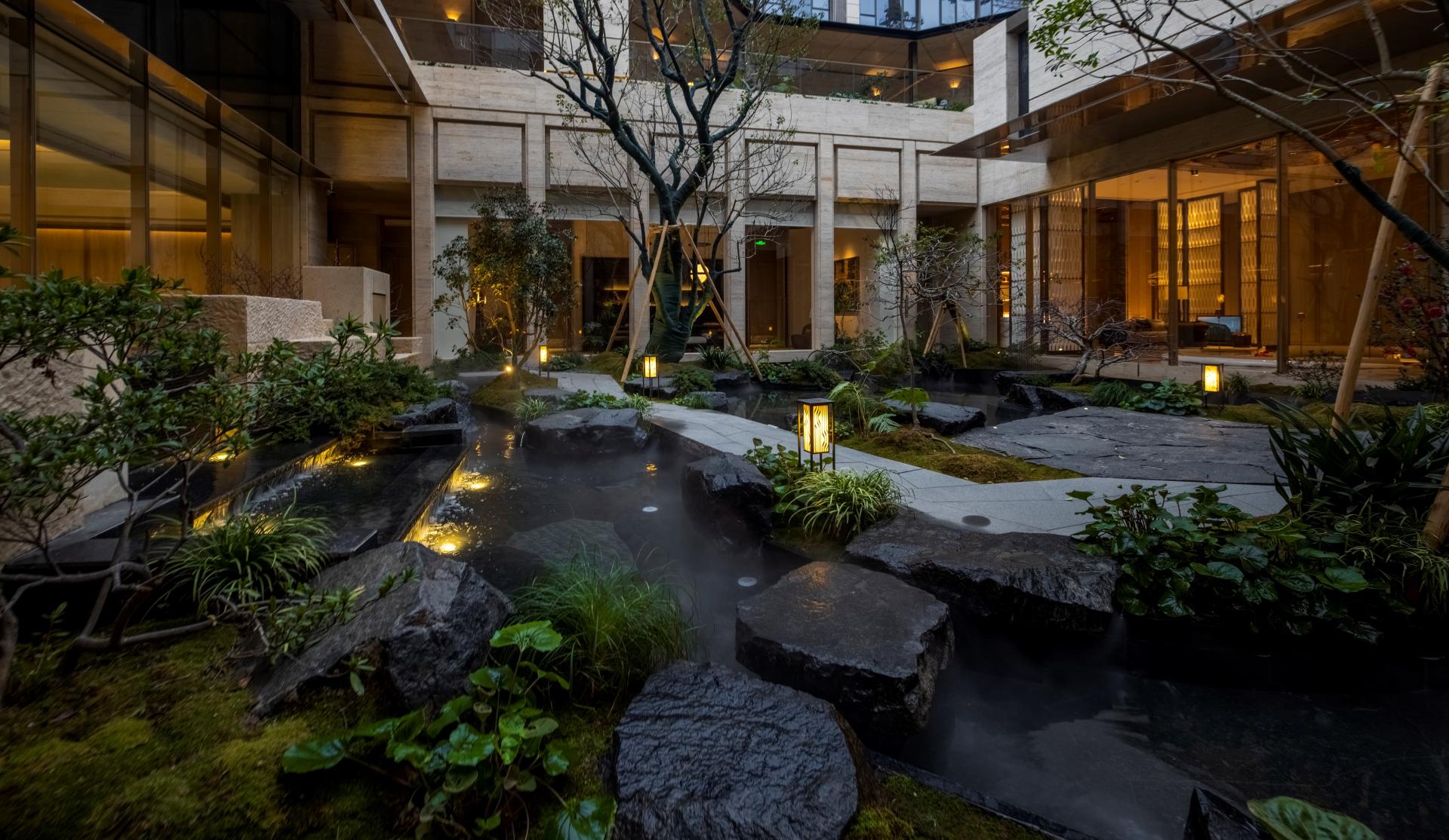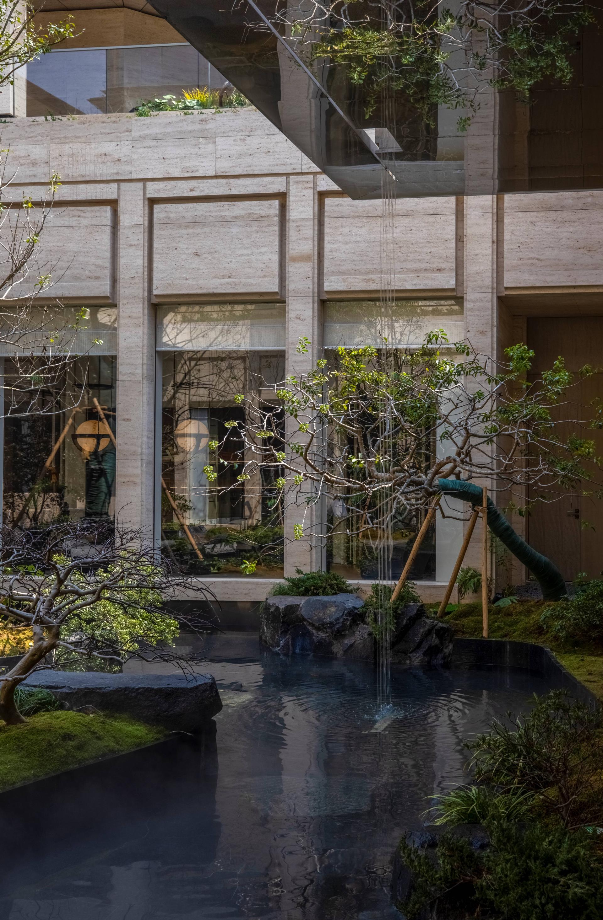 Turning a corner, the vista suddenly opens up, revealing the entire sunken space before one's eyes. The cascading waterfall mirrors the sky's light and clouds' shadows, seamlessly connecting with the negotiation room, extending and blending the indoor and outdoor auras infinitely. The sunken water courtyard encapsulates the nature and life of Baima Lake within this realm. Its layout echoes the form of islands within the lake and lakes within the islands of Baima Lake, abstractly capturing the essence of natural landscapes. With rocks, flowing water, and vegetation as the key elements, the hardness of the rocks harmonizes with the softness of the flowing water and vegetation. Every step taken reveals subtle textures. Attention to minute details elevates luxury into an intangible spatial aura, seamlessly integrated into the site. The water curtain cascading from above connects the sunken courtyard with the upper-level space, forming a tenuous yet meaningful link.