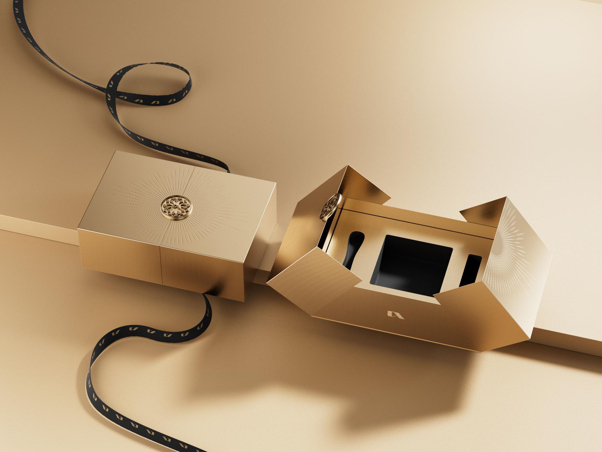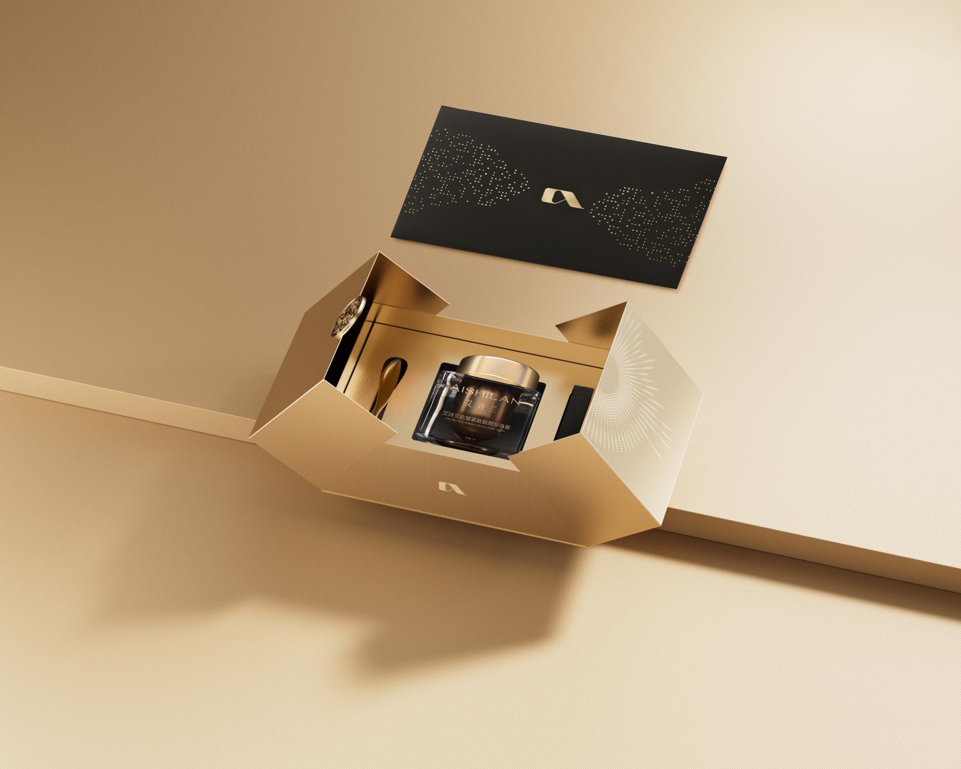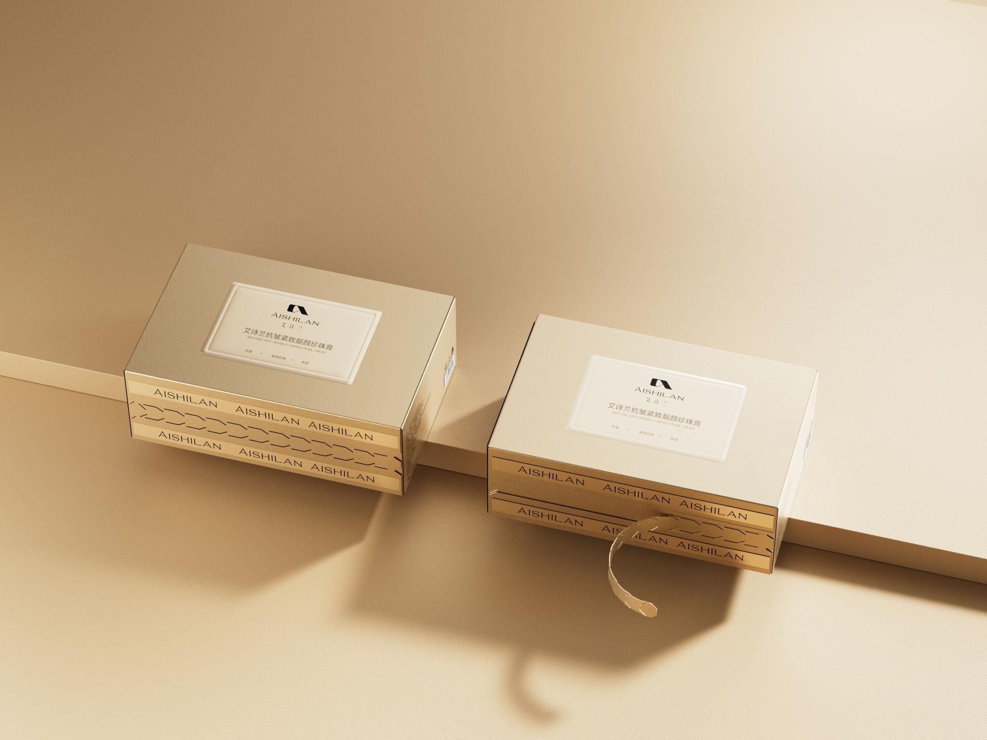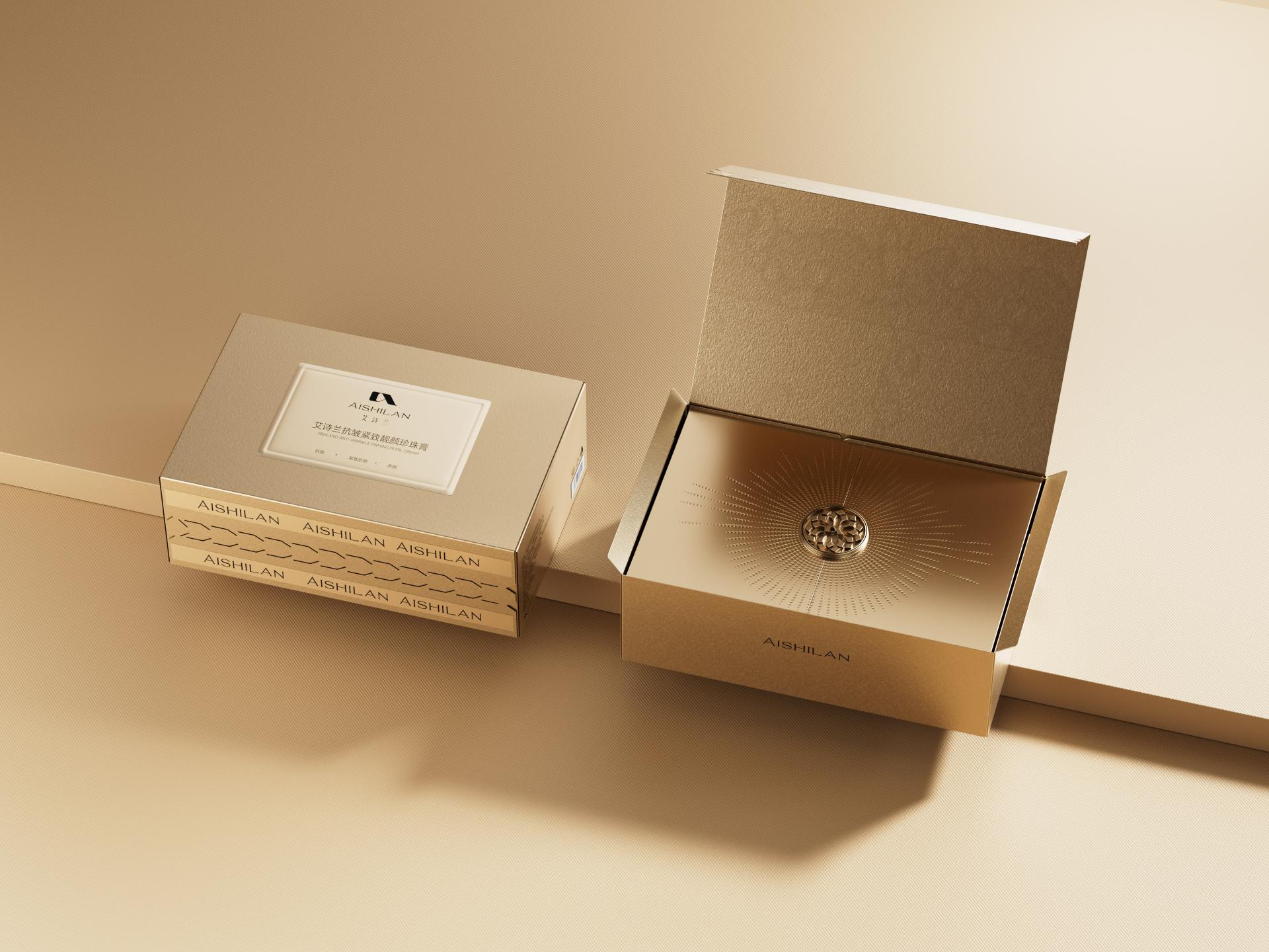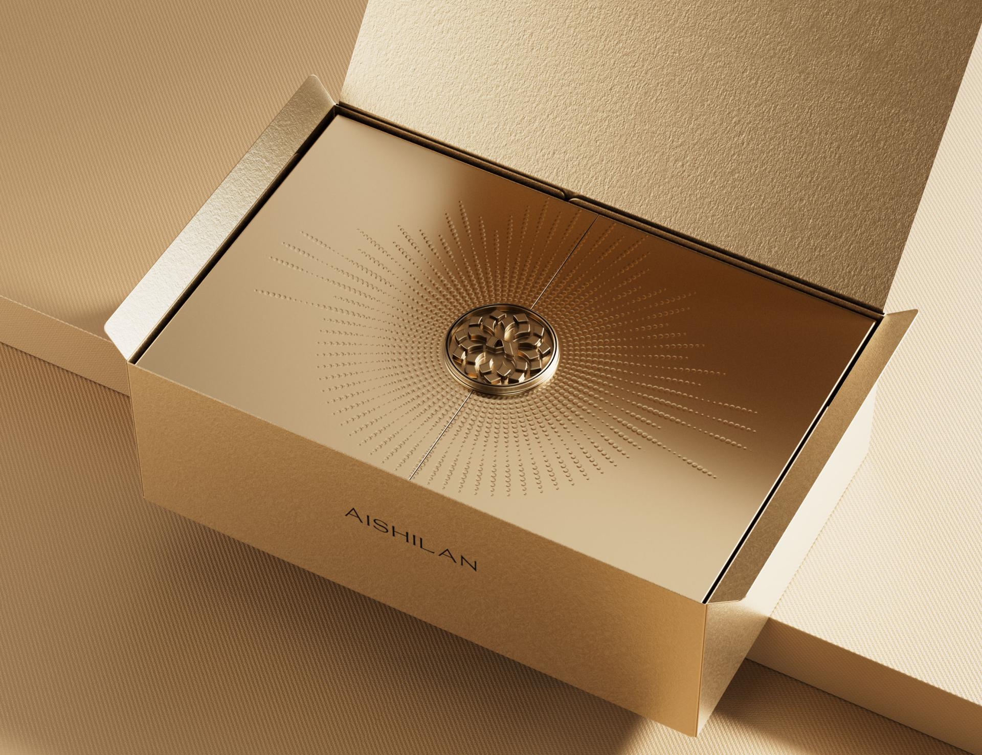 The packaging design introduces two key innovations: an easy-access outer box and a uniquely crafted inner box. The outer box features a side tear strip that simplifies opening and offers anti-counterfeit assurance. This detail turns unboxing into a moment of ritual and delight. Its top panel prominently displays the brand logo, followed by clearly organized product name and key benefits below. Parallel to the side tear strip are two lines of repeating band name “AISHILAN,” reinforcing visual consistency and brand presence. Design ingenuity extends to the inner box. Its top cover features a dimpled texture radiating outward like natural pearl formations, and its dual-flap opening design immediately reveals the product’s exquisite metal finish. Moreover, custom-molded inserts ensure the product and its accessories are securely held in place.