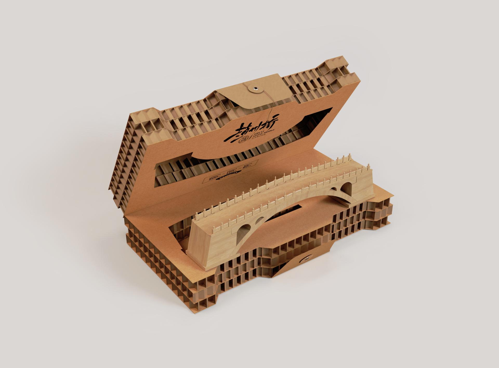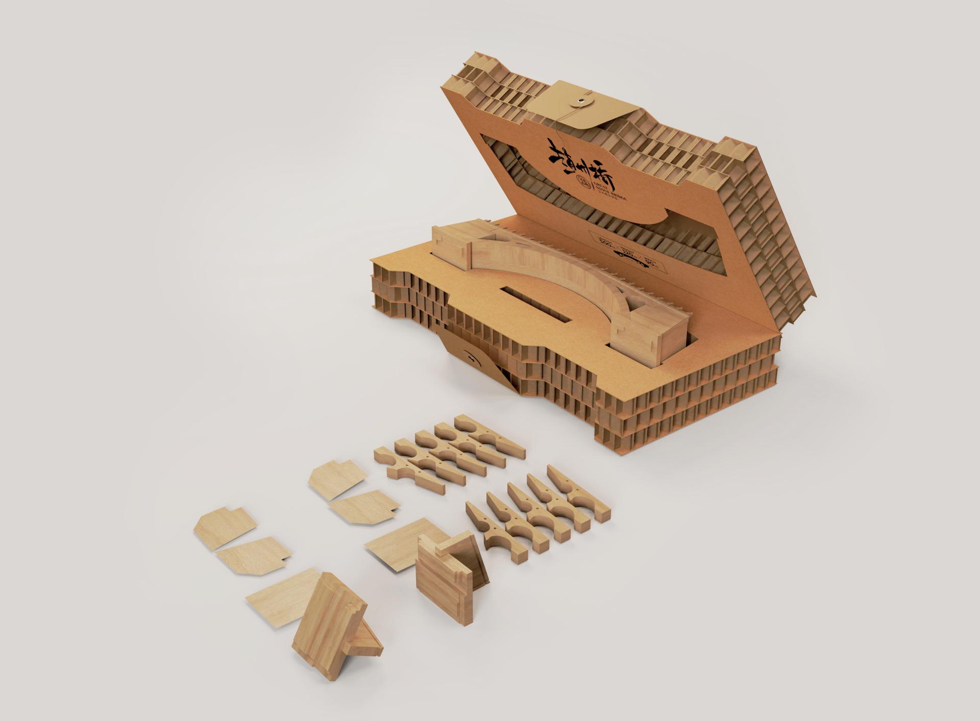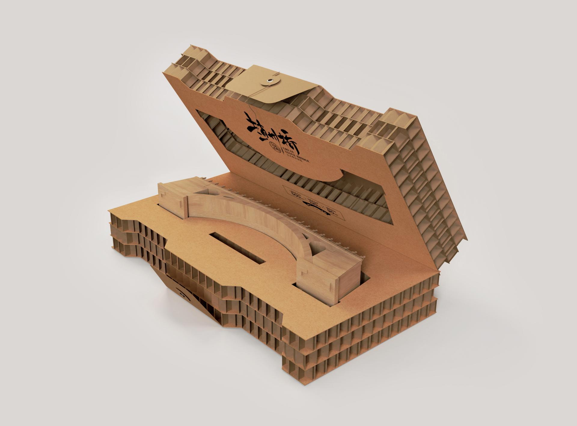 This "Zhaozhou Bridge" creative product integrates traditional Chinese mortise and tenon woodworking techniques with the concept of modular assembling intelligence toys. The packaging is mainly made of coarse honeycomb paperboard, which is carefully selected to match the product's characteristics and ensure sturdiness, providing reliable protection for the internal model. In terms of style, the rustic texture of the coarse honeycomb paperboard complements the ancient charm of the Zhaozhou Bridge, conveying a strong sense of historical heritage. Moreover, the honeycomb paperboard is known for its durability and environmentally friendly nature, which not only echoes the current eco conscious philosophy but also adds a unique memory point and visual impact to the product. The overall package design, meeting the functional need of protection and matching the ancient bridge's charm aesthetically, achieves an organic unity of practicality and beauty.