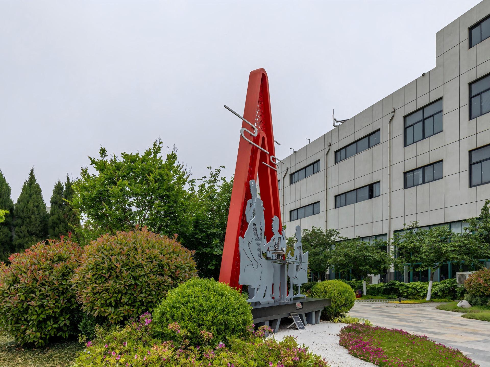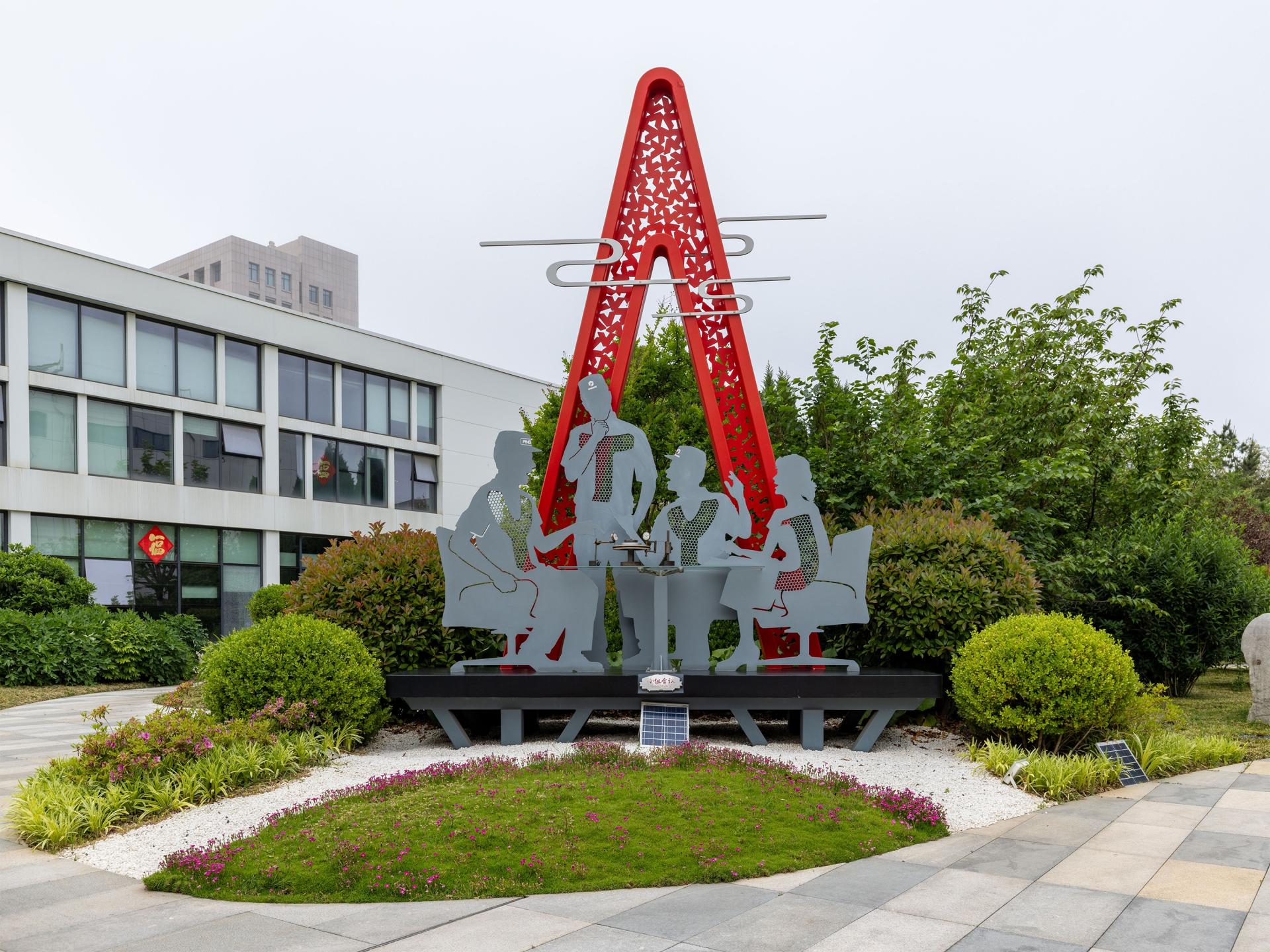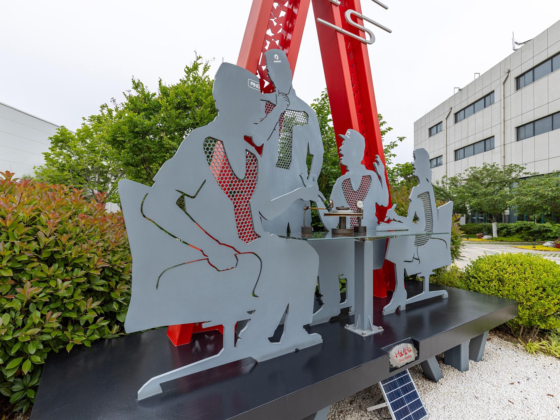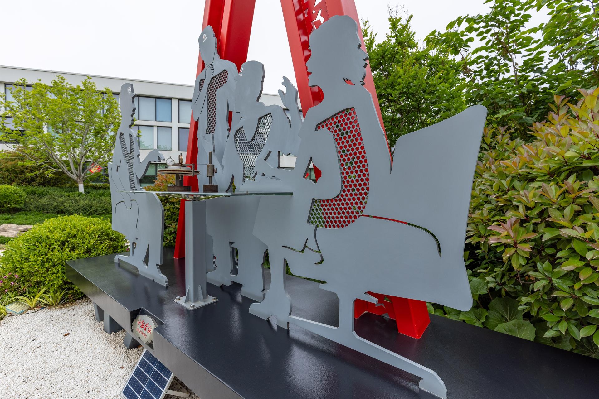 This sculpture features industrial-style silhouette figures as its main visual element. Through dynamic postures such as discussion, listening, reflection, and note-taking, paired with a brake disc inspection device on the tabletop, it vividly recreates the authentic atmosphere of a team meeting. The silhouettes are inscribed with the initials of “Yantai Yijue,” symbolizing the three key principles of such meetings: clear agenda, brainstorming, and decisive action. The background structure draws from the red “human” figure in the Yantai Winhere logo, integrated with auspicious cloud motifs, representing the full potential of individuals, the power of collective intelligence, and the ability of teamwork to overcome challenges. The sculpture incorporates recycled materials including robotic arm trusses, a tempered glass tabletop, and brake discs—highlighting the company’s commitment to green practices and resource reuse. This work stands as a refined integration of technical expertise and creative design.