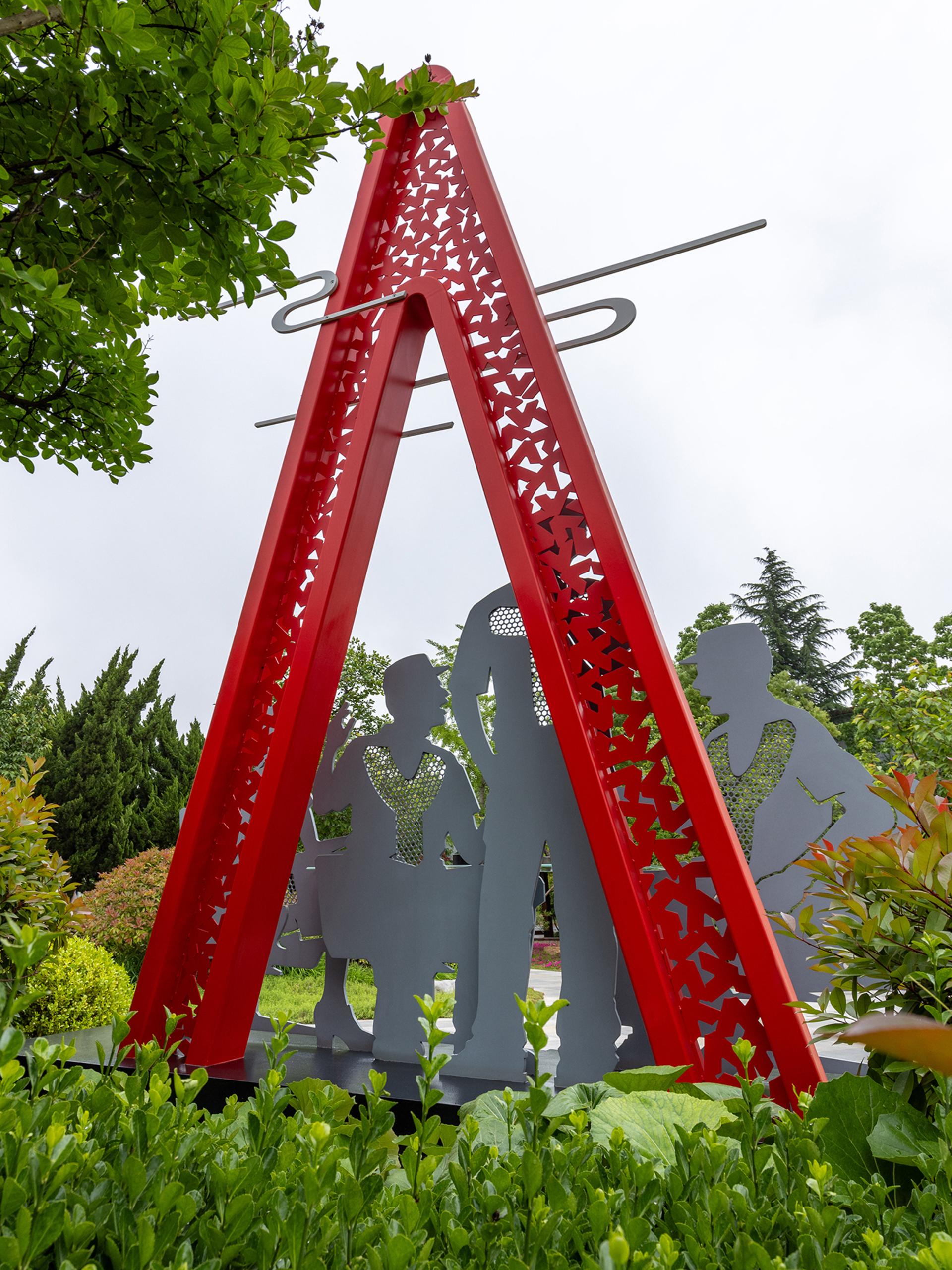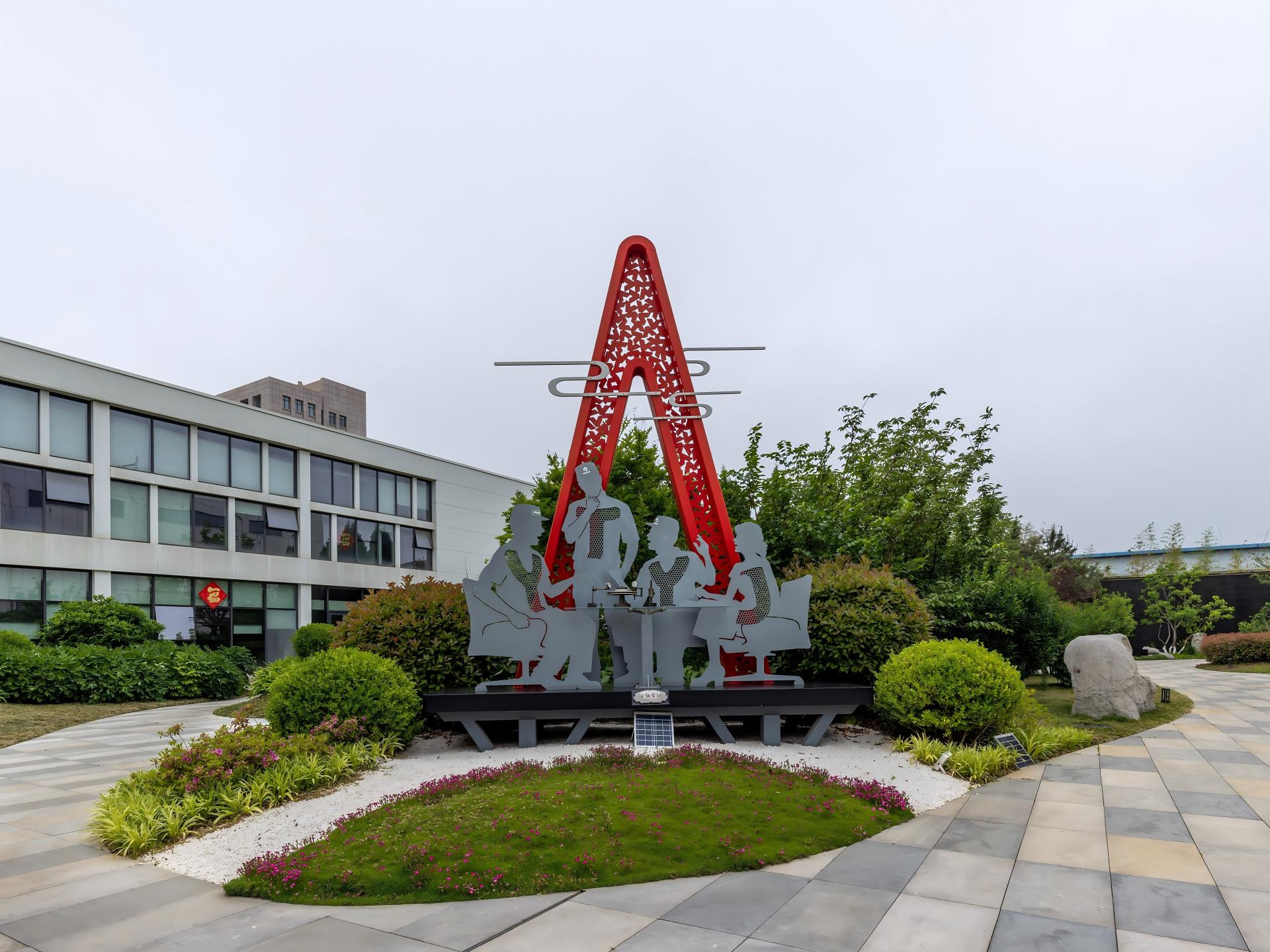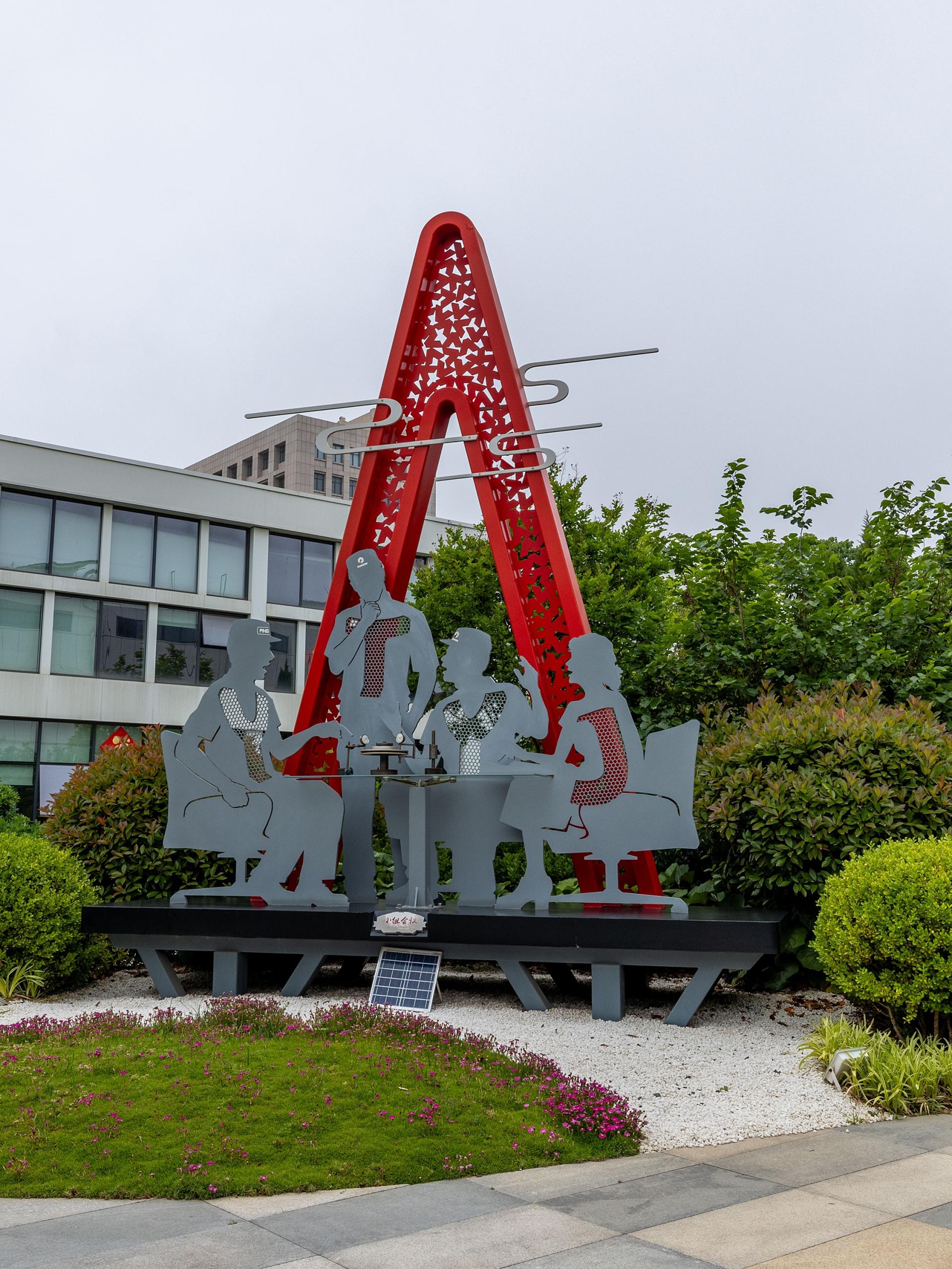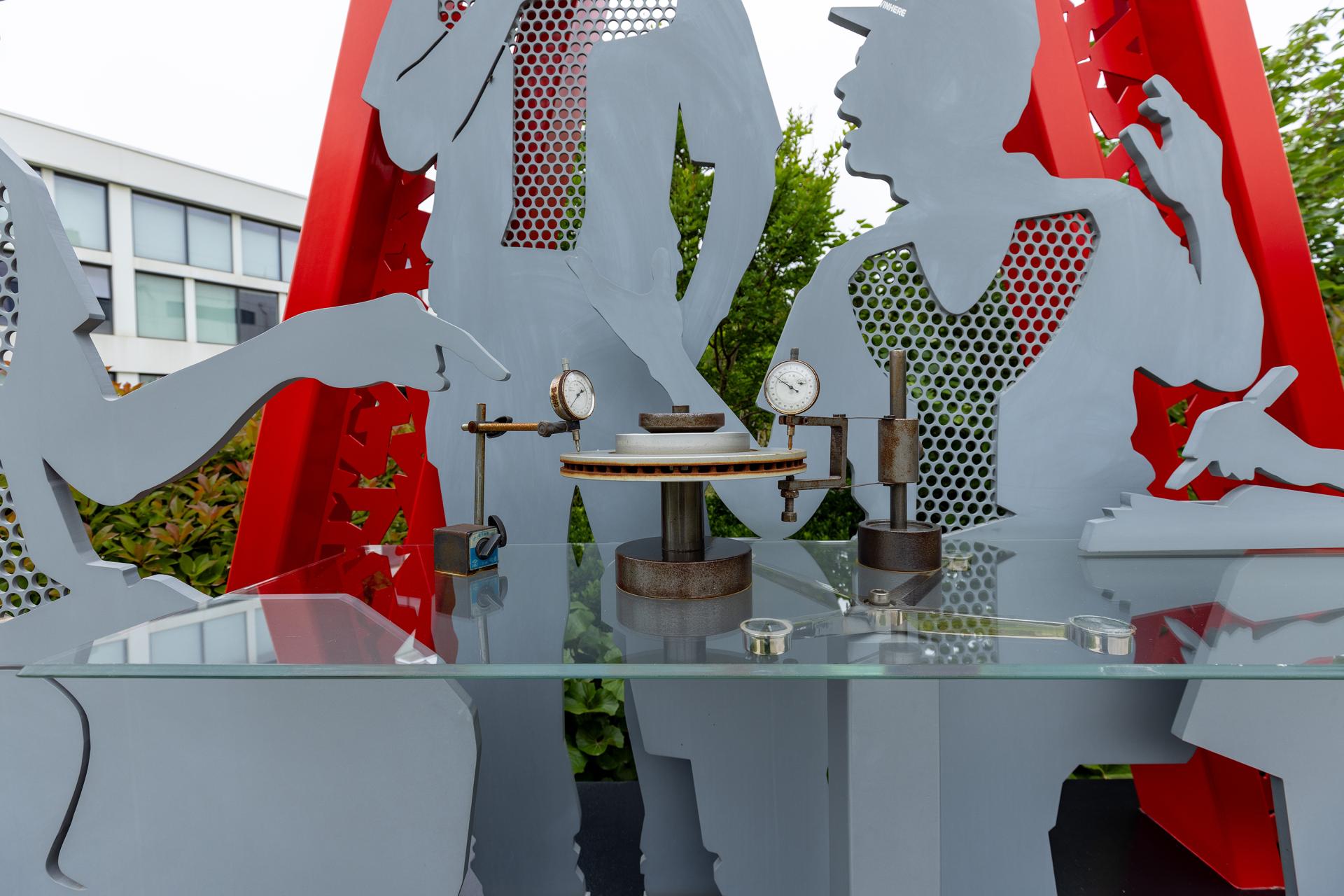 This sculpture features industrial-style silhouette figures as its main visual element. Through dynamic postures such as discussion, listening, reflection, and note-taking, paired with a brake disc inspection device on the tabletop, it vividly recreates the authentic atmosphere of a team meeting. The silhouettes are inscribed with the initials of “Yantai Yijue,” symbolizing the three key principles of such meetings: clear agenda, brainstorming, and decisive action. The background structure draws from the red “human” figure in the Yantai Winhere logo, integrated with auspicious cloud motifs, representing the full potential of individuals, the power of collective intelligence, and the ability of teamwork to overcome challenges. The sculpture incorporates recycled materials including robotic arm trusses, a tempered glass tabletop, and brake discs—highlighting the company’s commitment to green practices and resource reuse. This work stands as a refined integration of technical expertise and creative design.