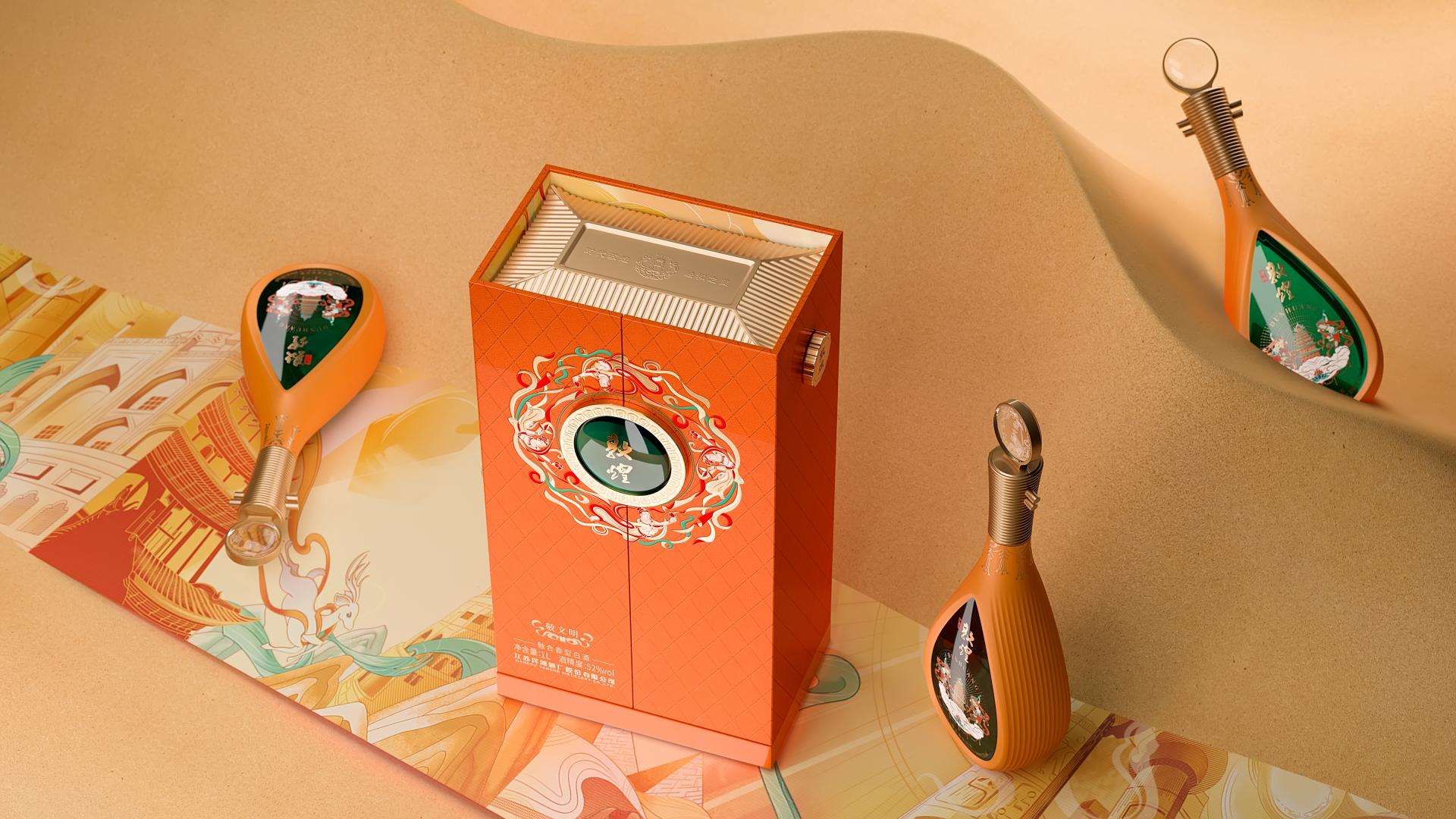 The gift box, adorned in “Dunhuang Orange,” features a front panel inlaid with a colored crystal sphere that mirrors the bottle’s cap, representing the radiant union of the four great ancient civilizations across time and space.