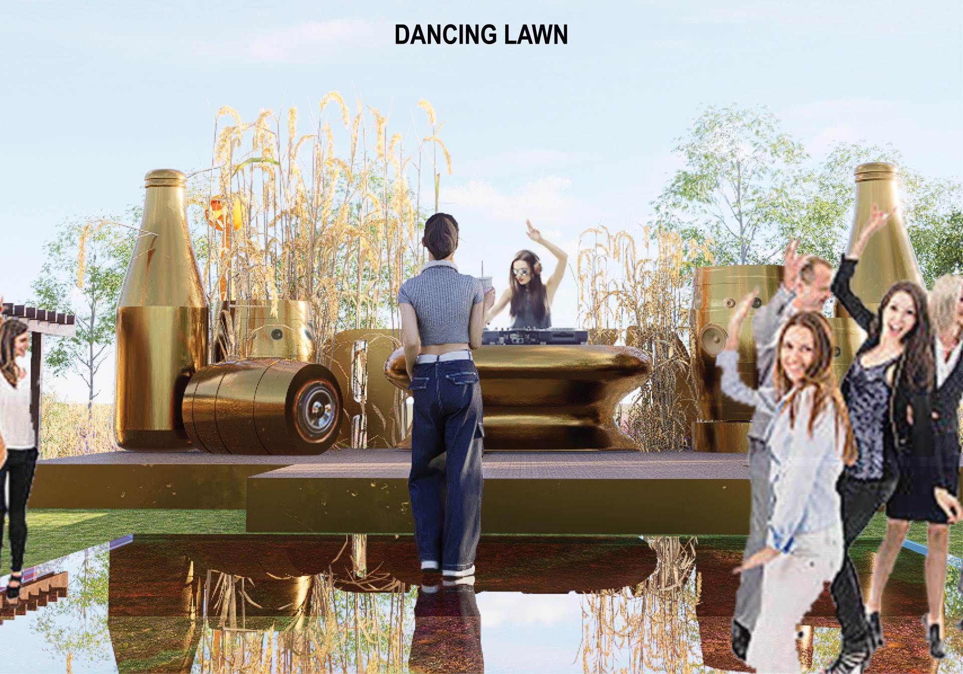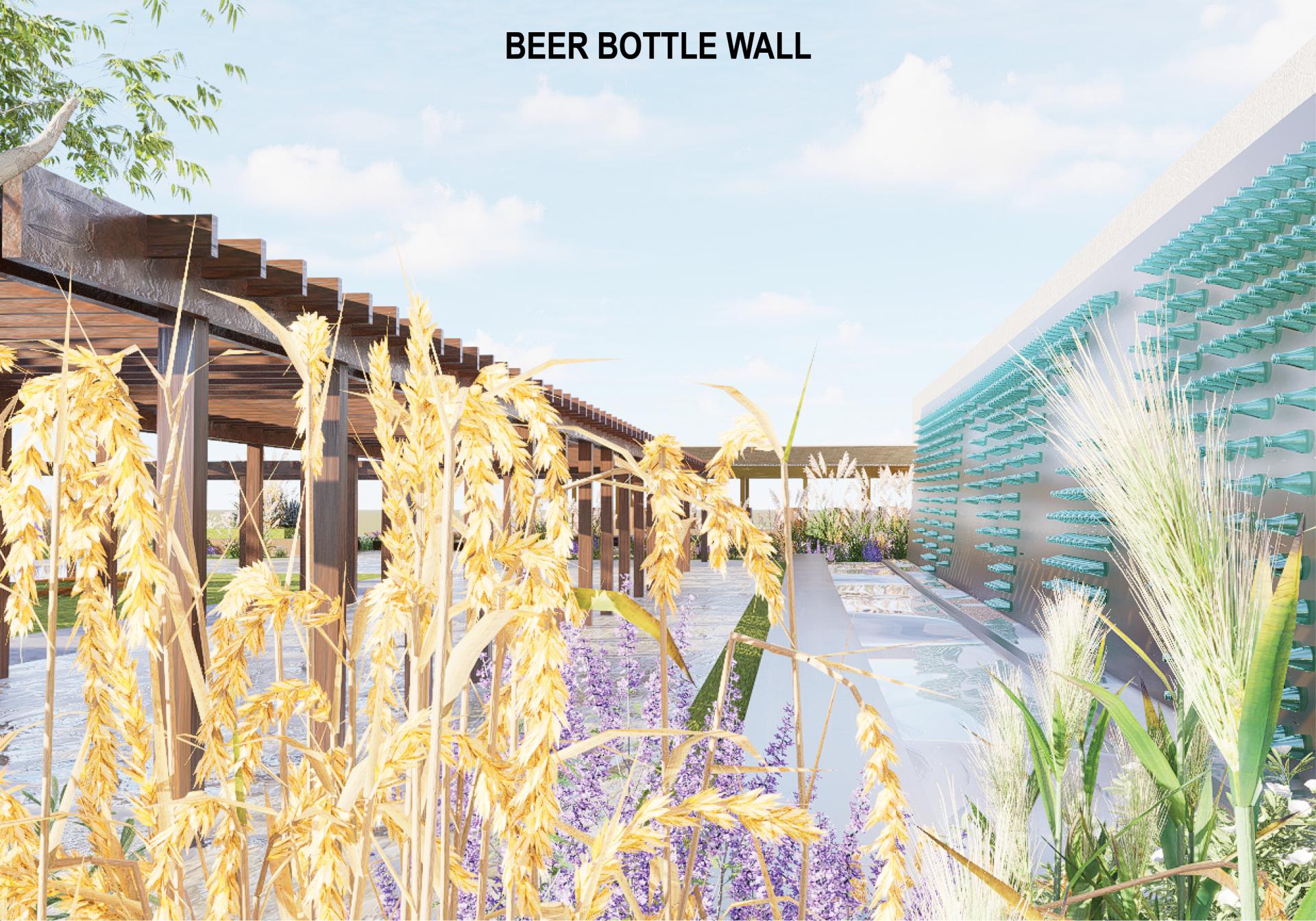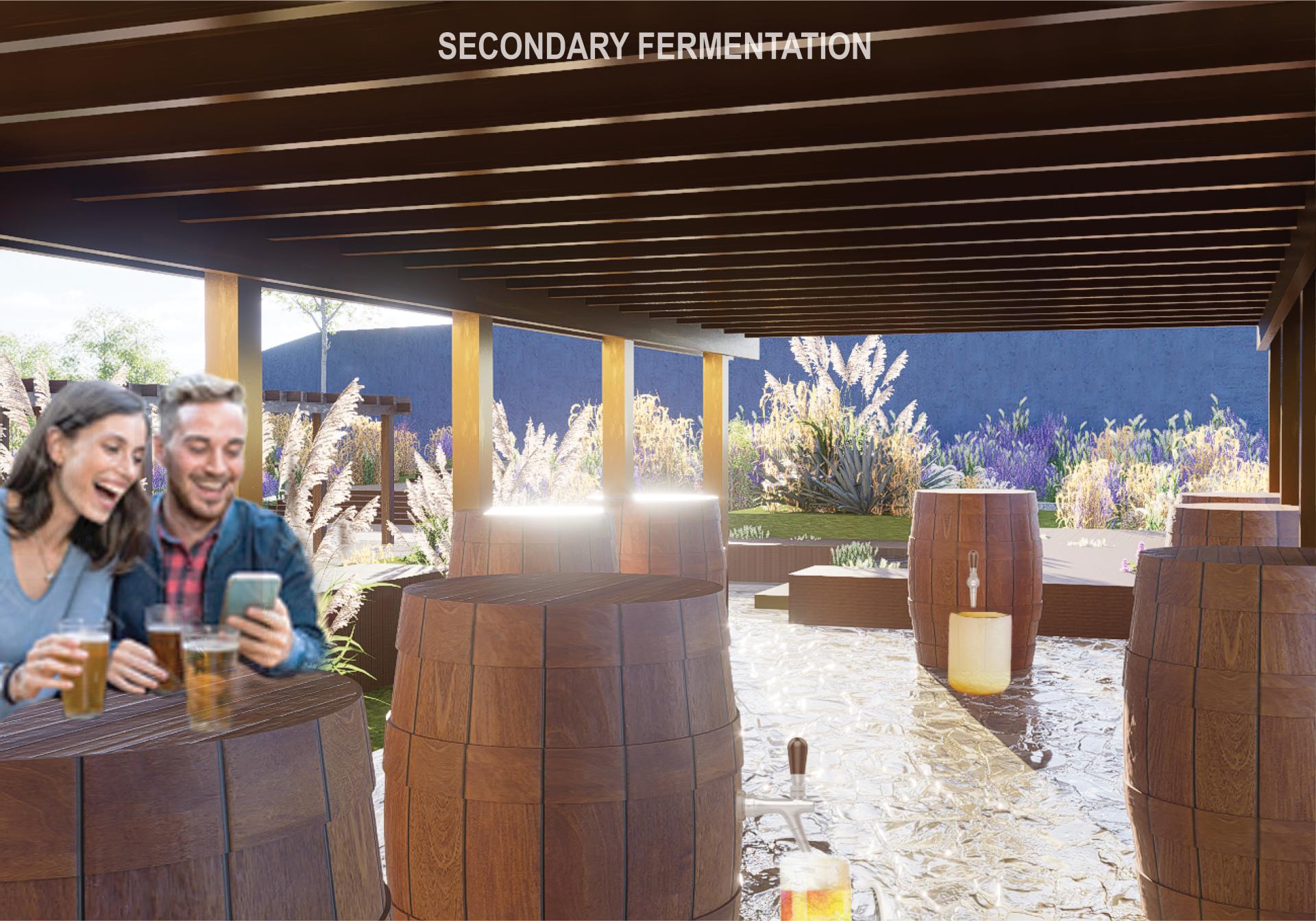 A signature copper gateway frames the entrance, behind which a DJ can perform during festivals, activating the plaza as a vibrant celebration space. A beer bottle water wall, tasting areas, and a natural fermentation pavilion invite the community to engage with the brewing culture through sight, sound, and scent.