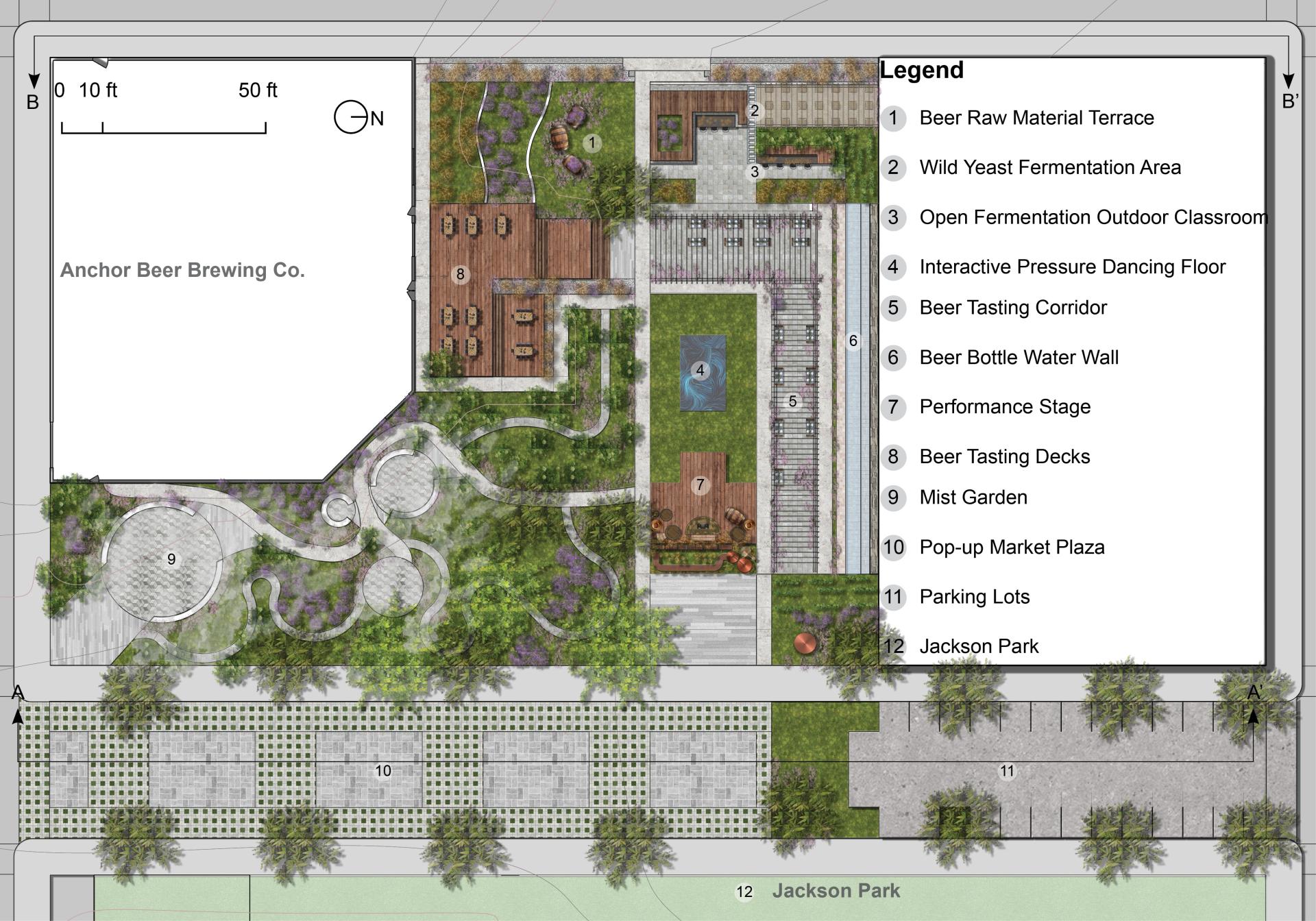 The Beer Brewing Fermentation Garden draws inspiration from Anchor Brewing Company’s iconic and traditional beer-making process. Celebrated for its copper boiling kettles and open fermentation method, Anchor’s approach highlights craftsmanship rarely seen in modern brewing. Copper’s excellent heat conductivity ensures even boiling of raw ingredients, while the open fermentation tanks—exposed to San Francisco’s unique climate—create distinctive flavors only achievable in this specific microclimate.