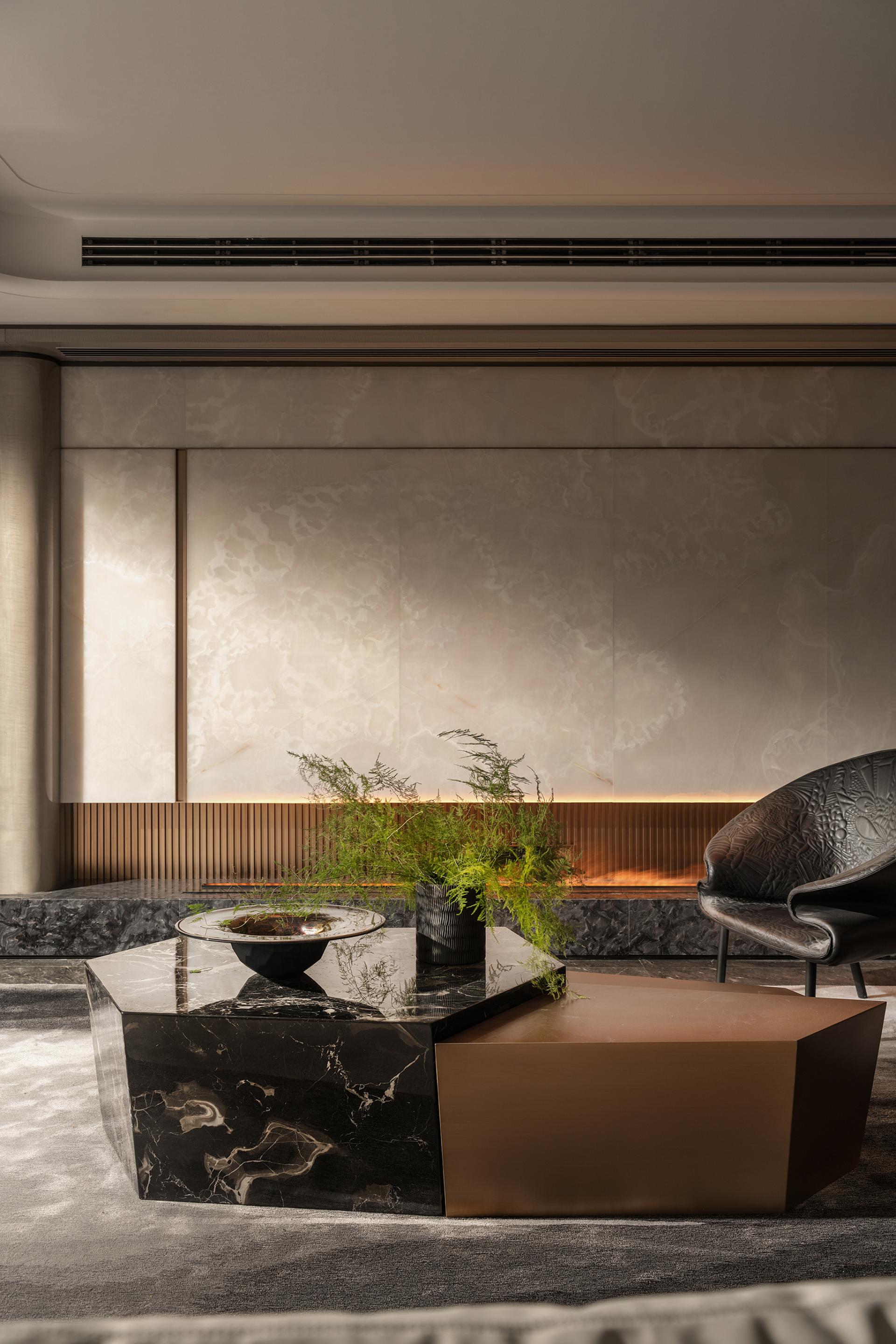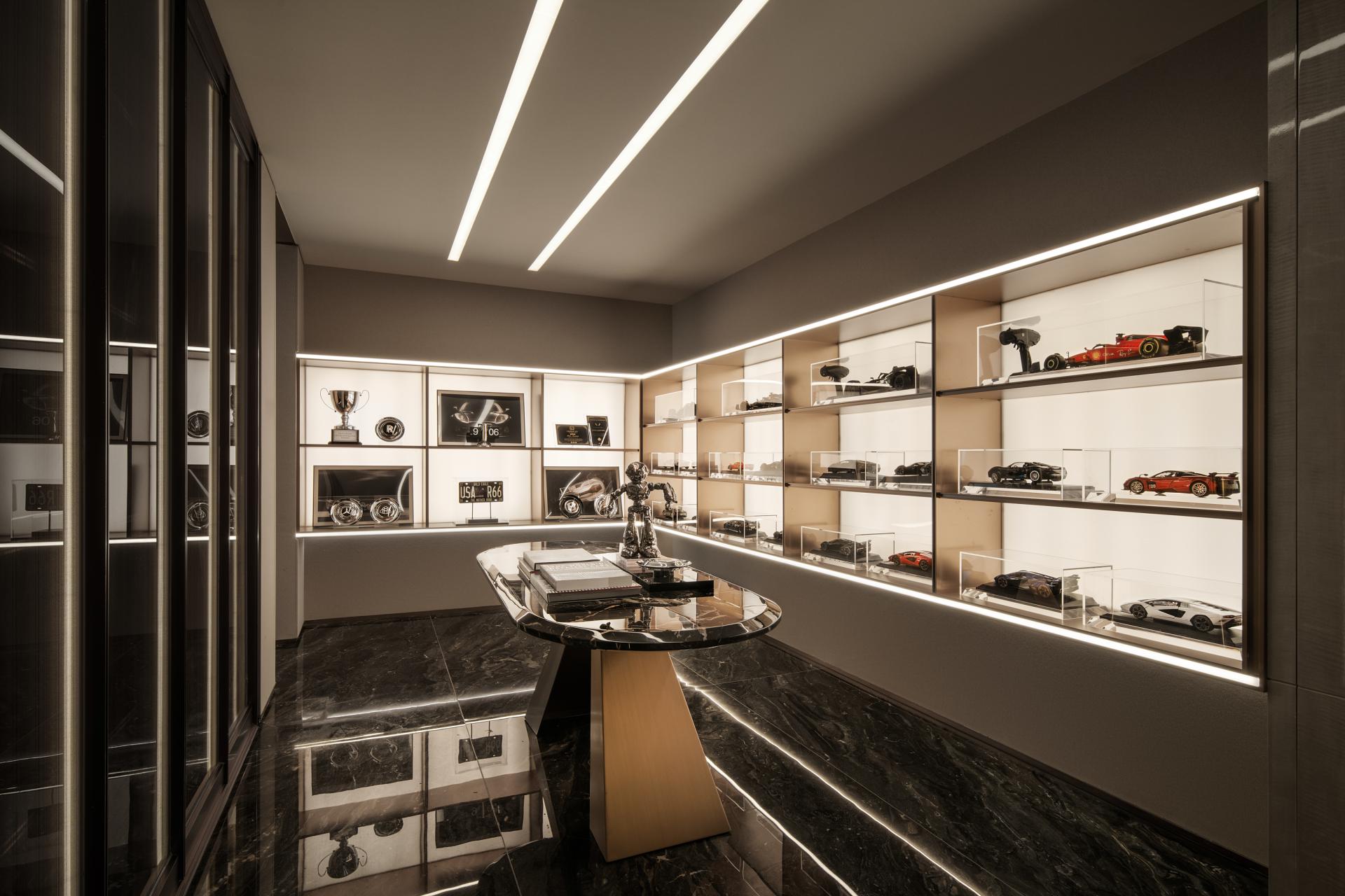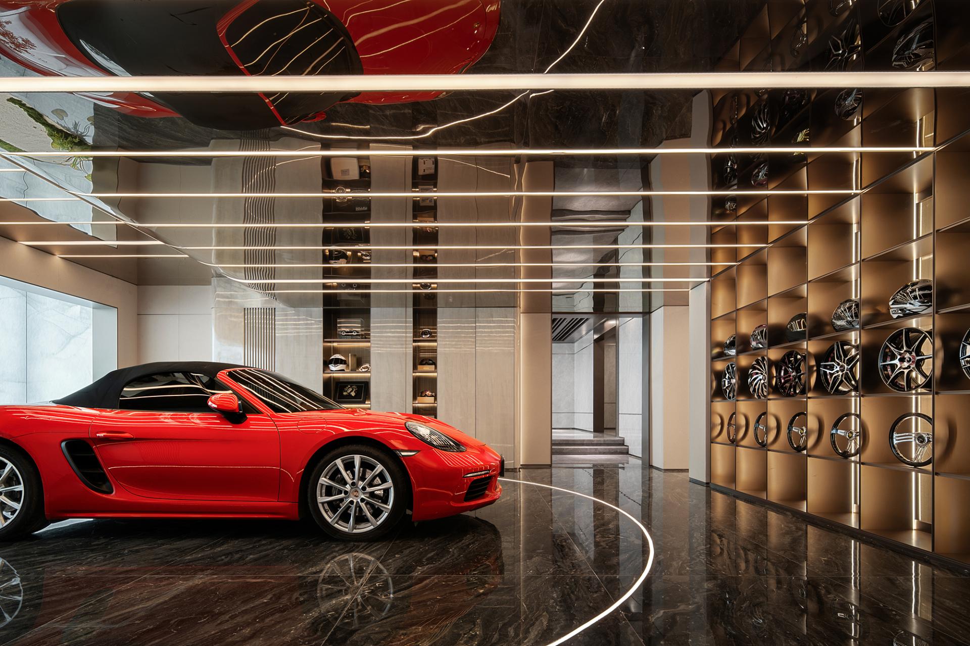 Abandon the redundant decorations, the use of clean lines and white to speak of the beauty of the modern Orient, emerald green embellished table ornaments. The study is used as a collection cabinet to hide the elegance of the ancient literati, and the silk paper-like texture is used as a background to set off the elegance. The bedroom's delicate relief lines carve out a flowery scene, blending traditional art with modern life. The wide corner window offers a panoramic view of the outdoor garden, which can be used as a reading area or a wine-tasting area to satisfy the different preferences of the family. Integrating living room, collection room, wine cellar and parking garage, the basement presents a multi-functional entertainment space. Lightly embellished with Chinese elements, the overall modern style is more inclined to the Western style, and the dynamic posture of curved corners connects with the pleasant and self-compatible state of life, and the red carpet sets off a white and elegant atmosphere. The garage is constructed with straight and rational lines to create a sense of futuristic space, and the mirror reflection brings a sense of avant-garde. The owner can either park his car or collect models for viewing at any time.