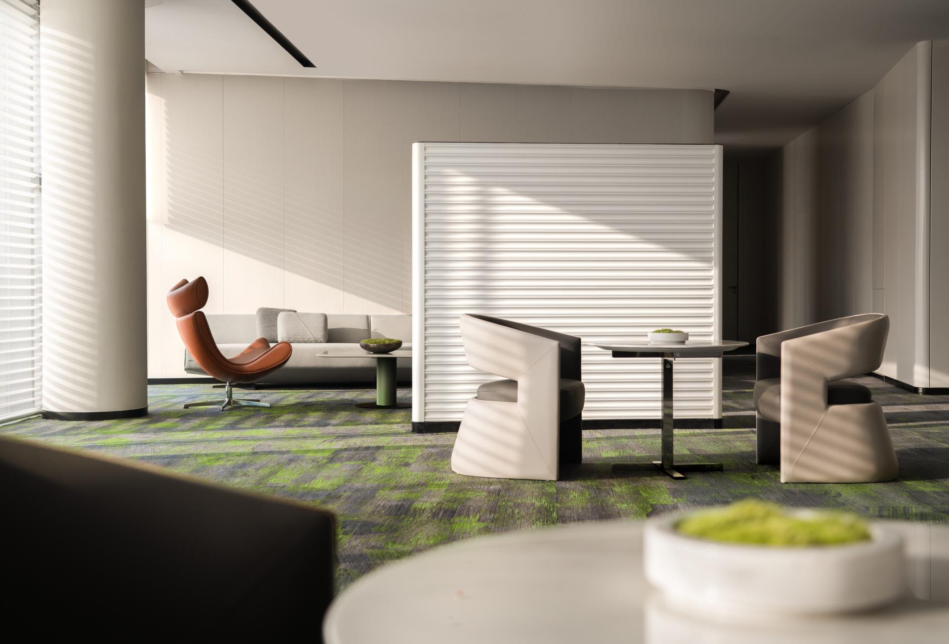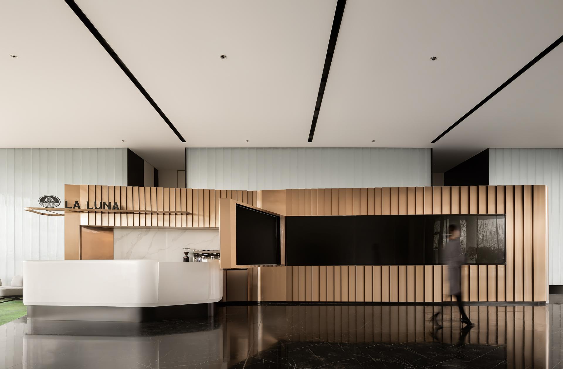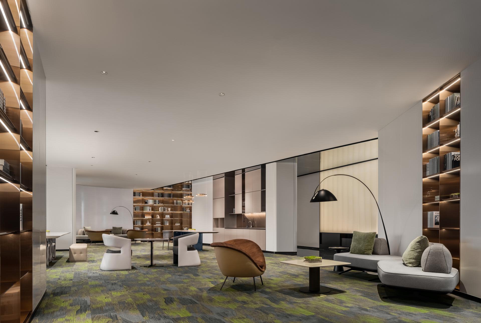 At its core, the design aims to break down boundaries—between work and leisure, digital and physical, architecture and landscape. The first floor revolves around a circular exhibition core, where Yuesheng’s in-house café brand, LALUNA, anchors a fluid system of modular zones. Each spatial unit—whether for reading, meetings, casual talks, or product showcases—can be rhythmically reorganized, supporting one-time design with lifetime usability.