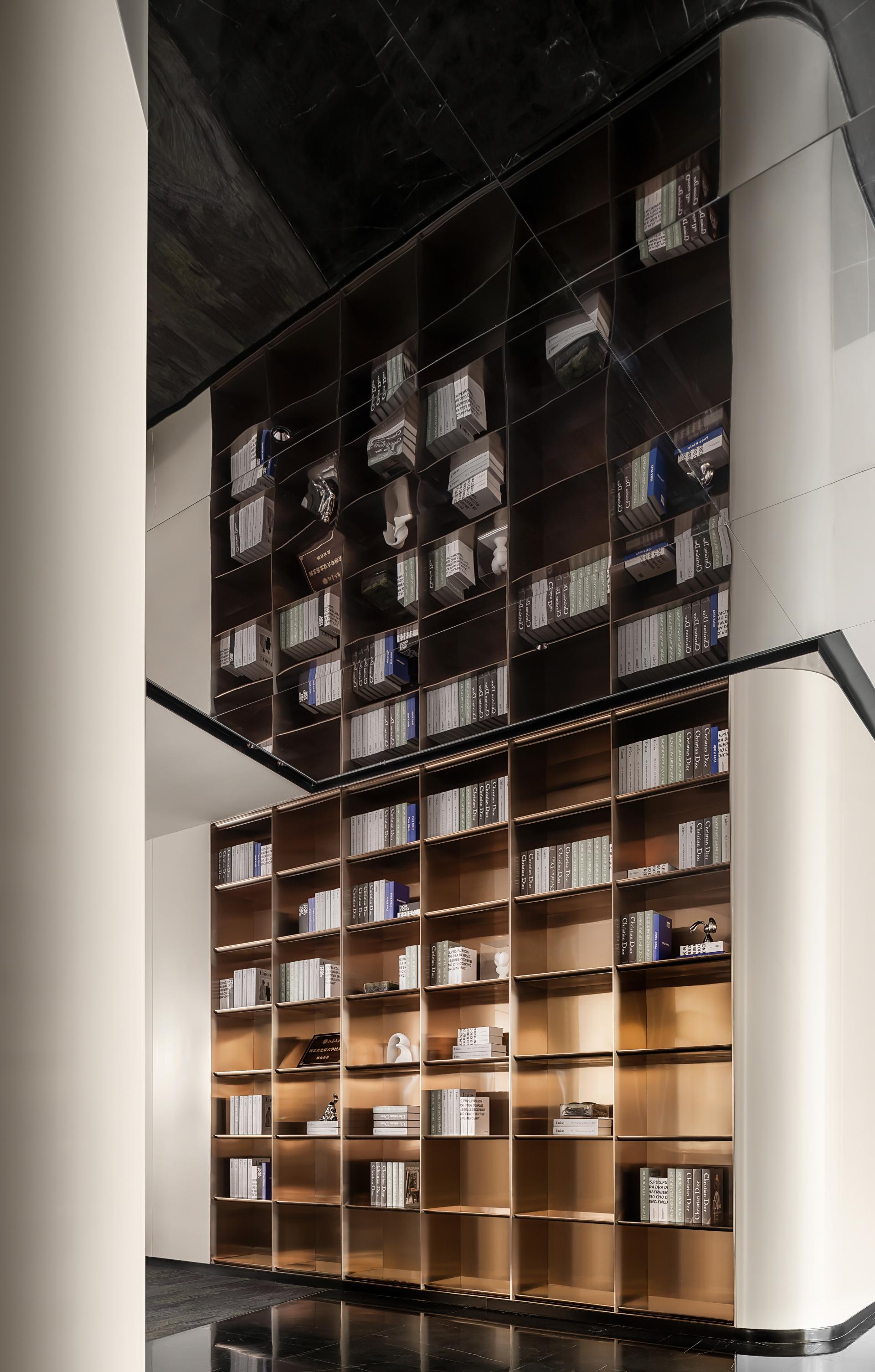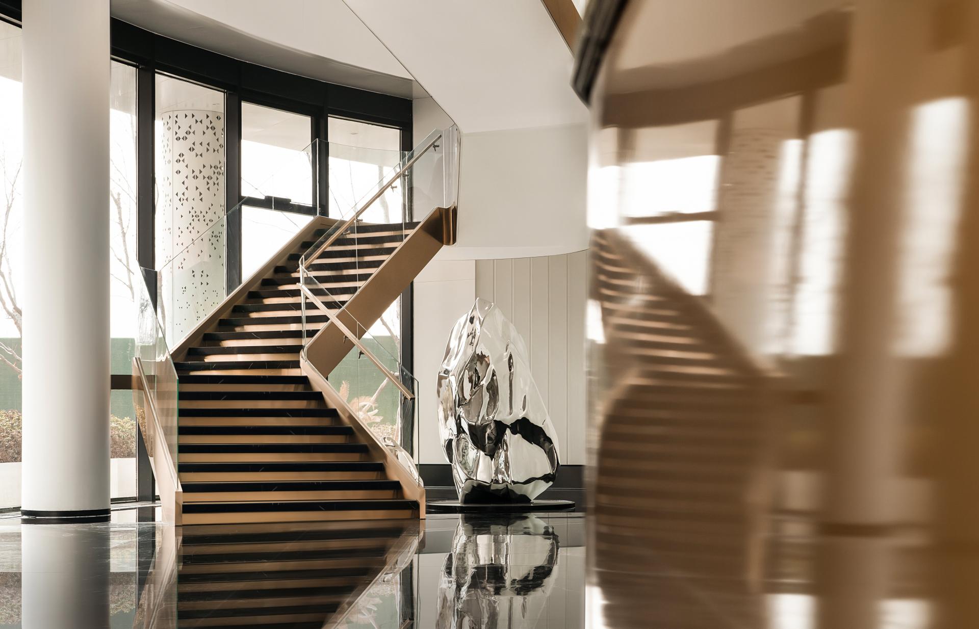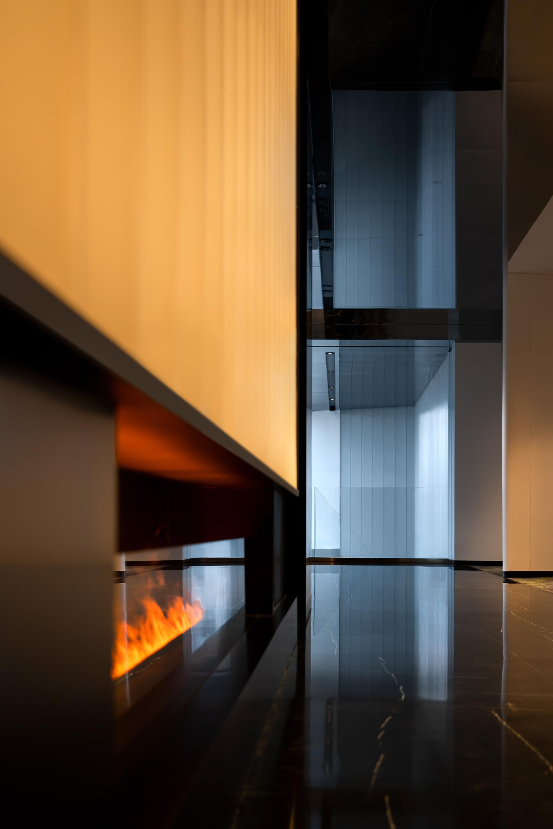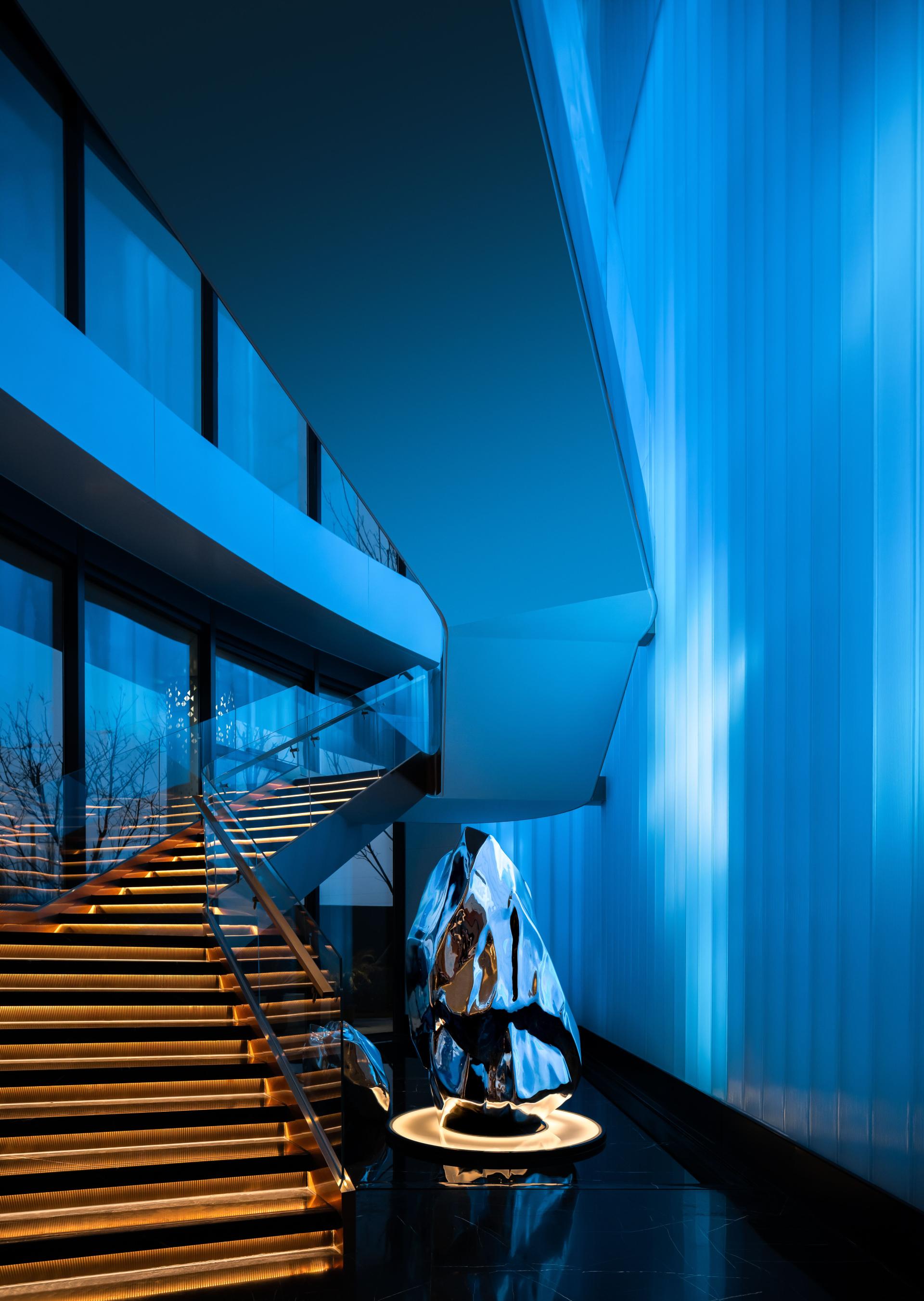 Material and lighting choices amplify experiential depth. Polished black stone floors mirror light and structure, creating a visual fluidity across levels. Sculptural white structural columns lend a monumental rhythm, while a dramatically lit cobalt-blue staircase transforms vertical movement into a performative moment. Customized elements such as linear pendant lights and integrated shelving express both aesthetic restraint and spatial identity.