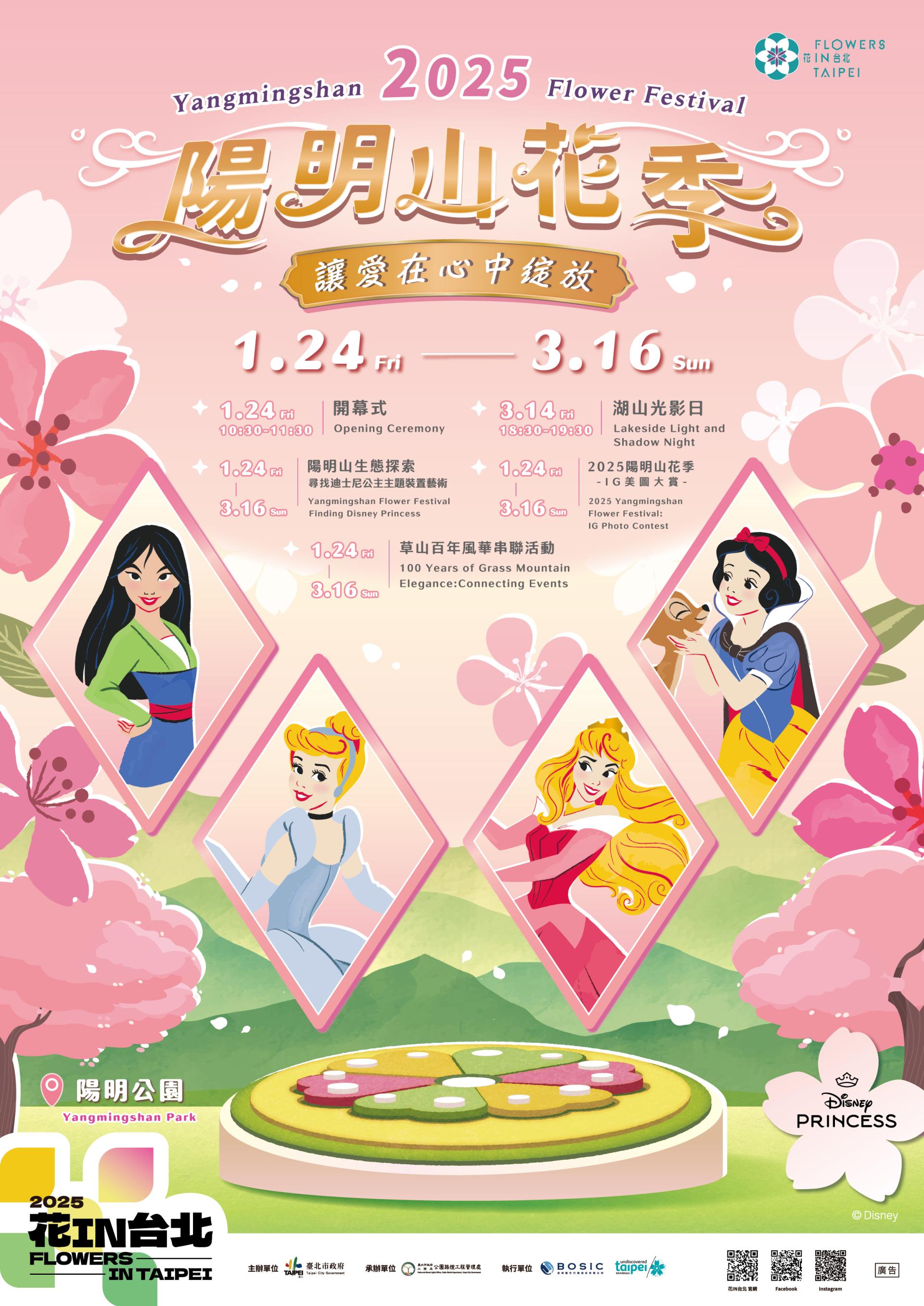 The 2025 Yangmingshan Flower Festival will be held from January 24 to March 16, 2025, lasting for 52 days. It is one of Taipei’s most important annual floral events. This year, the festival’s theme is "Let Love Blossom in Your Heart", and for the first time, the event features a collaboration with the Disney Princess series, introducing four major themed installations featuring classic characters like Snow White, Cinderella, and Princess Jasmine.