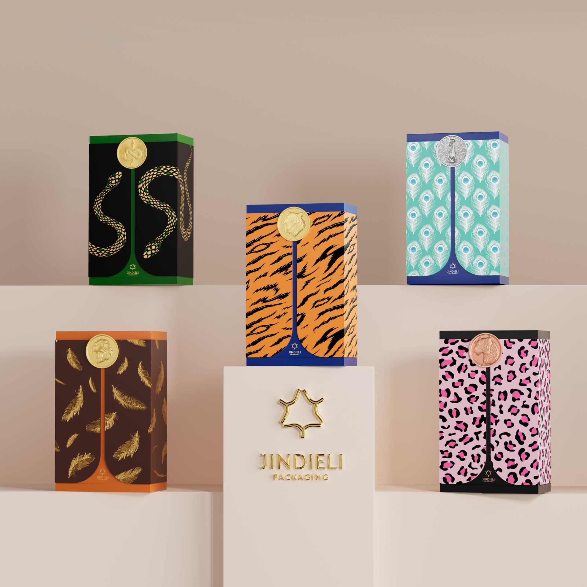 与常规设计不同,我们突破单一美学表达,将自然野性与品牌文化内涵与香水的狂野调性融合:蛇纹诠释神秘蜕变、羽毛象征自由灵性,虎纹、豹纹彰显勇气力量,孔雀彰显大方美丽,借包装传递精神共鸣。
