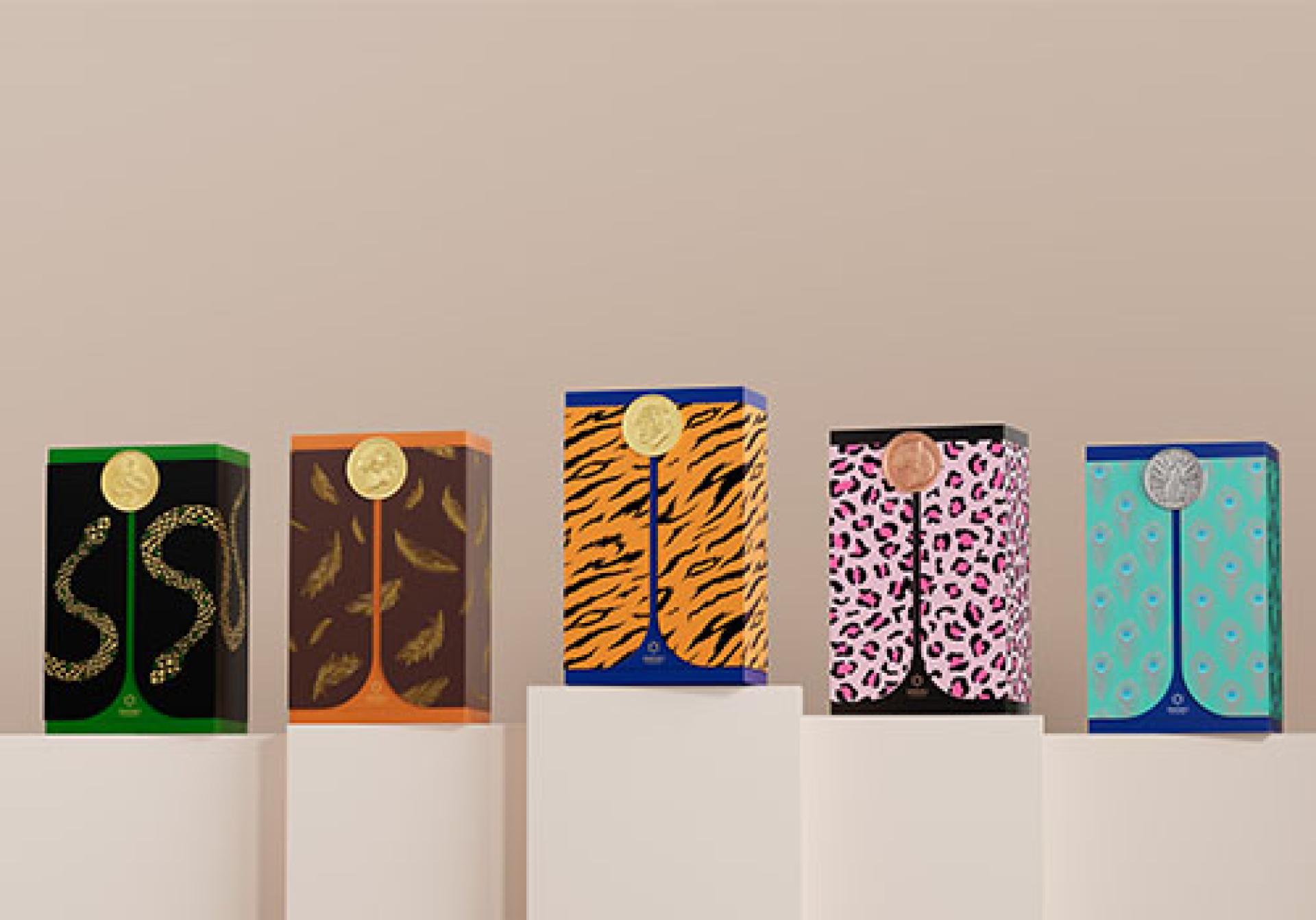 本系列香水包装以自然野性图腾为核心灵感,运用蛇、膺、虎、豹、孔雀等自然符号,融合现代艺术设计语言。