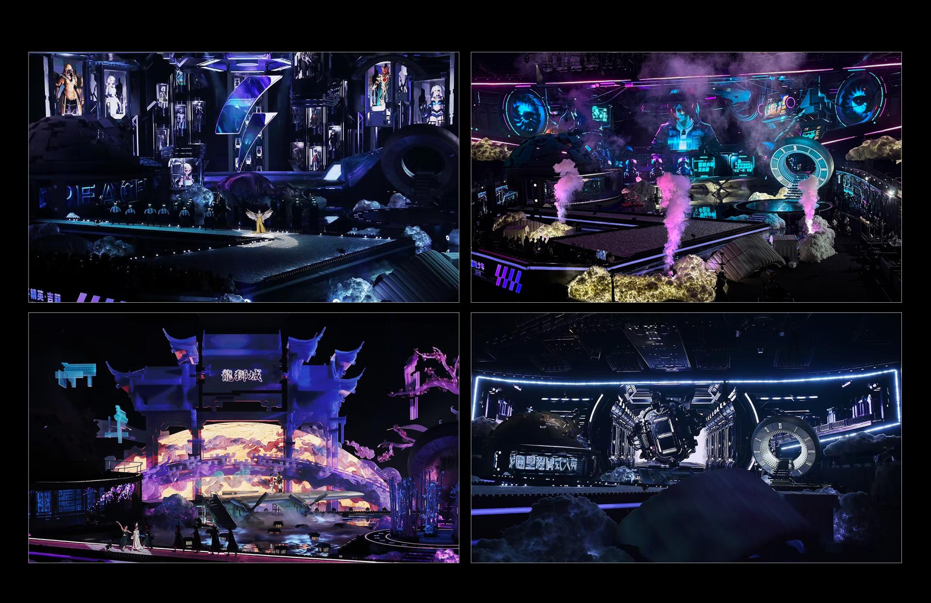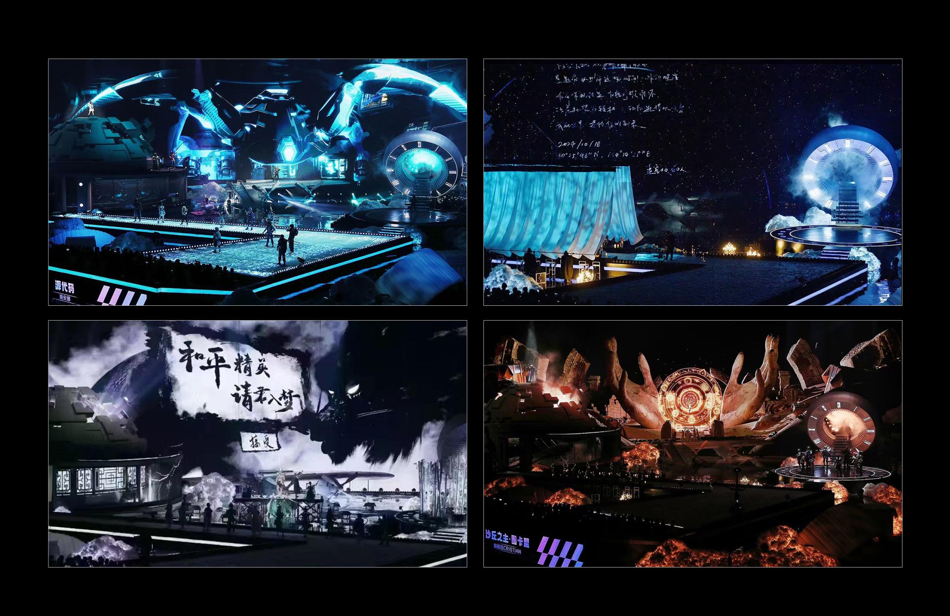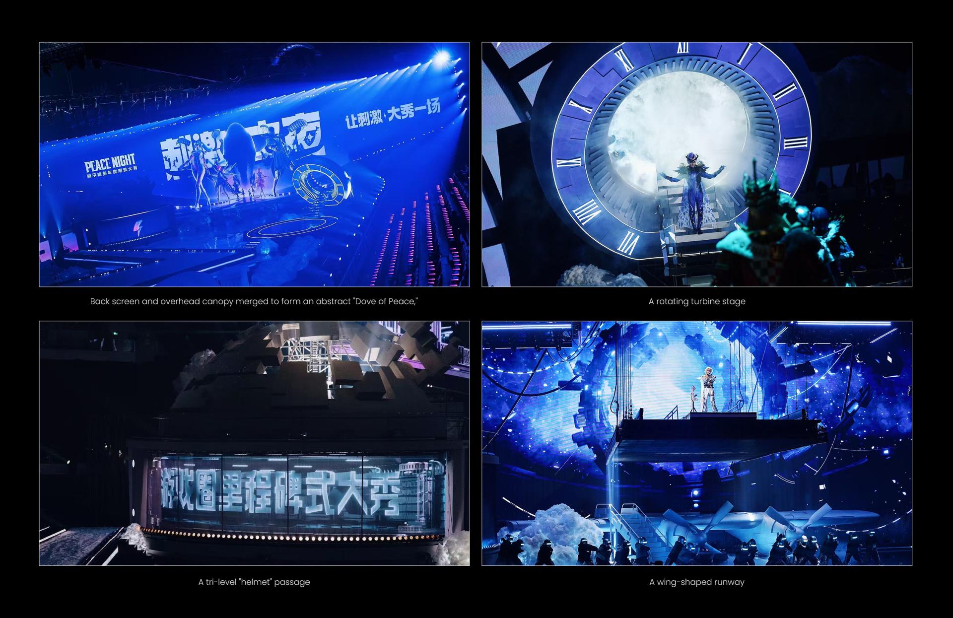 In an era where gaming and reality increasingly intertwine, "Peace Night 2024–Game of Peace Fashion Show Stage," themed 'The Descent,' created an immersive, ceremonial space that shattered the boundary between dimensions. By transplanting core symbols from the game world into reality, the project leveraged deconstructivist spaces, dynamic mechanical installations, and digital media to deliver an unprecedented immersive experience, setting a new benchmark for esports stage design. We deconstructed and reassembled the iconic elements of Game of Peace, employing a new spatial language to narrate a story of virtual-real fusion. The CNC-controlled overhead screens, capable of a full 180° rotation, worked in coordination with robotic arms and lifting platforms to create the visual spectacle of characters "descending from the sky." This dynamic stage, which defies physical boundaries, represents a rare "aerial media language" in the industry—serving as both a fashion runway and a real-world extension of the game universe. Built on a deconstructivist framework, the stage transformed hardcore in-game symbols like the Level 3 Helmet, aircraft wings, and airdrop crates into futuristic geometric installations. The back screen and overhead canopy merged to form an abstract "Dove of Peace," enveloping the main stage and symbolizing a spirit of peace that transcends competition. The space was fragmented into multiple dimensions: a rotating turbine stage, a tri-level "helmet" passage, and a wing-shaped runway. Augmented by holograms, water mist, and light matrices, these elements transformed the stage into a traversable and interactive immersive environment. The stage's modular design allowed for rapid scene changes based on performance requirements, creating a highly efficient system for all stakeholders. For performers, elements such as the multi-level structure, lifting platforms, rotating stage, and holographic passages greatly expanded their creative space and expressive potential. For the audience, a central runway and immersive layout ensured an optimal viewing experience from every seat, enhanced by striking visual highlights — the "celestial descent" opening, "sky ladder" transition, and "epic ensemble" finale — that delivered powerful sensory impact. For the production team, modular standardization and intelligent mechanical integration improved efficiency and control while significantly simplifying setup and maintenance.