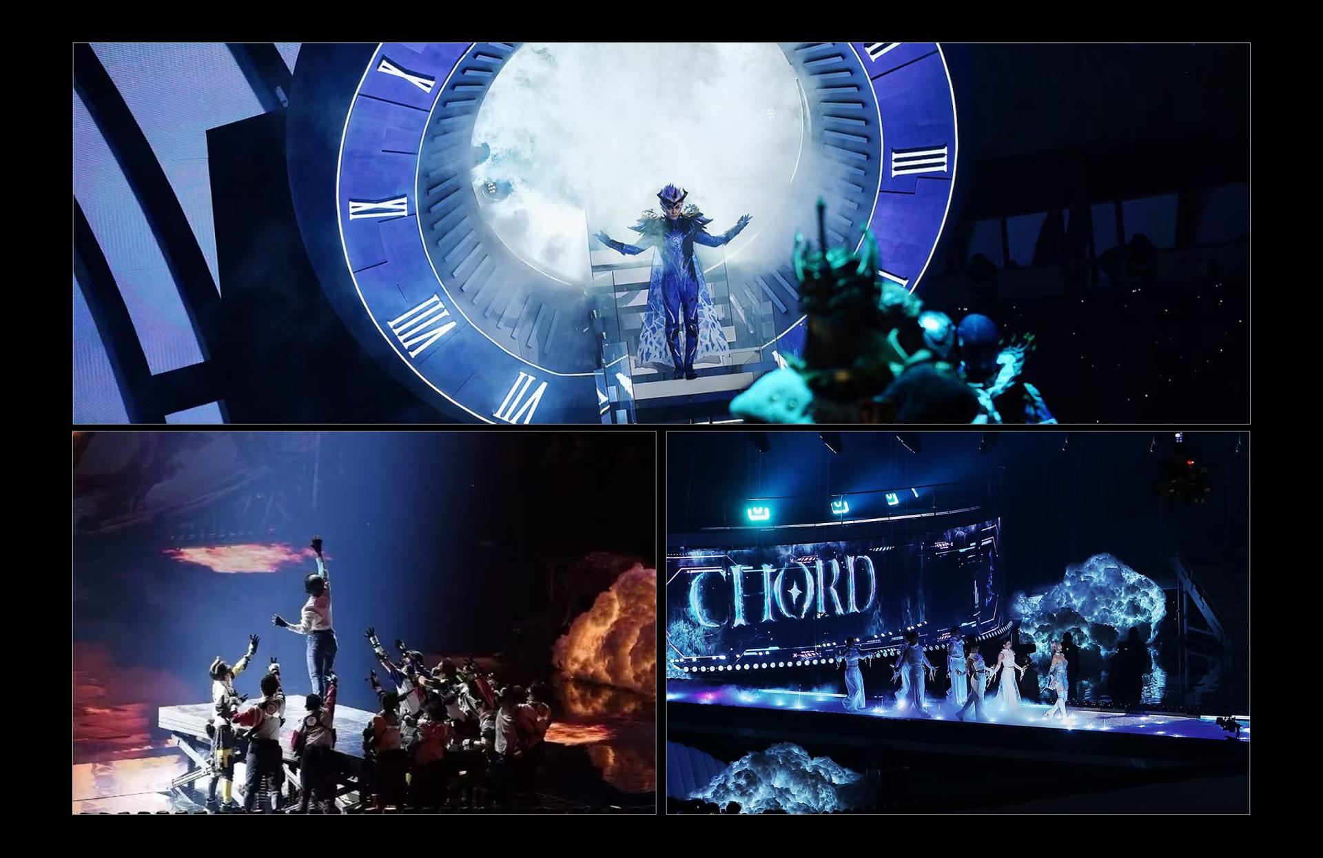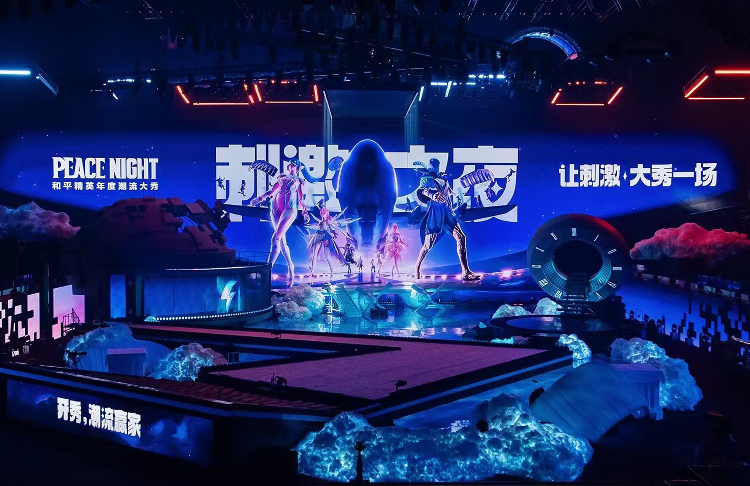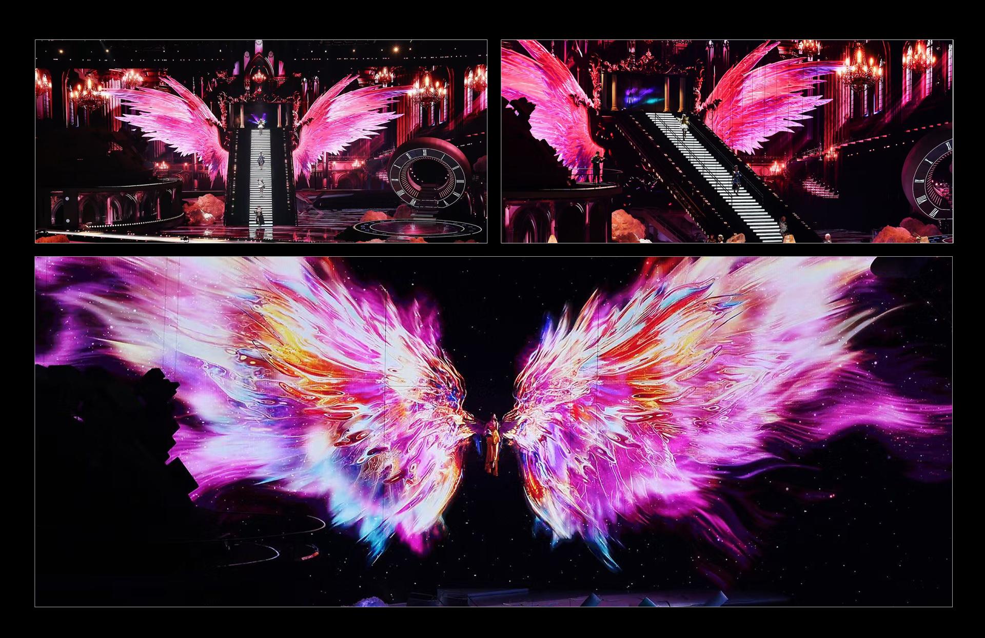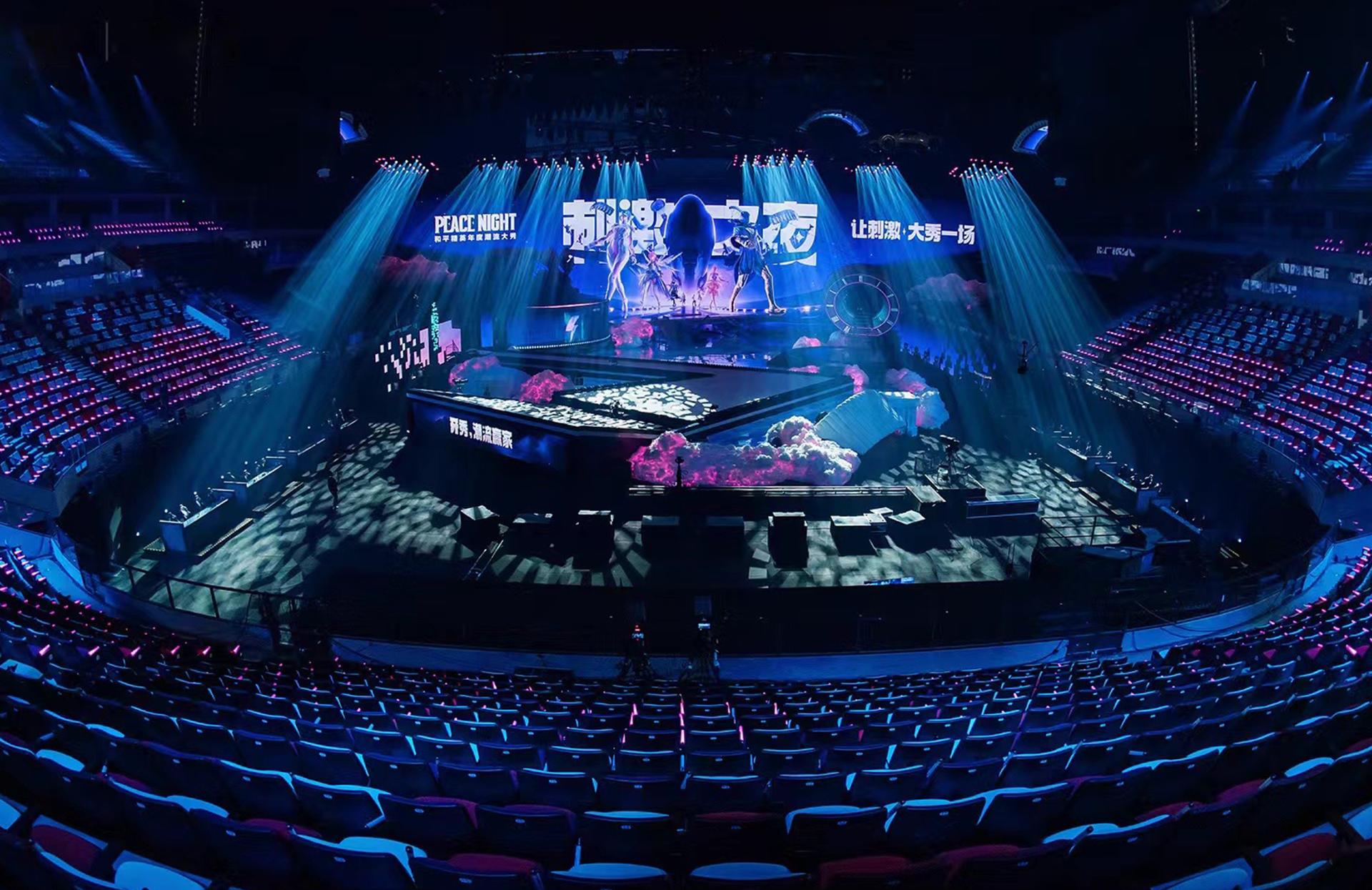 In an era where gaming and reality increasingly intertwine, "Peace Night 2024–Game of Peace Fashion Show Stage," themed 'The Descent,' created an immersive, ceremonial space that shattered the boundary between dimensions. By transplanting core symbols from the game world into reality, the project leveraged deconstructivist spaces, dynamic mechanical installations, and digital media to deliver an unprecedented immersive experience, setting a new benchmark for esports stage design. We deconstructed and reassembled the iconic elements of Game of Peace, employing a new spatial language to narrate a story of virtual-real fusion. The CNC-controlled overhead screens, capable of a full 180° rotation, worked in coordination with robotic arms and lifting platforms to create the visual spectacle of characters "descending from the sky." This dynamic stage, which defies physical boundaries, represents a rare "aerial media language" in the industry—serving as both a fashion runway and a real-world extension of the game universe. Built on a deconstructivist framework, the stage transformed hardcore in-game symbols like the Level 3 Helmet, aircraft wings, and airdrop crates into futuristic geometric installations. The back screen and overhead canopy merged to form an abstract "Dove of Peace," enveloping the main stage and symbolizing a spirit of peace that transcends competition. The space was fragmented into multiple dimensions: a rotating turbine stage, a tri-level "helmet" passage, and a wing-shaped runway. Augmented by holograms, water mist, and light matrices, these elements transformed the stage into a traversable and interactive immersive environment. The stage's modular design allowed for rapid scene changes based on performance requirements, creating a highly efficient system for all stakeholders. For performers, elements such as the multi-level structure, lifting platforms, rotating stage, and holographic passages greatly expanded their creative space and expressive potential. For the audience, a central runway and immersive layout ensured an optimal viewing experience from every seat, enhanced by striking visual highlights — the "celestial descent" opening, "sky ladder" transition, and "epic ensemble" finale — that delivered powerful sensory impact. For the production team, modular standardization and intelligent mechanical integration improved efficiency and control while significantly simplifying setup and maintenance.