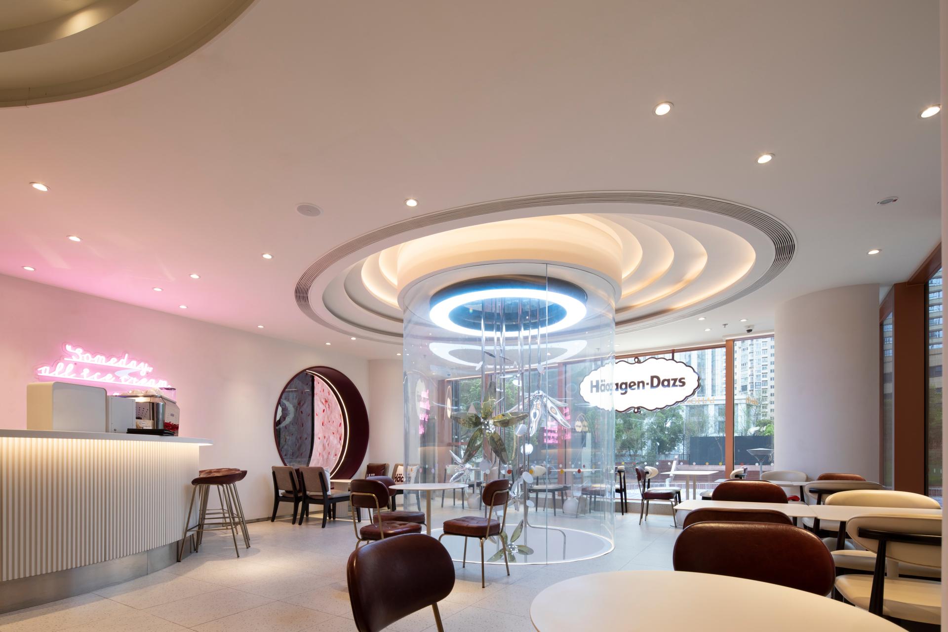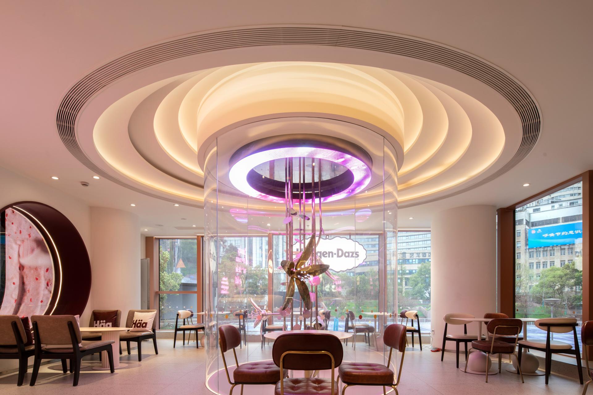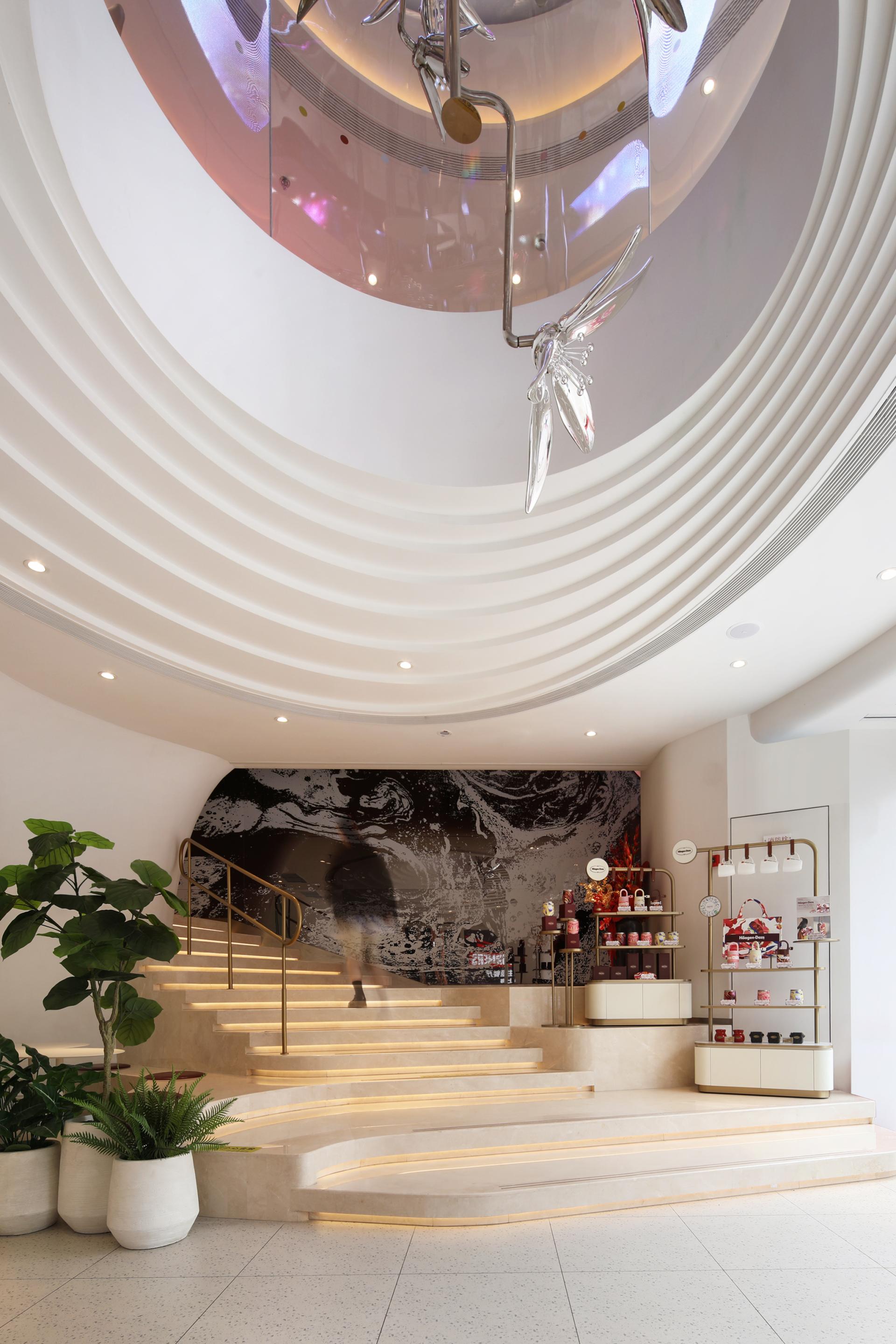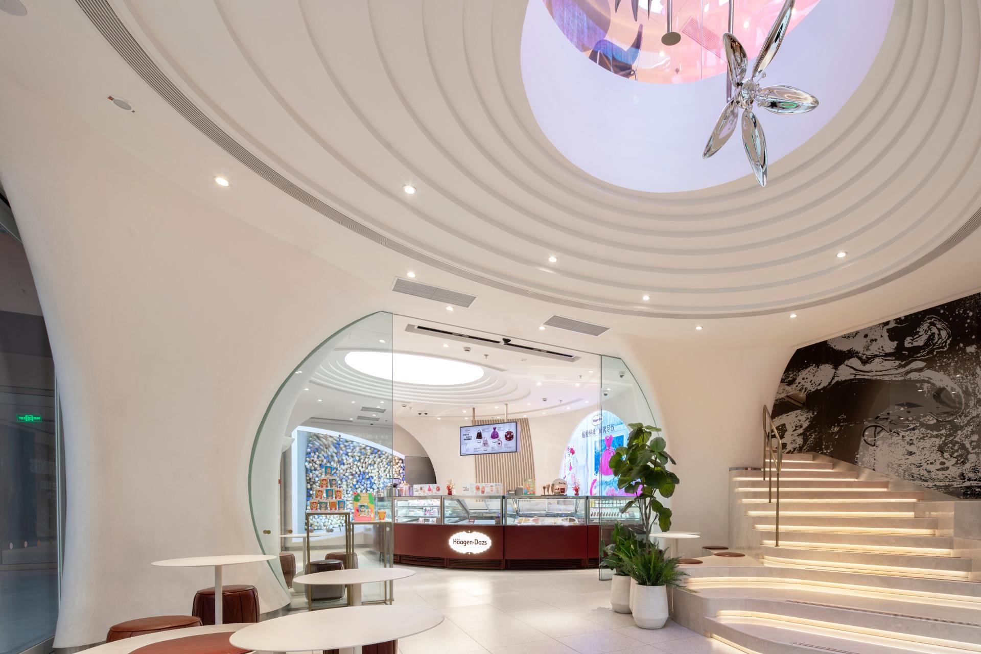 What we present is not merely an ice cream shop, but a three-story sanctuary of taste and sight, designed for exploration. Situated on the bustling Nanjing Road Pedestrian Street, the Häagen-Dazs flagship store draws its core inspiration from "the first scoop of ice cream," transforming that initial moment of sweet anticipation into a complete and fluid spatial narrative. The design eschews traditional retail layouts, employing sculptural curves, immersive light and shadow, and multi-sensory interactive experiences to guide customers from the city's clamor into a fantastical world built of vanilla and craftsmanship. It is a sensory pilgrimage that journeys from the palate to the soul. The walls and ceilings are coated in a warm, vanilla-colored textured paint, resembling a three-story block of ice cream meticulously carved by a giant scoop. Ubiquitous, elegant curves mimic the smooth tracks left by a scoop, creating a strong sense of visual envelopment, as if embracing customers within a vast, sweet ice cavern and awakening their taste memories from the very first step inside. A Curated Vertical Journey The project's greatest challenge lay in vertically connecting the three floors and endowing each with a unique appeal, all within the structural limitation of having no elevator. We transformed this challenge into a highlight through a series of meticulously planned designs, creating a progressive journey of discovery, level by level. The Gravitational Core — The "Vanilla Blossom" Interactive Installation: To break down the barriers between floors, we boldly opened up the floor slab between the first and second levels to install a two-story "Vanilla Blossom" art installation. This dynamic installation is not only a visual focal point, attracting the curiosity of first-floor customers and guiding them upstairs; it is also a three-dimensional embodiment of Häagen-Dazs' classic flavor, presenting the brand's core values in a poetic and striking manner and offering a dual feast for both the eyes and the palate.