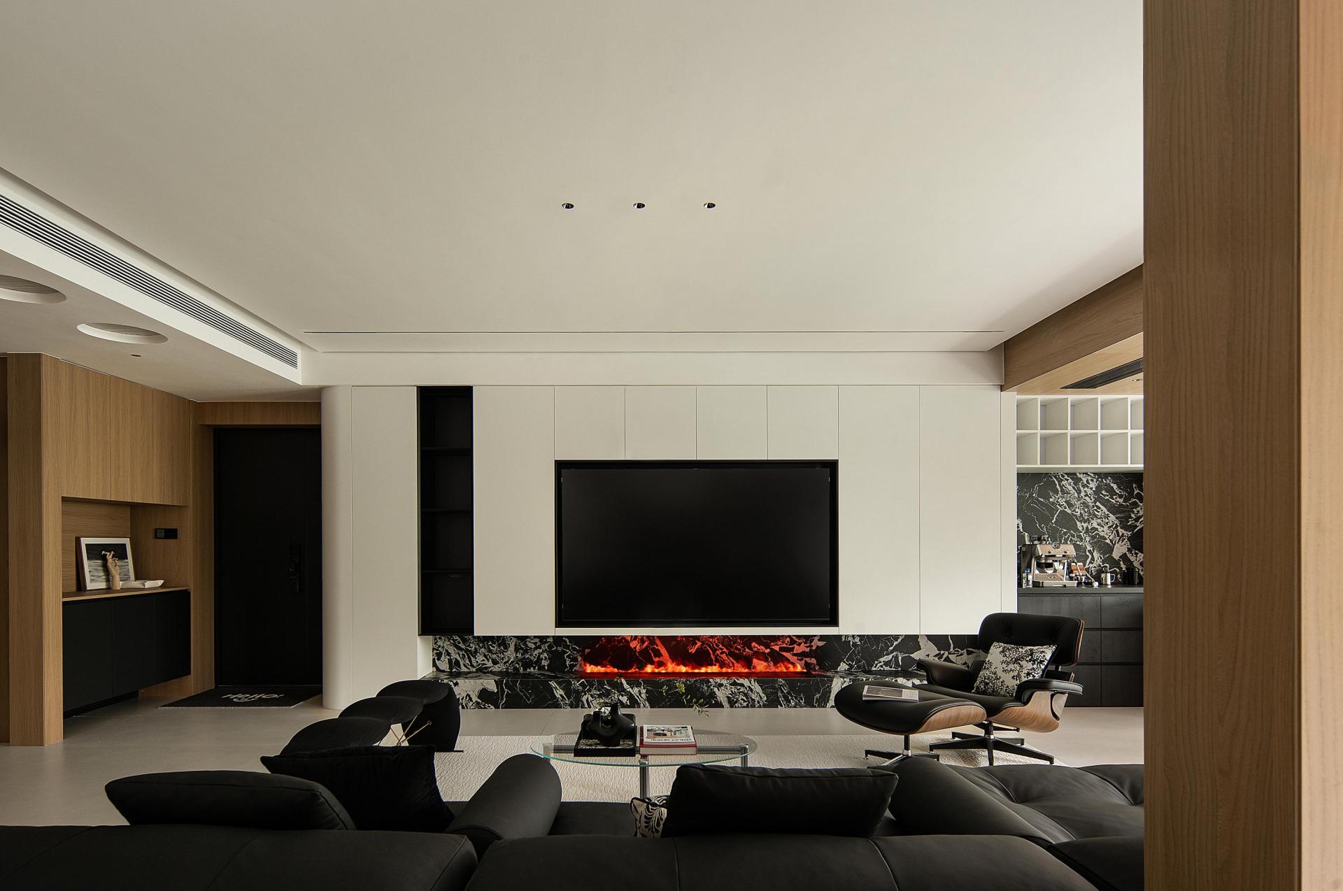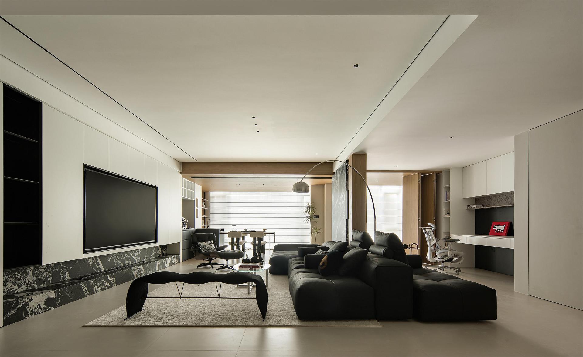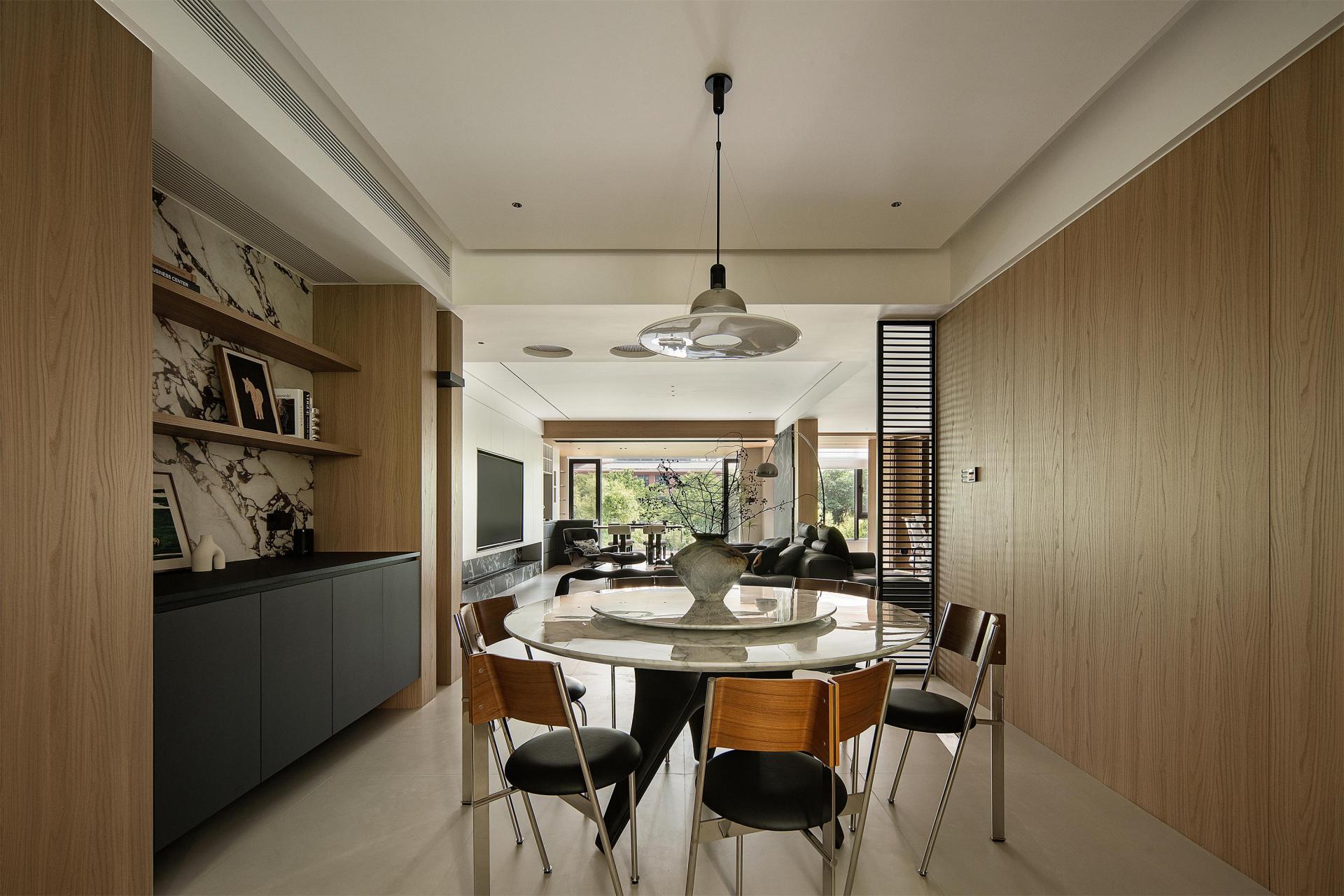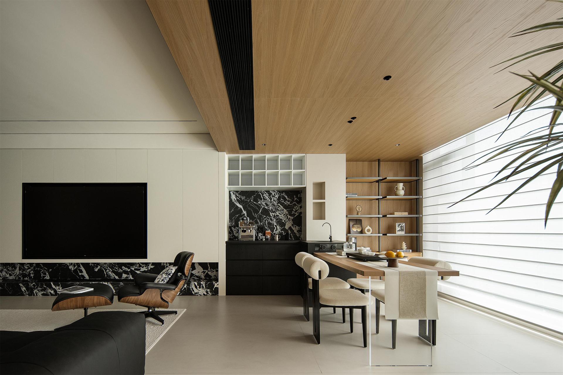 The design concept of "Boundary" superficially defines spatial limits, but in essence, it breaks down the physical and psychological barriers of traditional spaces with a more inclusive perspective. In this 180㎡ residence, the designer restructured the overall spatial logic, transforming the originally independent study area into an efficient workspace that seamlessly connects with the living-dining area, lifestyle balcony, and wet bar, forming a transparent and cohesive open space. Previously overlooked or wasted corners in separate areas have been revitalized with new value. A load-bearing wall between the living room and the former study, which could not be removed, was cleverly transformed into a visual focal point within the open space through a combination of artistic rock panels and wood veneer, creating a natural circulation path around it.