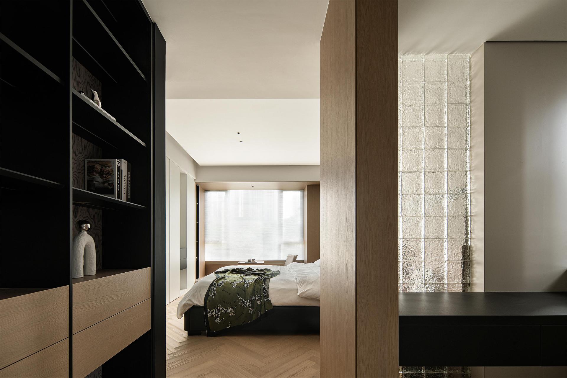 From the entrance, one passes through a semi-open master bathroom and an embedded wall display, leading to the core bedroom area, forming a T-shaped semi-open layout. This design ensures the relative independence of functional areas while effectively enhancing the space’s overall coherence and visual expansiveness.