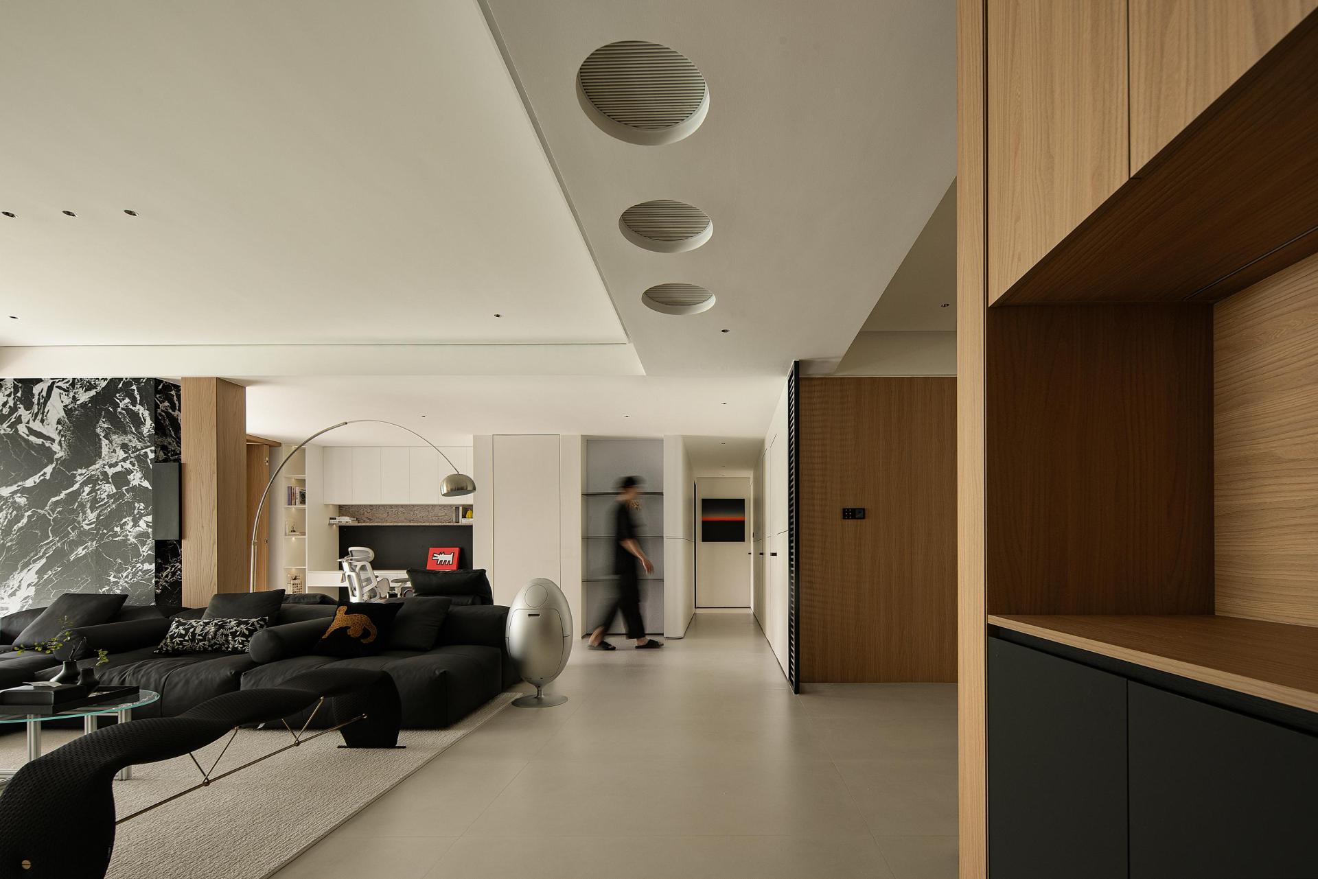 Three customized air vent designs in the corridor area use soft morphological language to balance the space’s rigid expression, subtly echoing the geometric approach of the master bedroom’s wall design, reinforcing the overall narrative logic of the space.