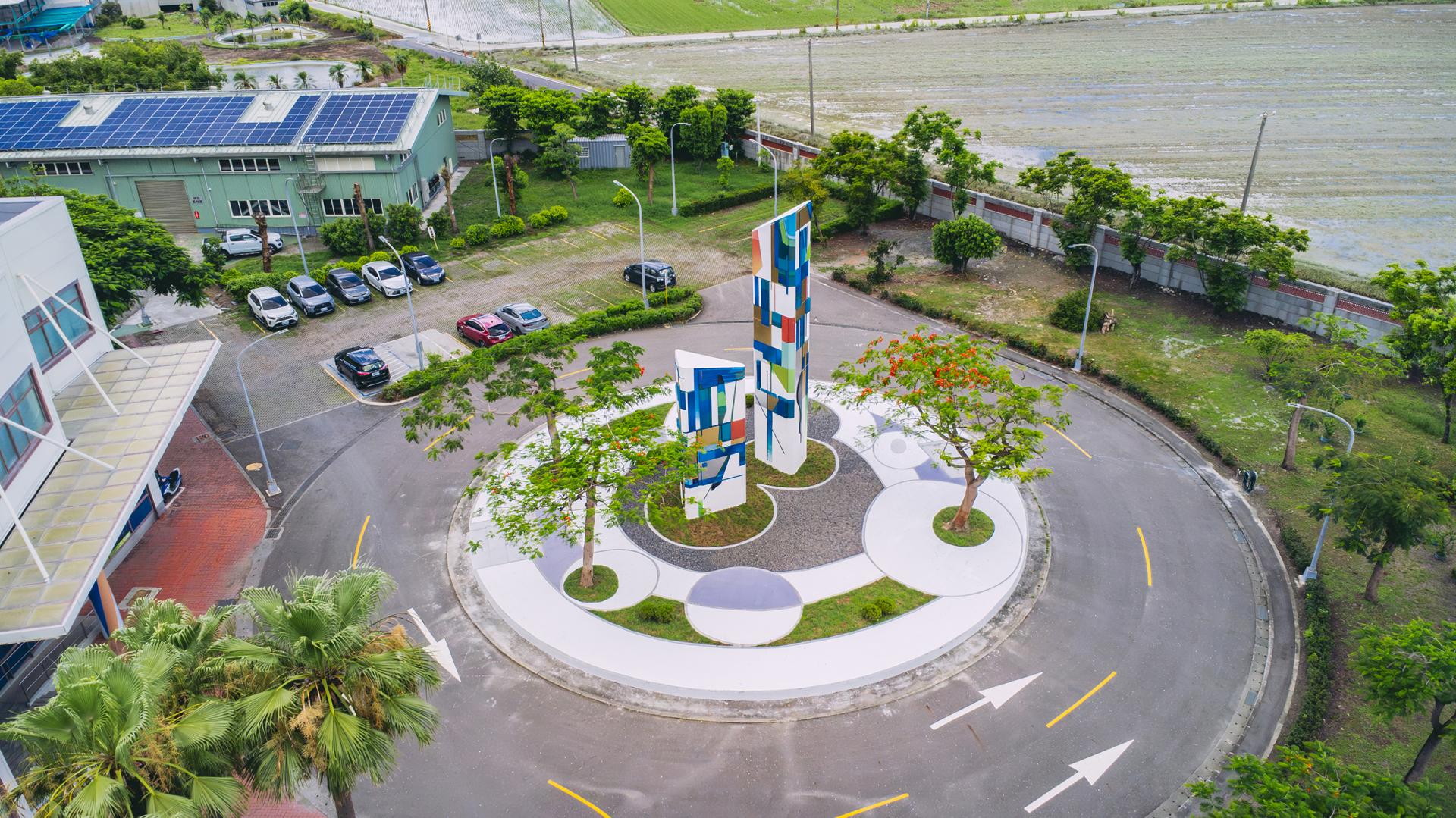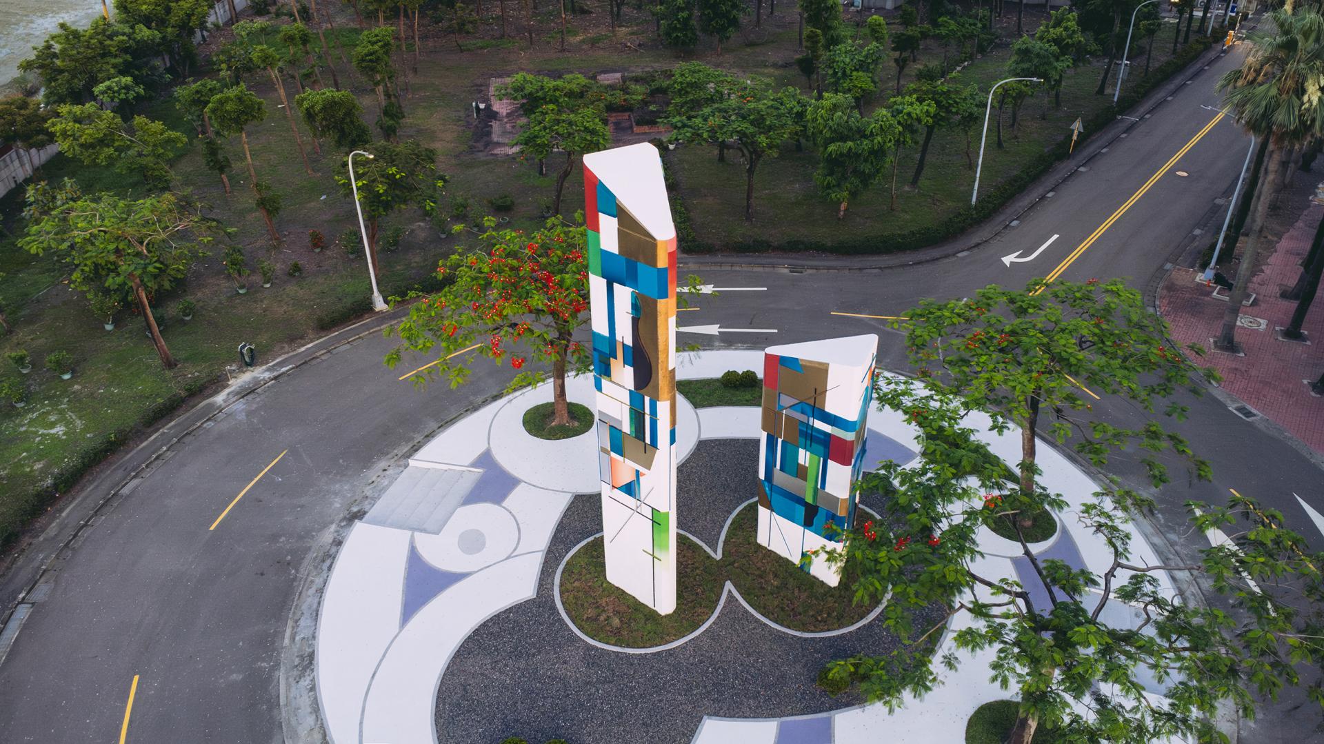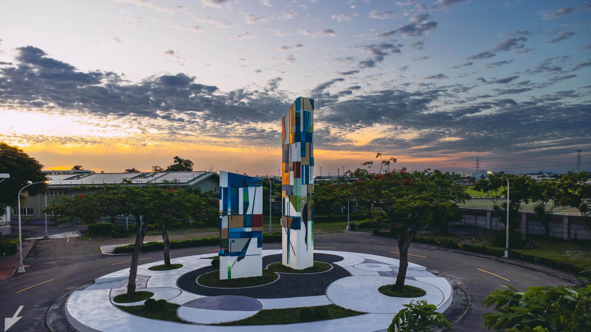 Incorporating post-incineration recycled aggregate with sustainable materials such as stainless steel, aluminum, and ceramic tiles, the triangular columns and sculptural forms bring to life the visual themes found in the artists’ Threshold paintings. The tallest structure stands at 12 meters, demanding precise engineering to meet seismic and wind resilience standards. Functionally, the installation supports environmental education and connects directly to the planned eco-learning center onsite. Through this integration, the facility transforms from a NIMBY site into a space of reflection and social engagement—redefining the role of public art in ecological advocacy.