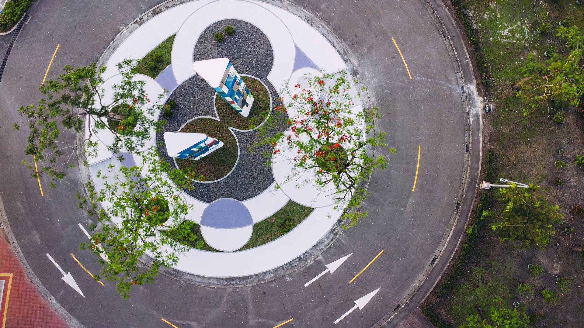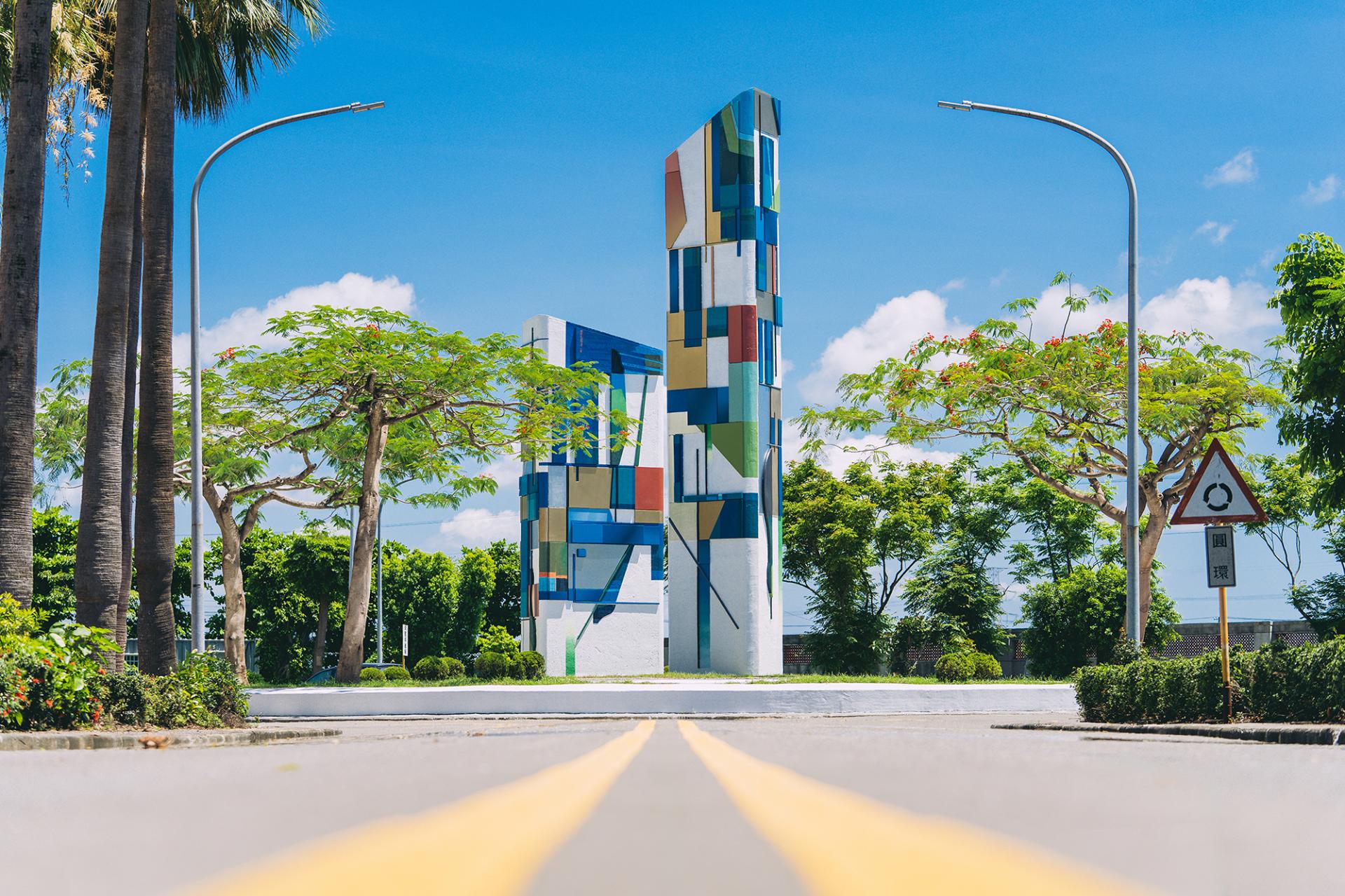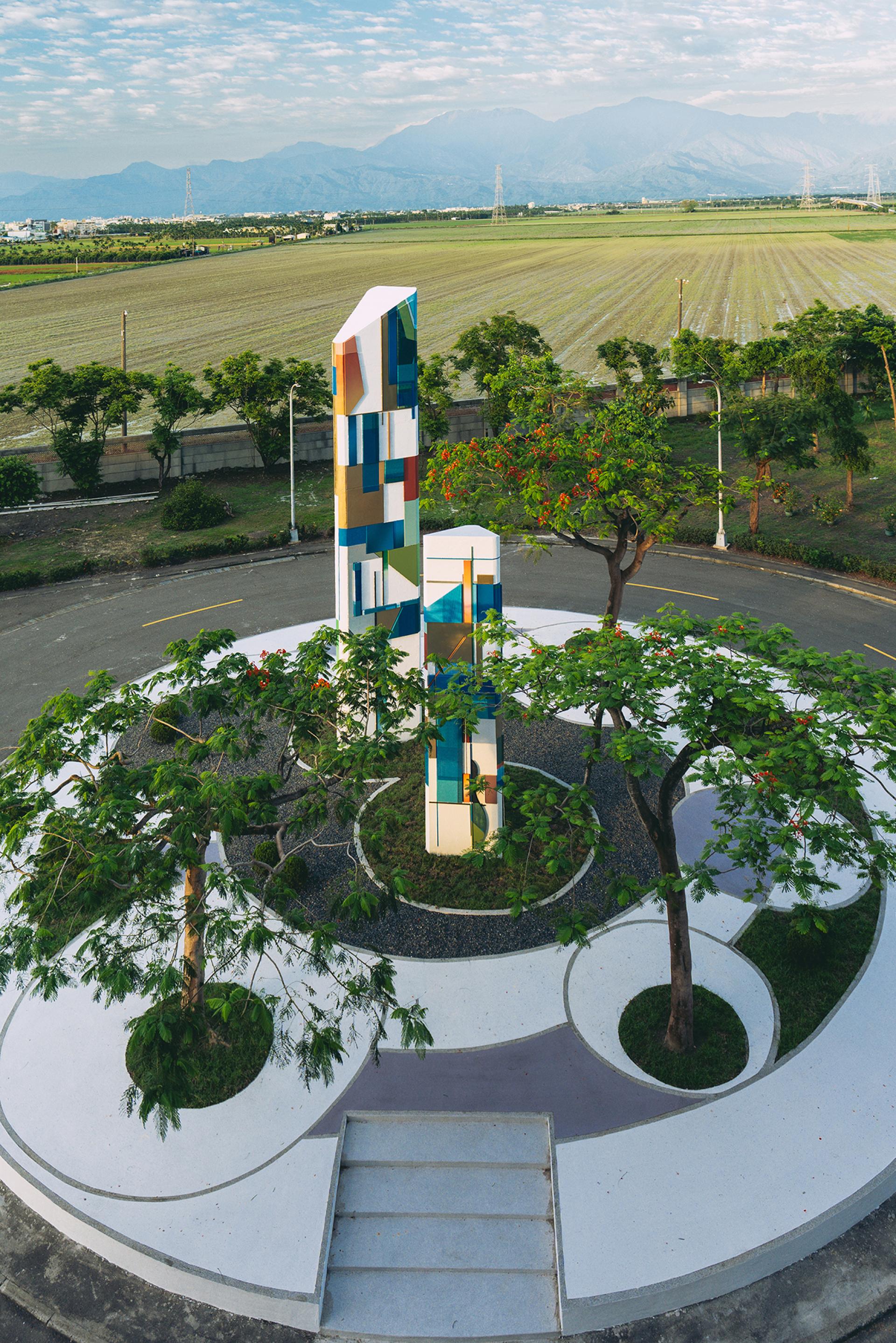 Incorporating post-incineration recycled aggregate with sustainable materials such as stainless steel, aluminum, and ceramic tiles, the triangular columns and sculptural forms bring to life the visual themes found in the artists’ Threshold paintings. The tallest structure stands at 12 meters, demanding precise engineering to meet seismic and wind resilience standards. Functionally, the installation supports environmental education and connects directly to the planned eco-learning center onsite. Through this integration, the facility transforms from a NIMBY site into a space of reflection and social engagement—redefining the role of public art in ecological advocacy.