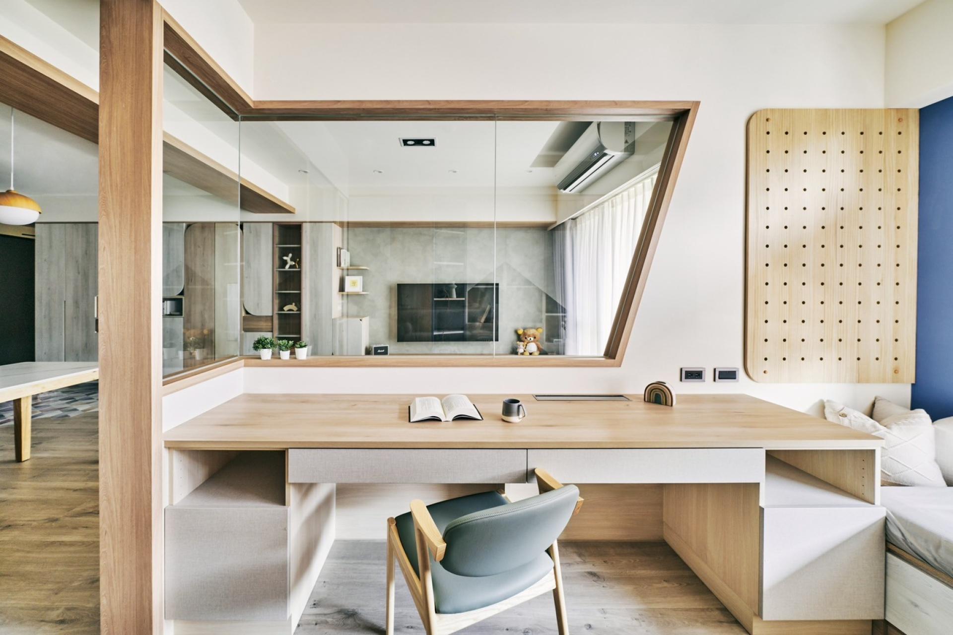 An open layout connects the living room, dining area, and kitchen, establishing clear pathways for both sightlines and natural light. A half-height wall behind the sofa along with a glass partition defines the study room, creating the feeling of separation without limiting views. It maintains the open, transparent feel of the study room while providing much-needed privacy. To maximize both storage and natural light, the glass partition extends around an angled corner to meet a sliding glass door, creating a bright and open atmosphere. At the entrance, a hollowed-out Rilakkuma-shaped partition adds a warm touch and provides just the right amount of privacy for the dining area, creating a sense of balance between the solid and void.