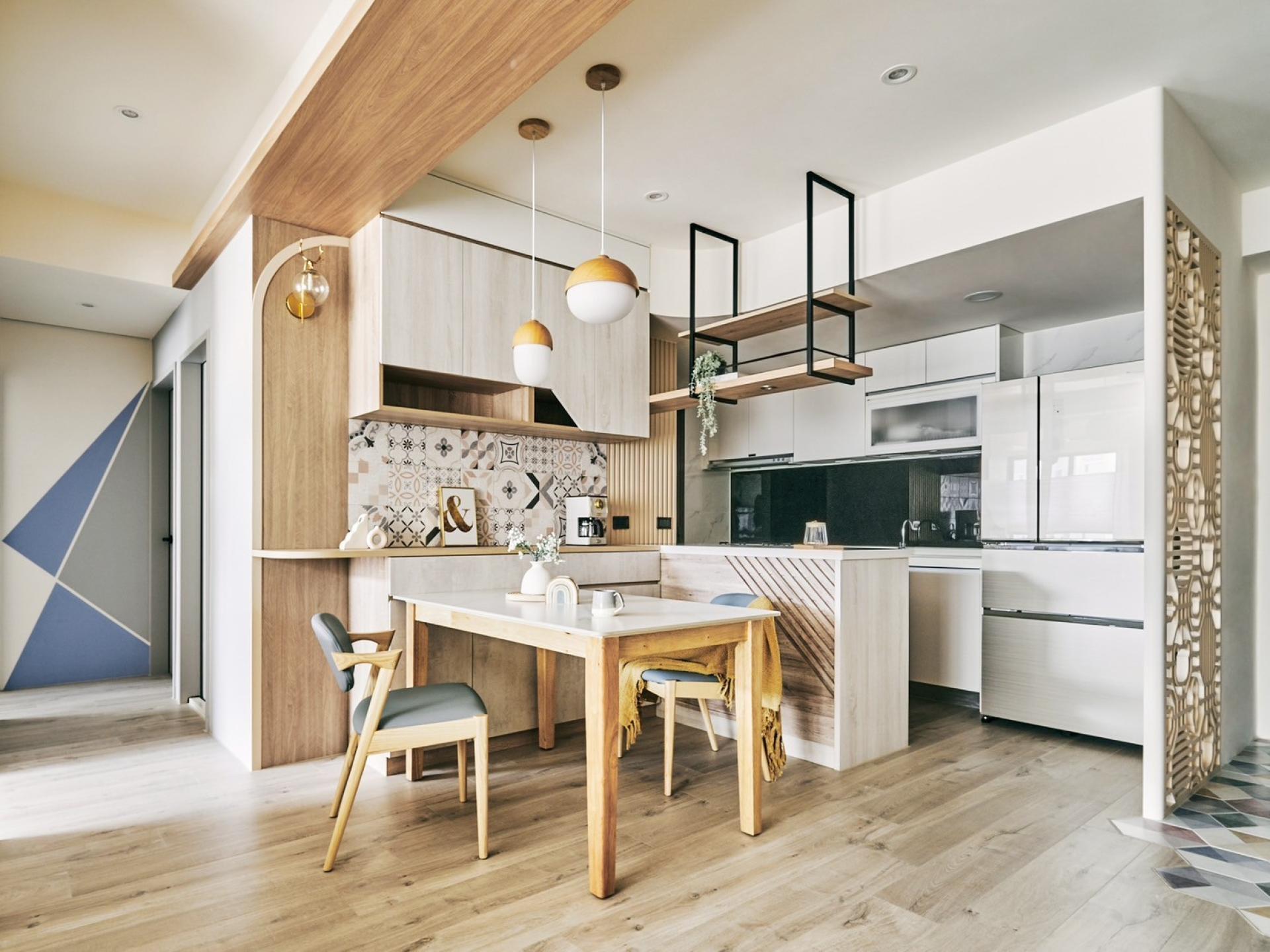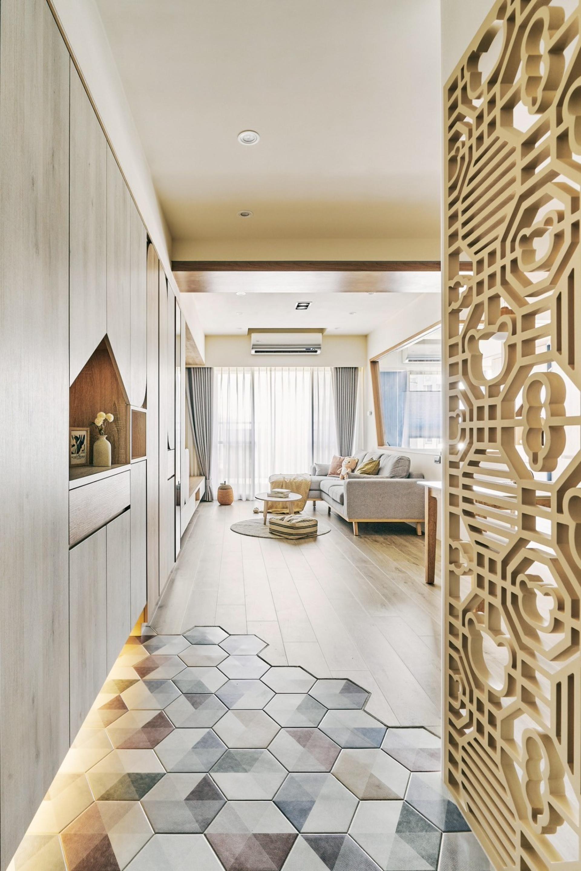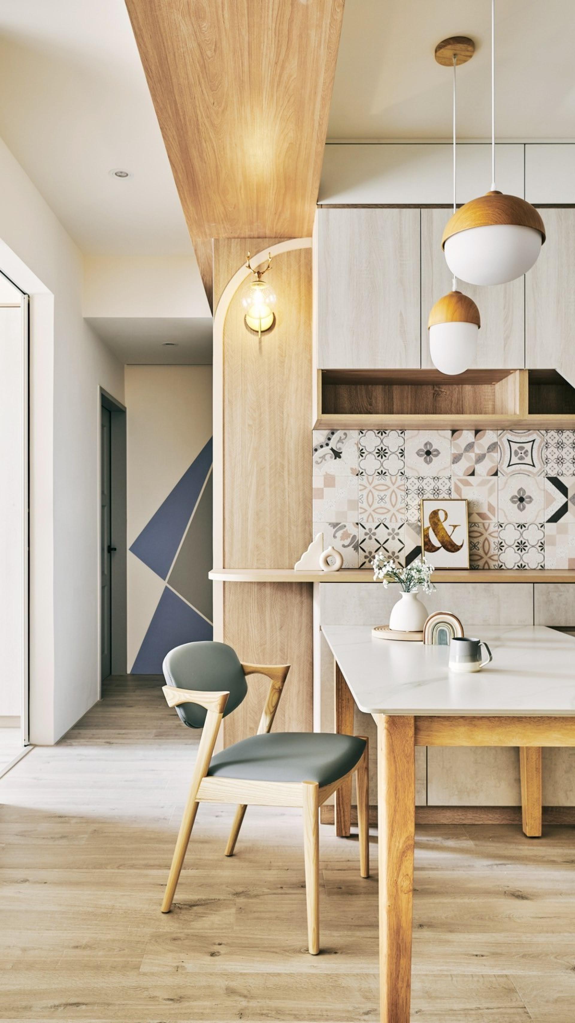 The warm wood tones serve as the foundation, creating a natural and inviting atmosphere. The feature wall showcases an artistic cement texture with hand-troweled marks, adding a rustic charm to the pristine space. In the study room, the wall is accented with a subtle, serene blue. Its low-saturation hue harmonizes with wood tones, offering a soft visual focal point. The wainscoting next to the sideboard and the entryway floor are adorned with muted floral tiles. Incorporating symbolic elements into the space can add depth and layers.