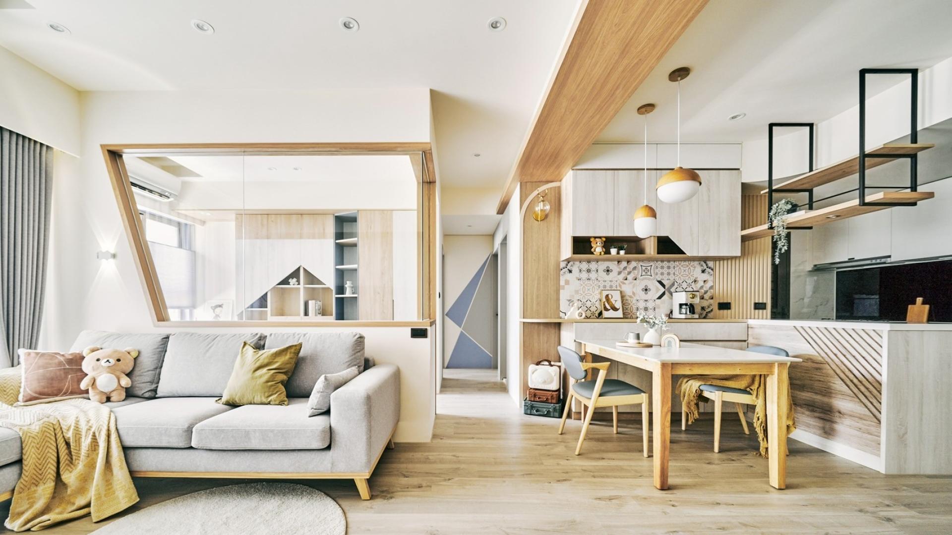 The low beams spanning above the feature wall and the living room and dining room are softened by wood cladding, reducing their visual weight and transforming rigid structures into gentle architectural elements. Curves and geometric lines intertwine throughout the space, easing any harshness and creating a fluid, dynamic visual flow.