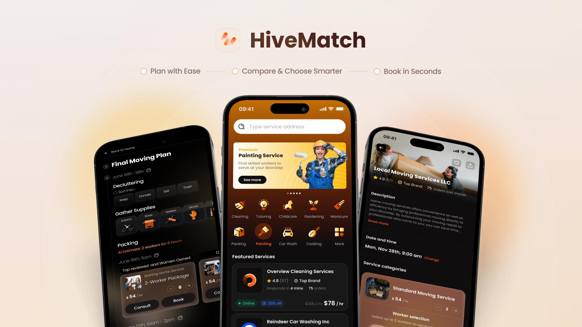 HiveMatch is an AI-powered gig platform that seamlessly connects customers with gig workers and delivers curated, high-quality service matches. By combining smart automation with user choice, HiveMatch streamlines the gig service experience while keeping customers fully in control.