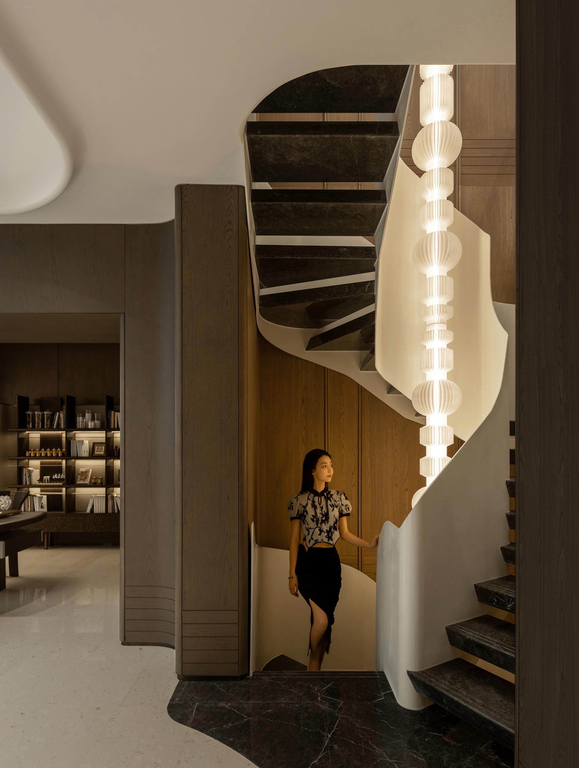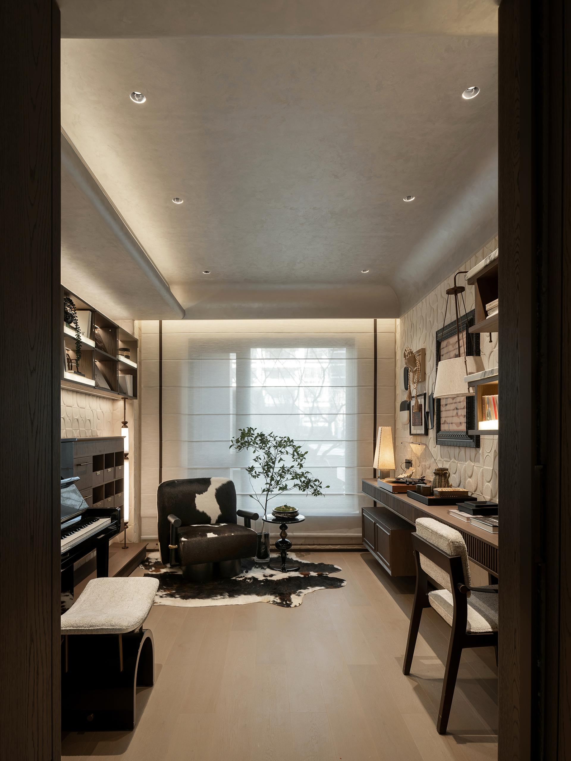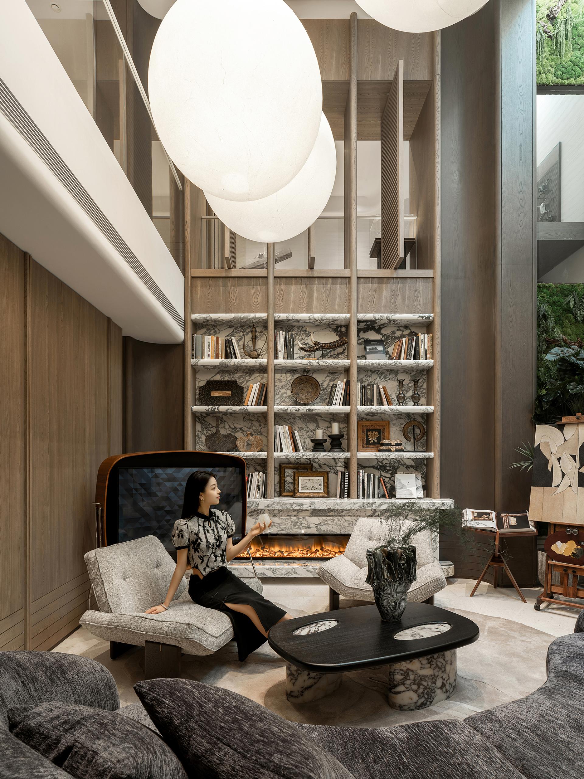 This duplex show flat divides functional zones through vertical spatial planning to achieve a separation of dynamic and static areas while meeting personalized needs. The lower ground floor focuses on social interaction and art , featuring a reception area, tea room, and foyer. The contrast between natural stone and wooden grille materials creates a sophisticated and layered ambiance. A double-height void enhances visual connectivity with the upper level while optimizing natural lighting. The upper ground floor is designed as a hobby and entertainment space, including a crafting area, a boy’s themed bedroom, and a dedicated gaming room. The central atrium connects both floors, facilitating spatial interaction. The aviation-themed design incorporates interactive elements to enhance engagement. The ground floor serves as the main living area , with a circular flow linking the living room, dining area, kitchen, and bedrooms, balancing openness and privacy. Thoughtful details such as a concealed TV wall, a dual Chinese-Western kitchen setup, and a separate piano room improve daily convenience and comfort. The overall design emphasizes a balance between functionality and aesthetics, utilizing unified materials, vertical spatial connections, and personalized zoning to create a multi-dimensional living space tailored to modern family lifestyles.