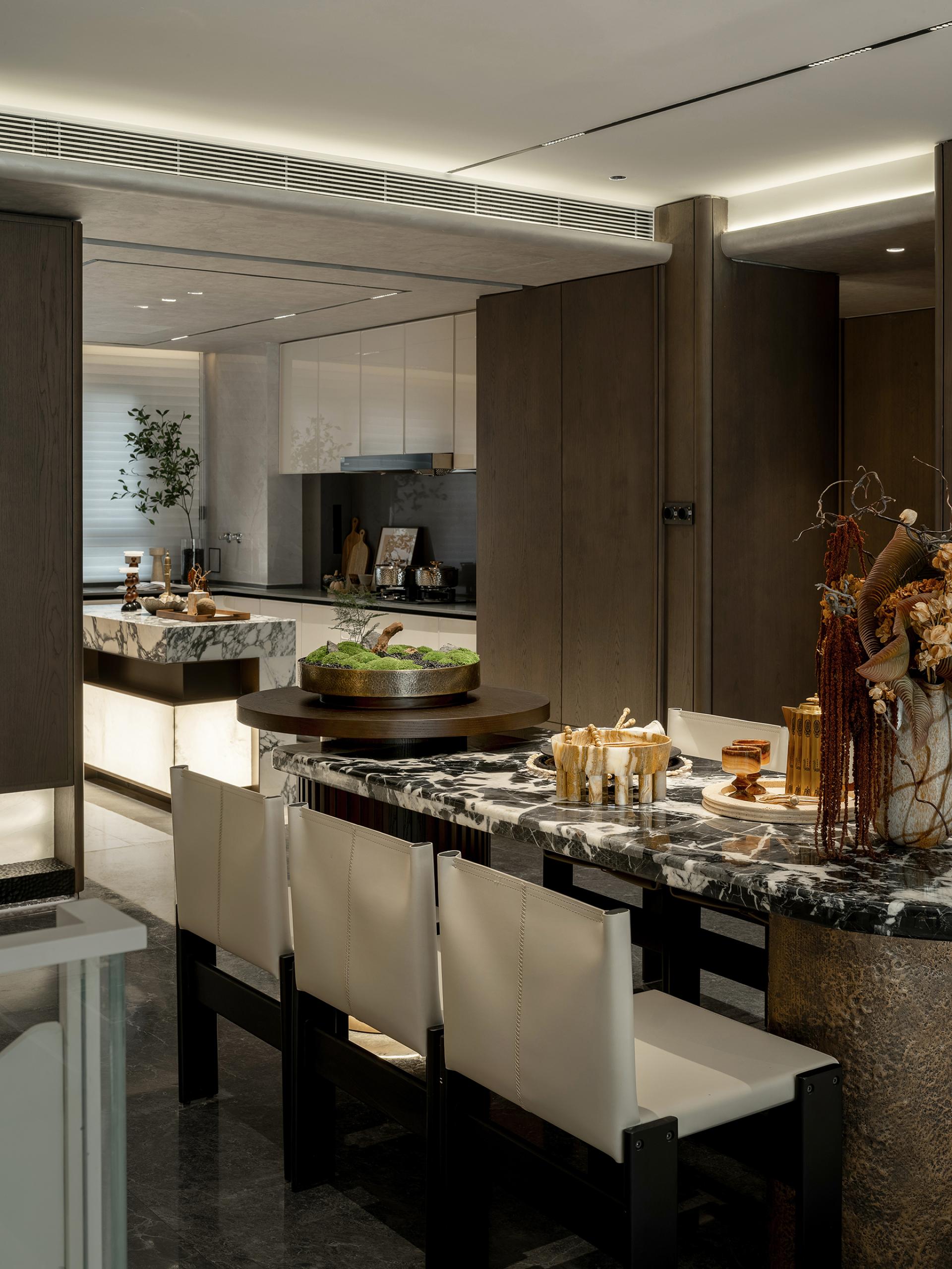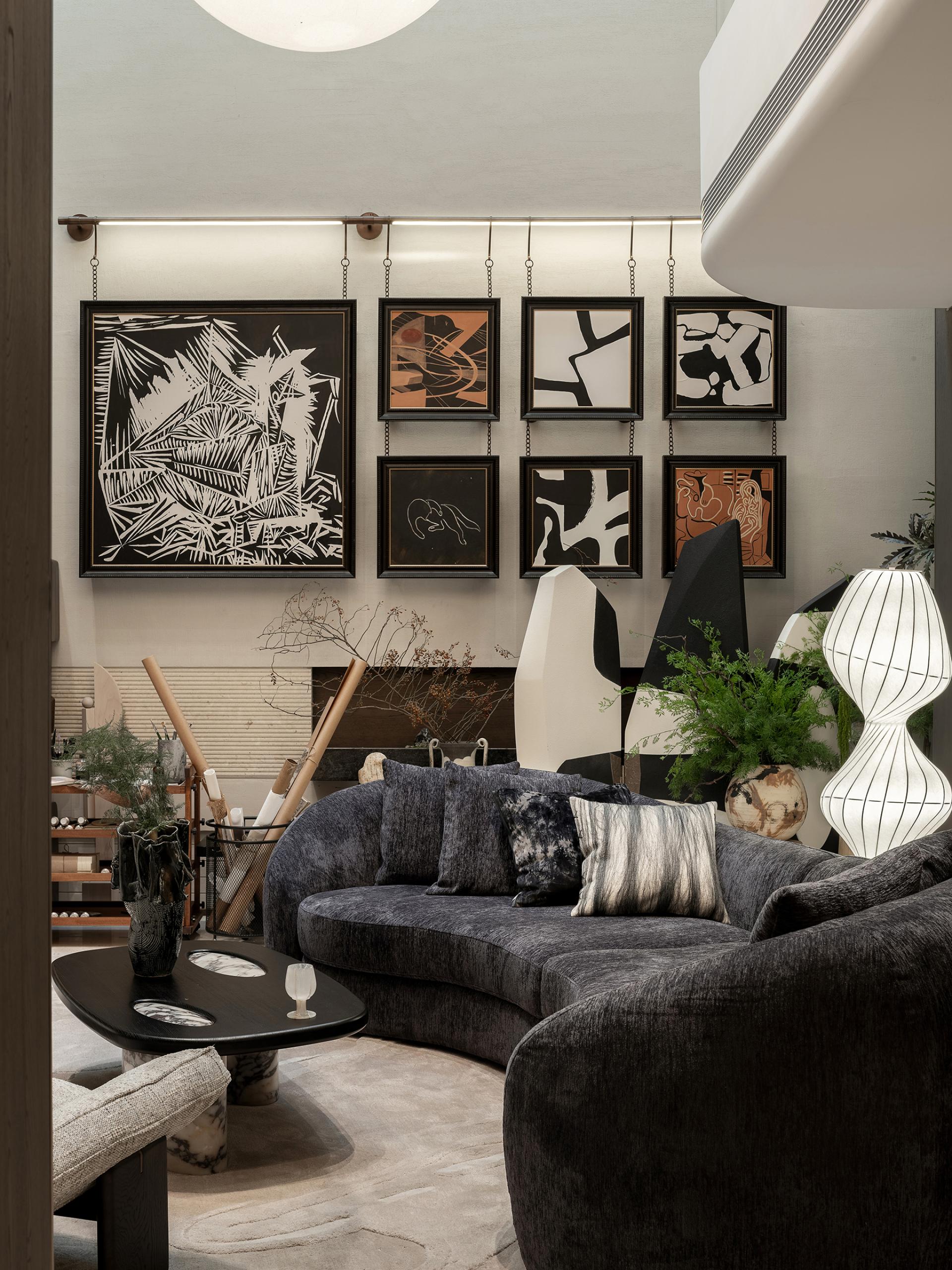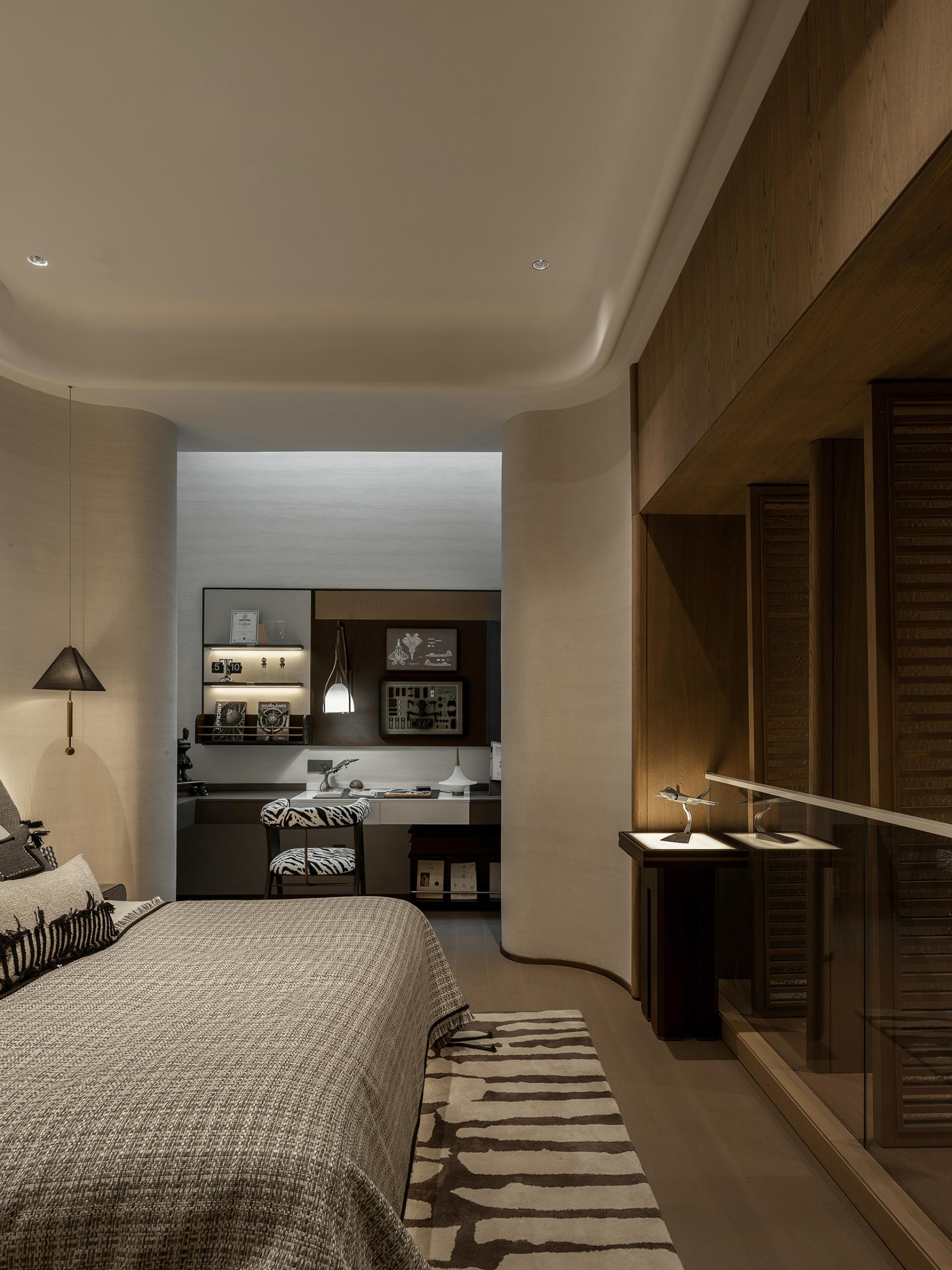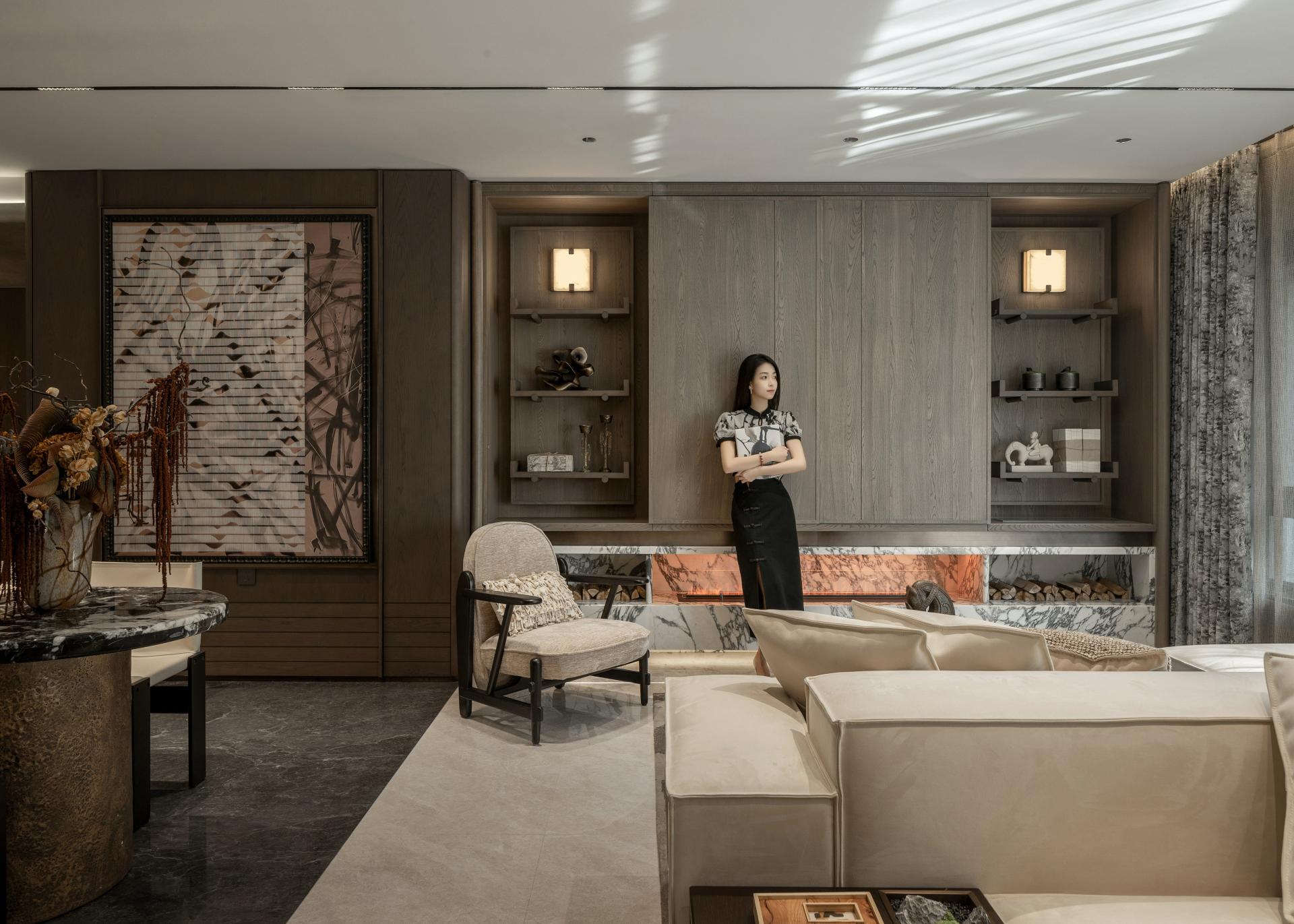 This duplex show flat divides functional zones through vertical spatial planning to achieve a separation of dynamic and static areas while meeting personalized needs. The lower ground floor focuses on social interaction and art , featuring a reception area, tea room, and foyer. The contrast between natural stone and wooden grille materials creates a sophisticated and layered ambiance. A double-height void enhances visual connectivity with the upper level while optimizing natural lighting. The upper ground floor is designed as a hobby and entertainment space, including a crafting area, a boy’s themed bedroom, and a dedicated gaming room. The central atrium connects both floors, facilitating spatial interaction. The aviation-themed design incorporates interactive elements to enhance engagement. The ground floor serves as the main living area , with a circular flow linking the living room, dining area, kitchen, and bedrooms, balancing openness and privacy. Thoughtful details such as a concealed TV wall, a dual Chinese-Western kitchen setup, and a separate piano room improve daily convenience and comfort. The overall design emphasizes a balance between functionality and aesthetics, utilizing unified materials, vertical spatial connections, and personalized zoning to create a multi-dimensional living space tailored to modern family lifestyles.