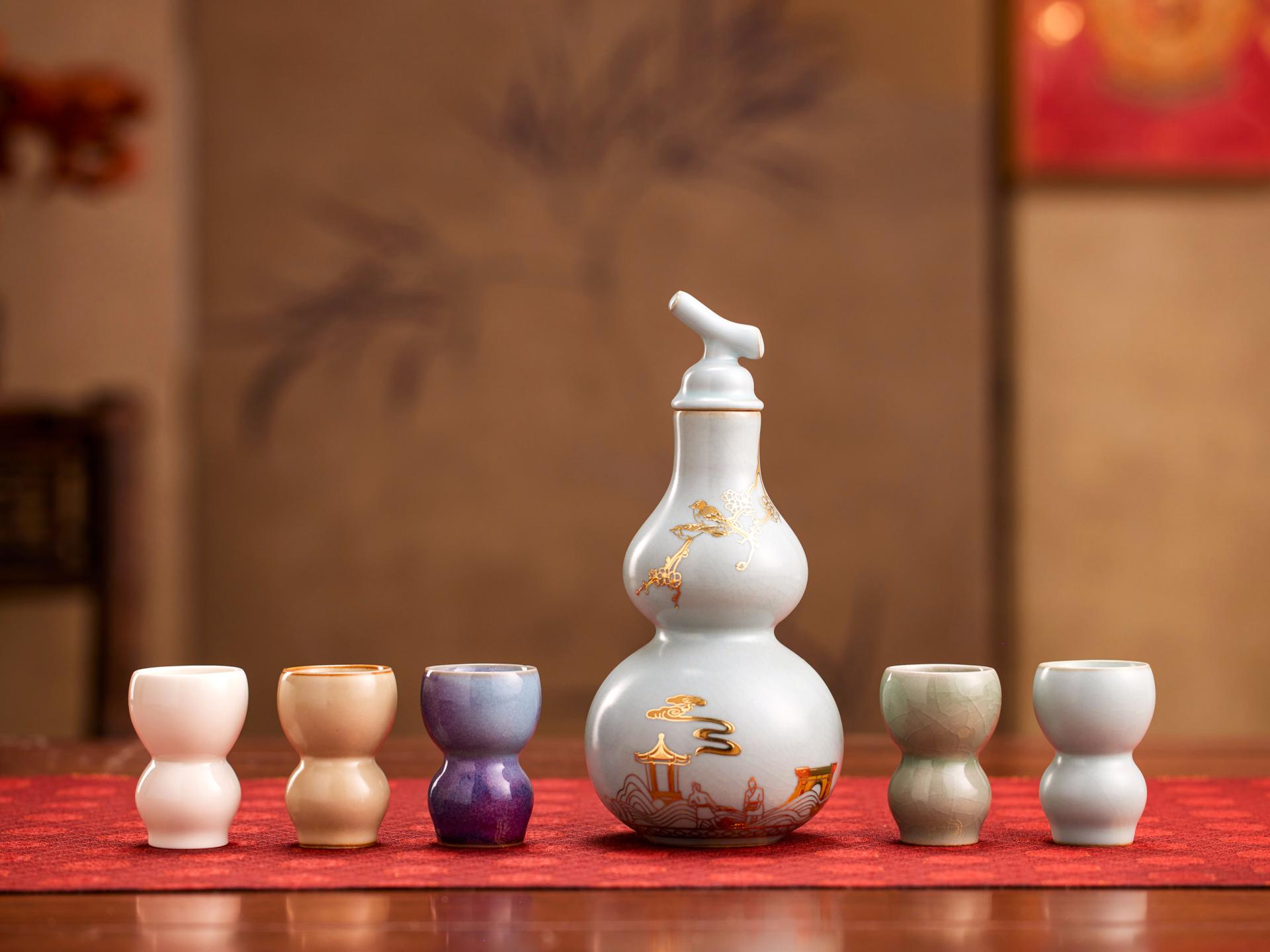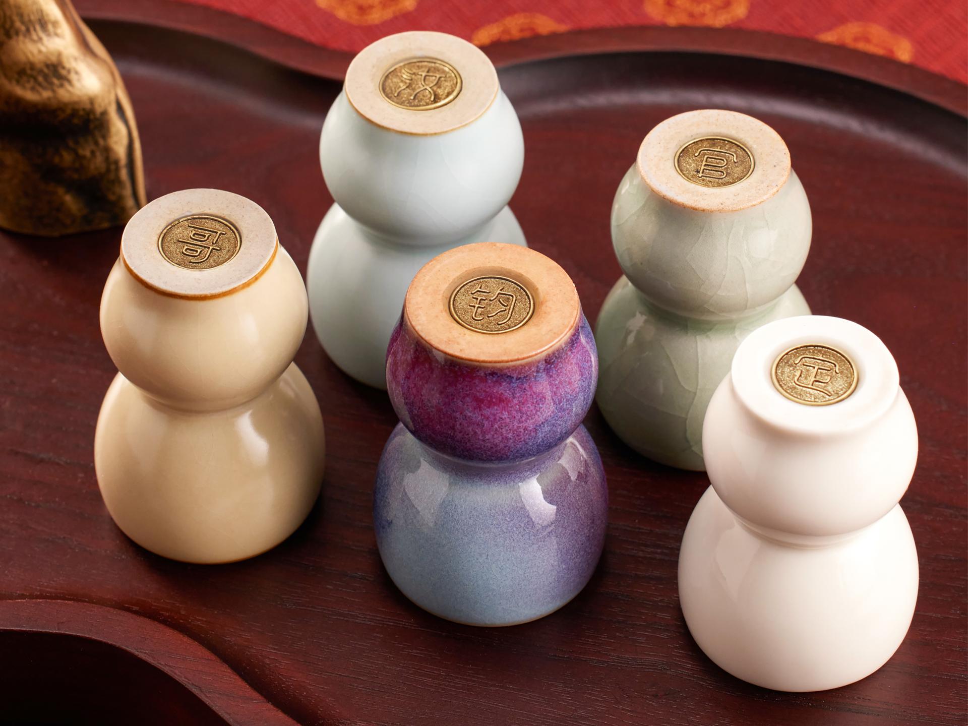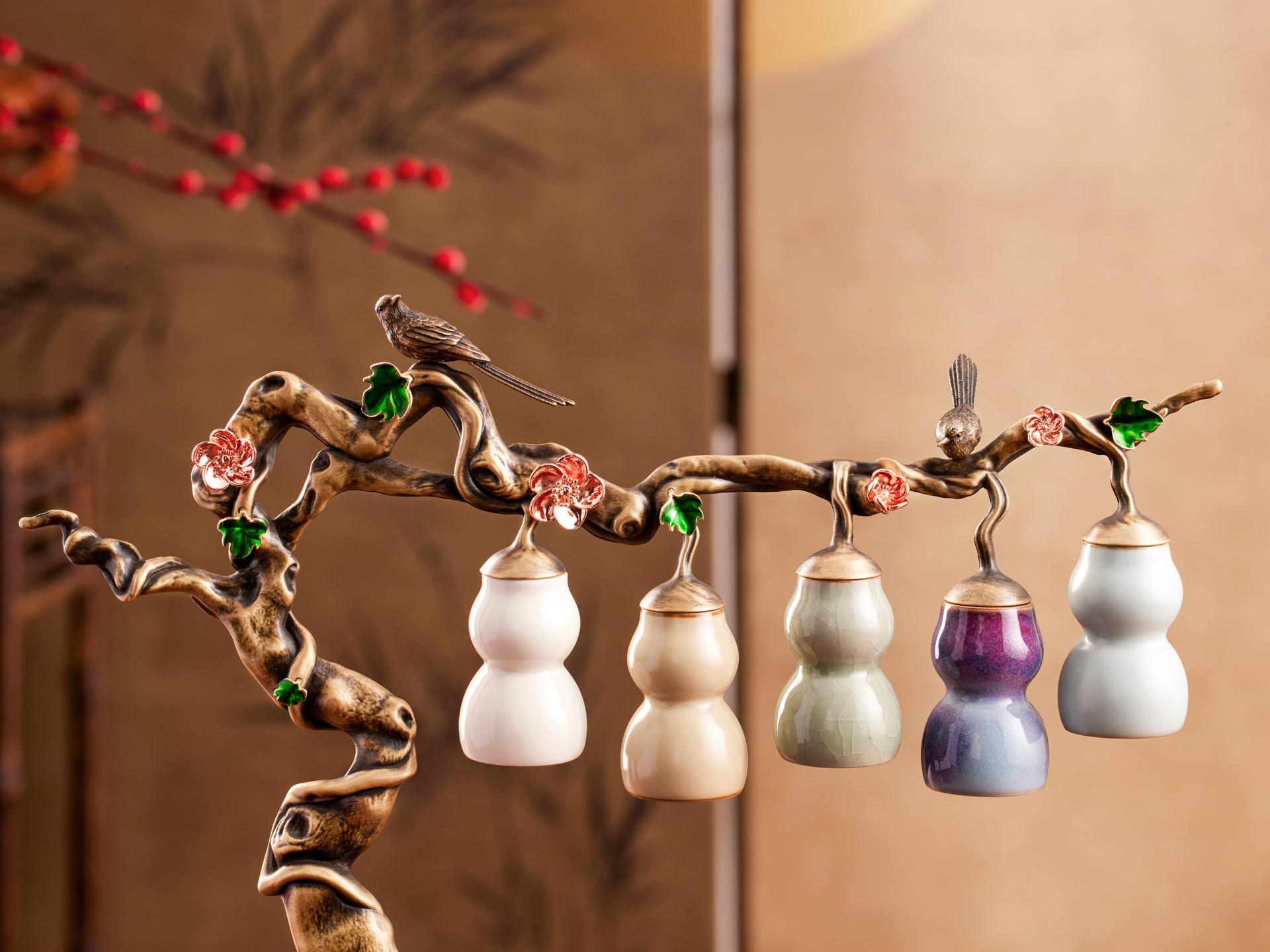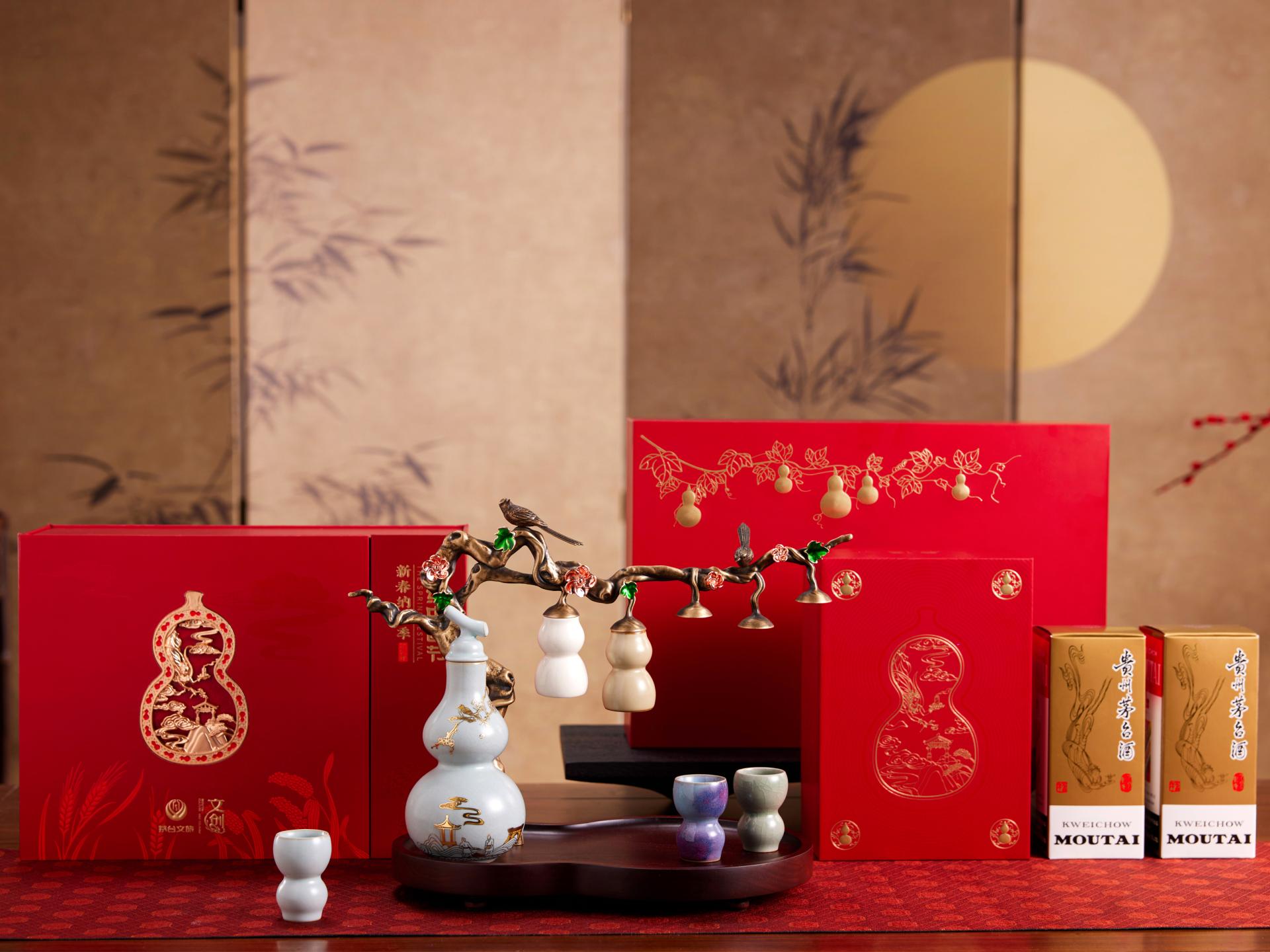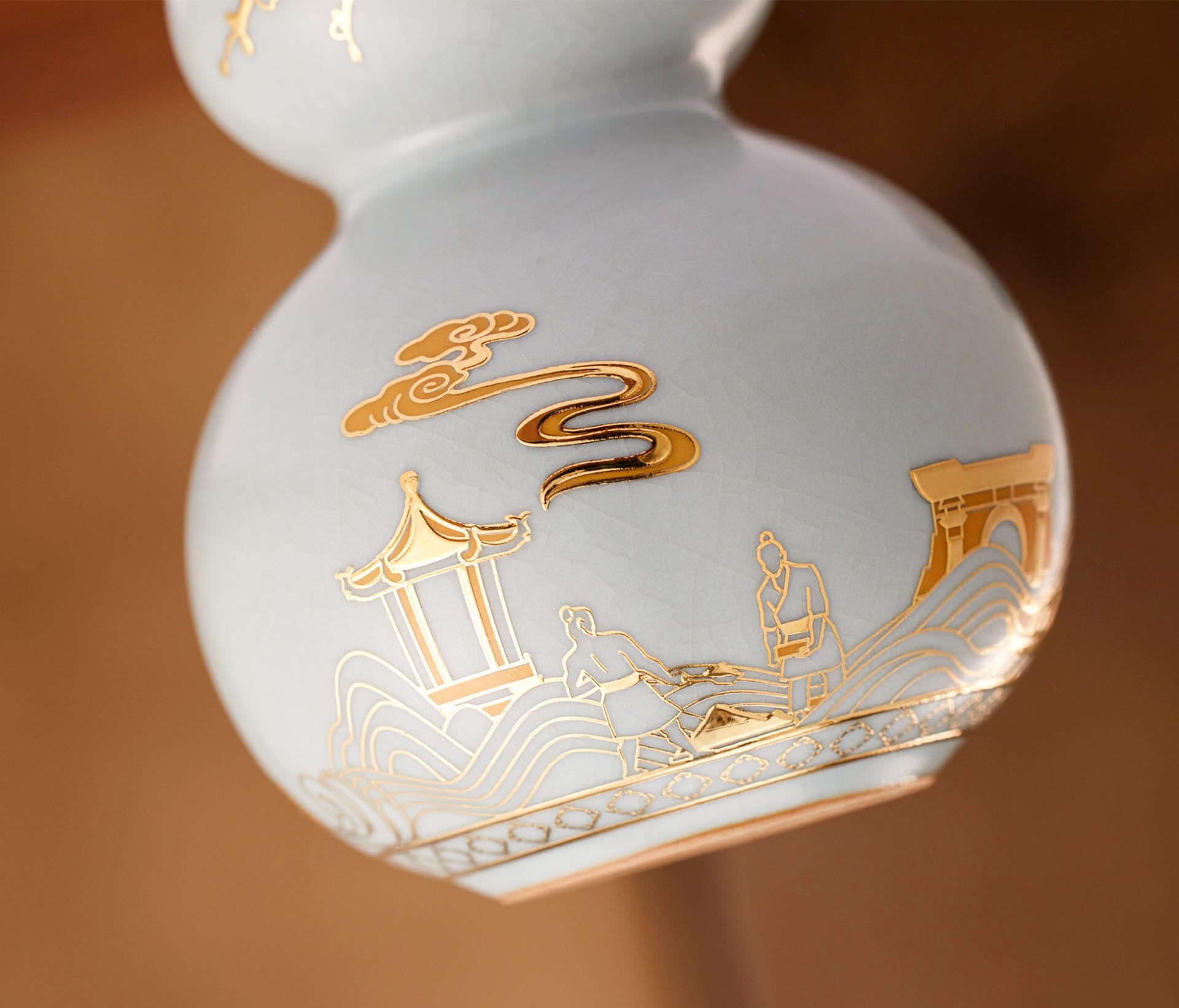 Spring Festival is the most important festival for Chinese. The design of this set of Moutai cultural tourism Spring Festival wine utensils is inspired by the gourd, which is homophonic with "Fulu", which means happiness, good luck and wealth. The design team takes China's five long-established ceramic kilns "Ru, Guan, Ge, Jun and Ding" as the source, and specially invites five ceramic masters to supervise the production of products, and try their best to reproduce the beauty of traditional ceramics. This product contains a gourd-shaped wine bottle and five gourd-shaped wine glasses. The bottle is hand-painted with gold thread to depict the traditional brewing process of Moutai. Each with a magnet pasted on the bottom of the glass, which can be hung upside down on the branch of the plum tree, representing the Chinese homonym "happiness is coming". The copper alloy wax plum branches are connected to a gourd-shaped walnut tray by a traditional Chinese mortise and tenon structure. The plum blossoms on the branches herald the arrival of spring, and the magpies welcome the new year on the branches. This product can be used as both cups and handicrafts. Every design detail conveys auspicious wishes. With inheritance and innovation as the core, the team deeply excavates the connotation of excellent traditional Chinese culture and inherits the thousand-year-old ceramic culture.