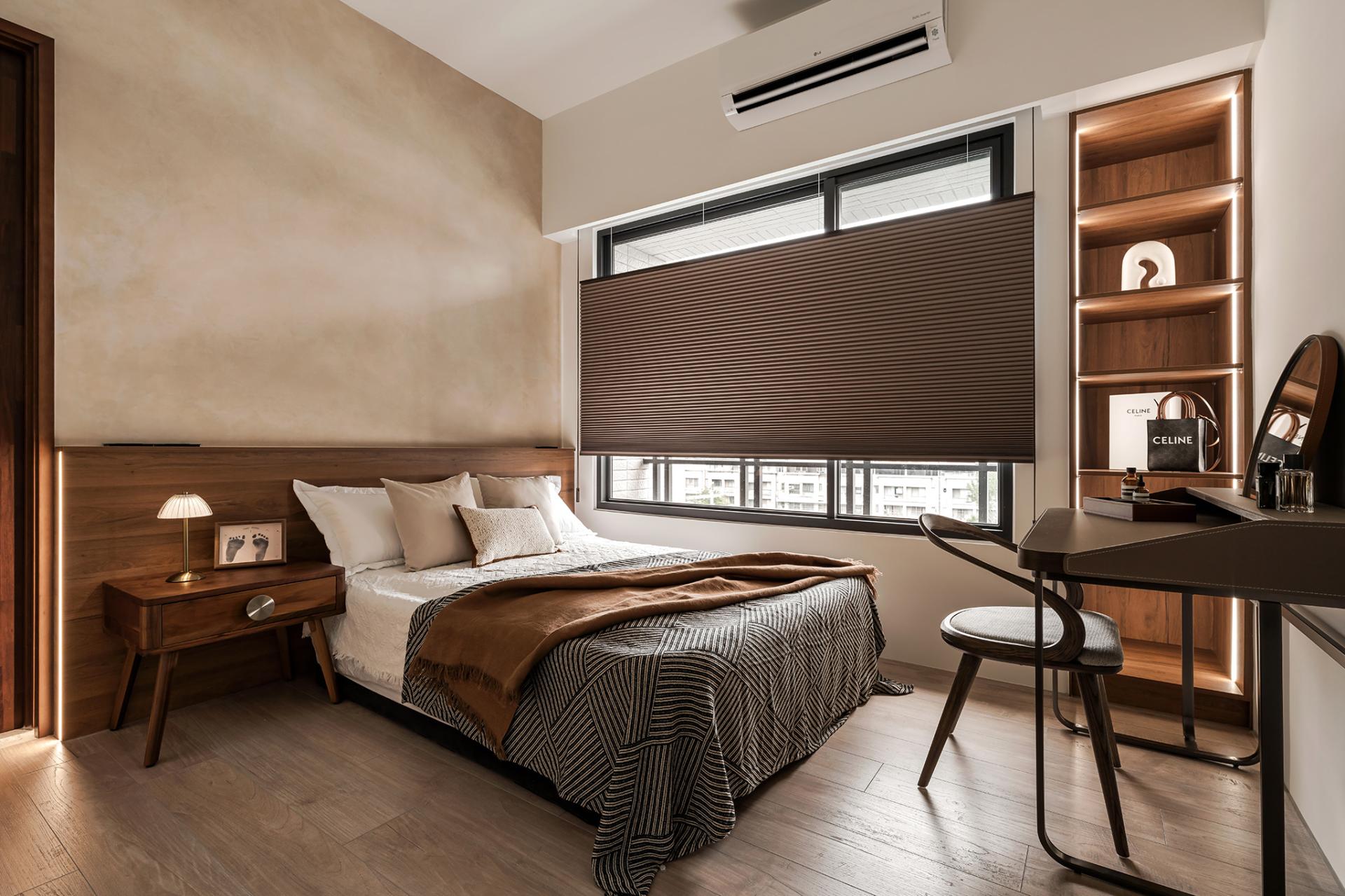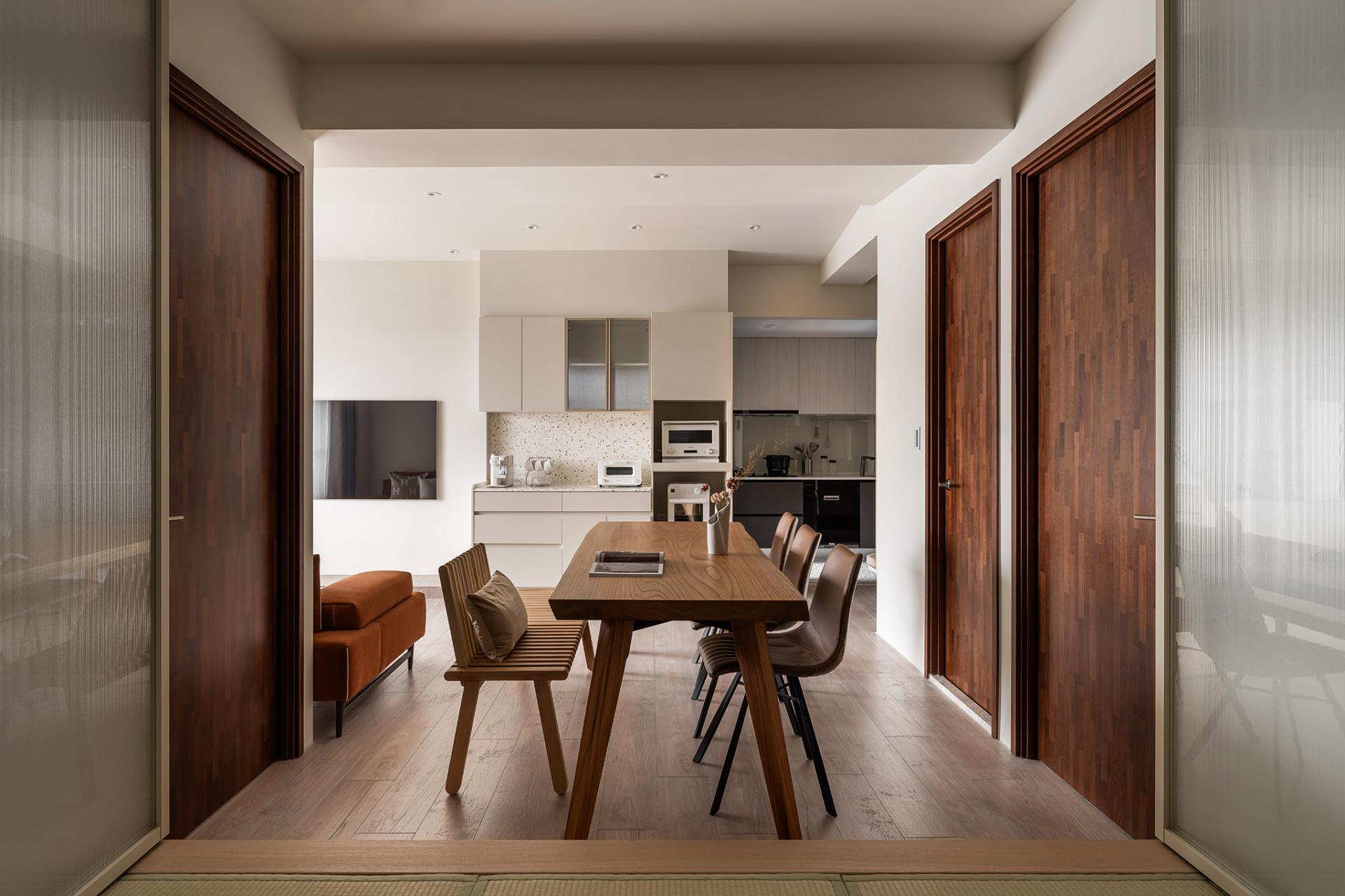 Transitioning into the tatami room, onew will find that a raised design accented with rounded corners and suspended folding doors. This intentional design choice not only minimizes dust accumulation but also fosters a clean, crisp visual rhythm that enhances the tranquility of the space. Finally, the master bedroom continues the theme of warmth with its rich wooden textures.