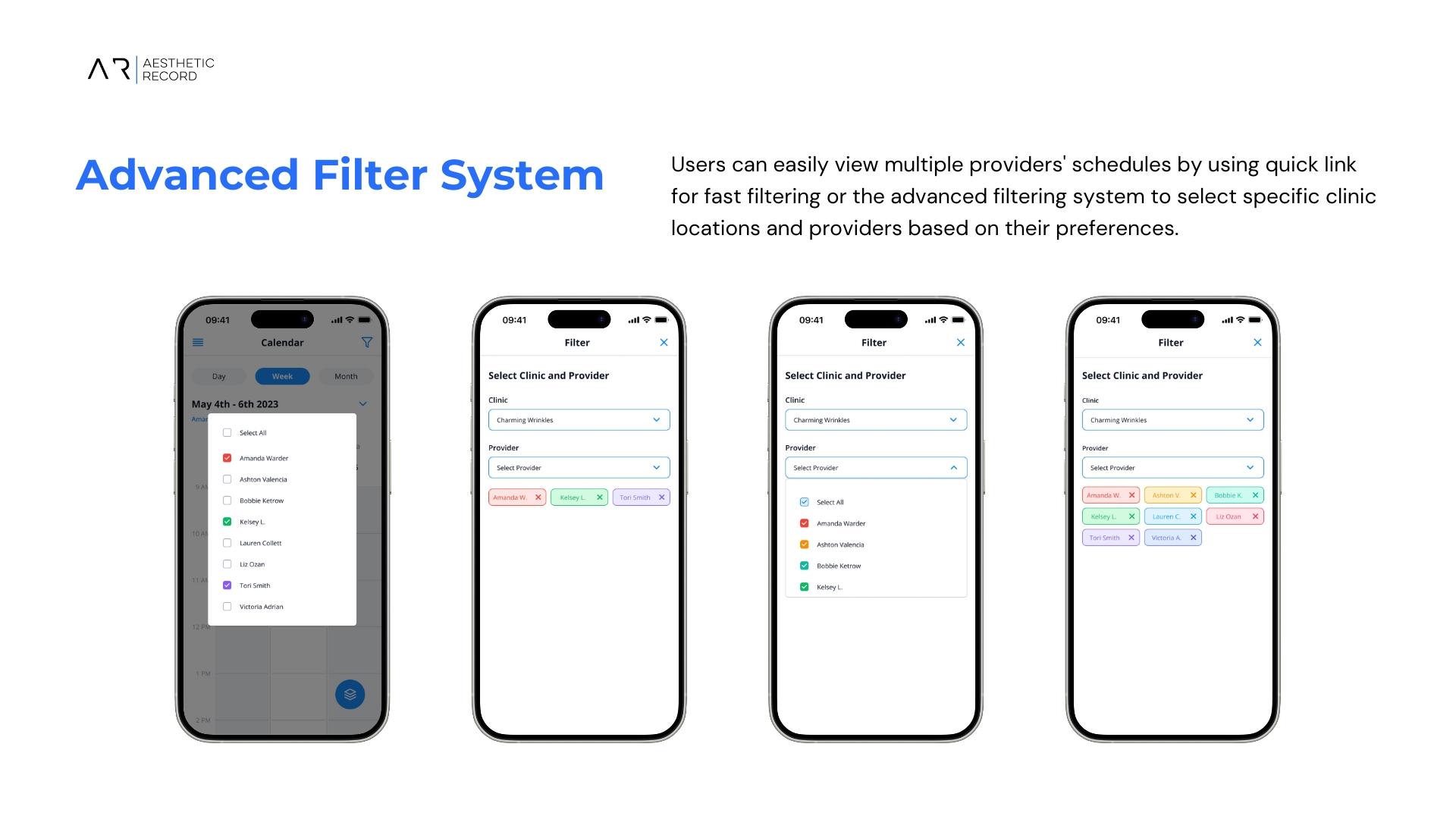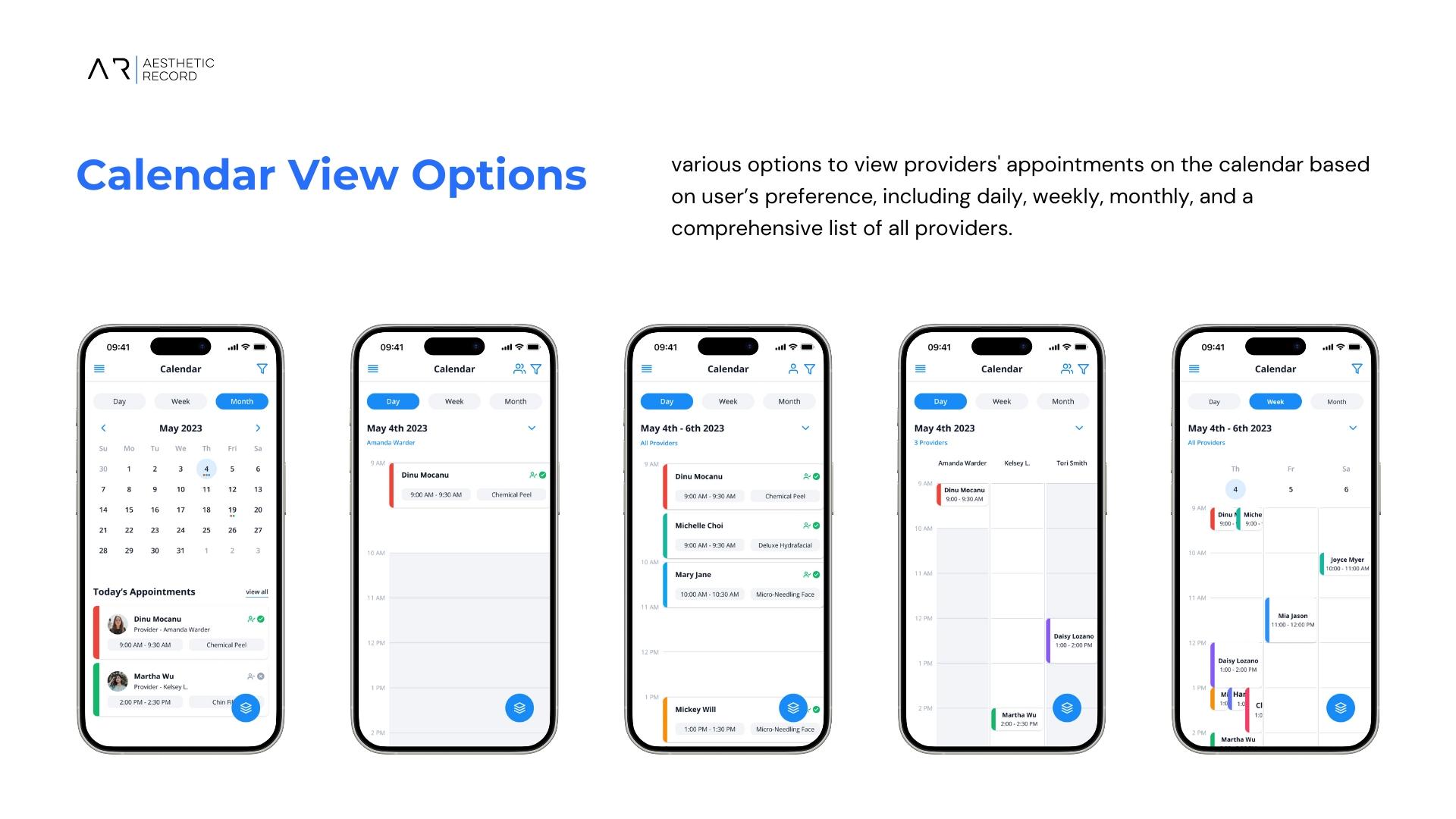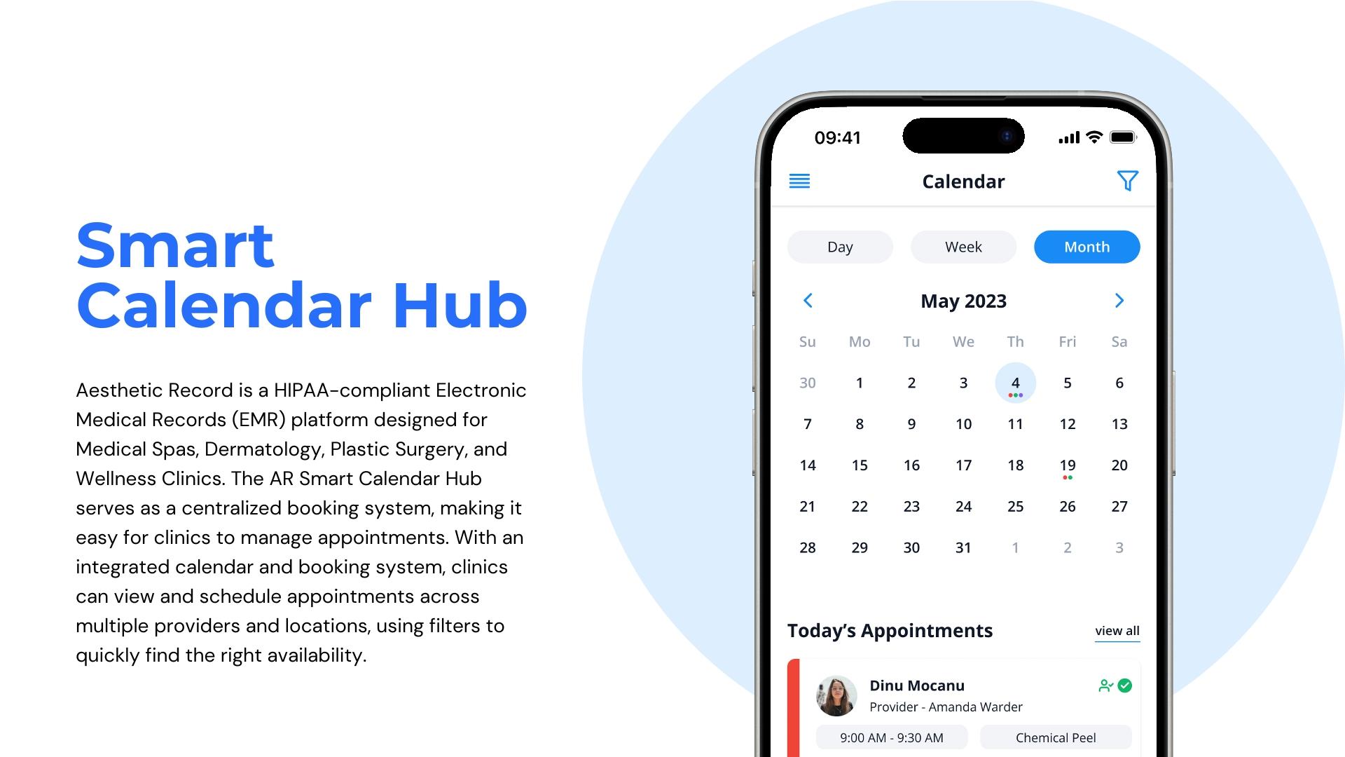 Aesthetic Record is a HIPAA-compliant Electronic Medical Records (EMR) platform designed for Medical Spas, Dermatology, Plastic Surgery, and Wellness Clinics. The AR Smart Calendar Hub serves as a centralized booking system, making it easy for clinics to manage appointments. With an integrated calendar and booking system, clinics can view and schedule appointments across multiple providers and locations, using filters to quickly find the right availability. This app offers a flexible Calendar View with options to display providers' appointments by day, week, month, or as a full list across all providers. Its Advanced Filter System allows users to customize their view using powerful filters and quick-access hotlinks for easier schedule management. The Streamlined Booking System provides a centralized platform for adding, viewing, and editing patient appointments, all enhanced with user-friendly features for efficient scheduling.