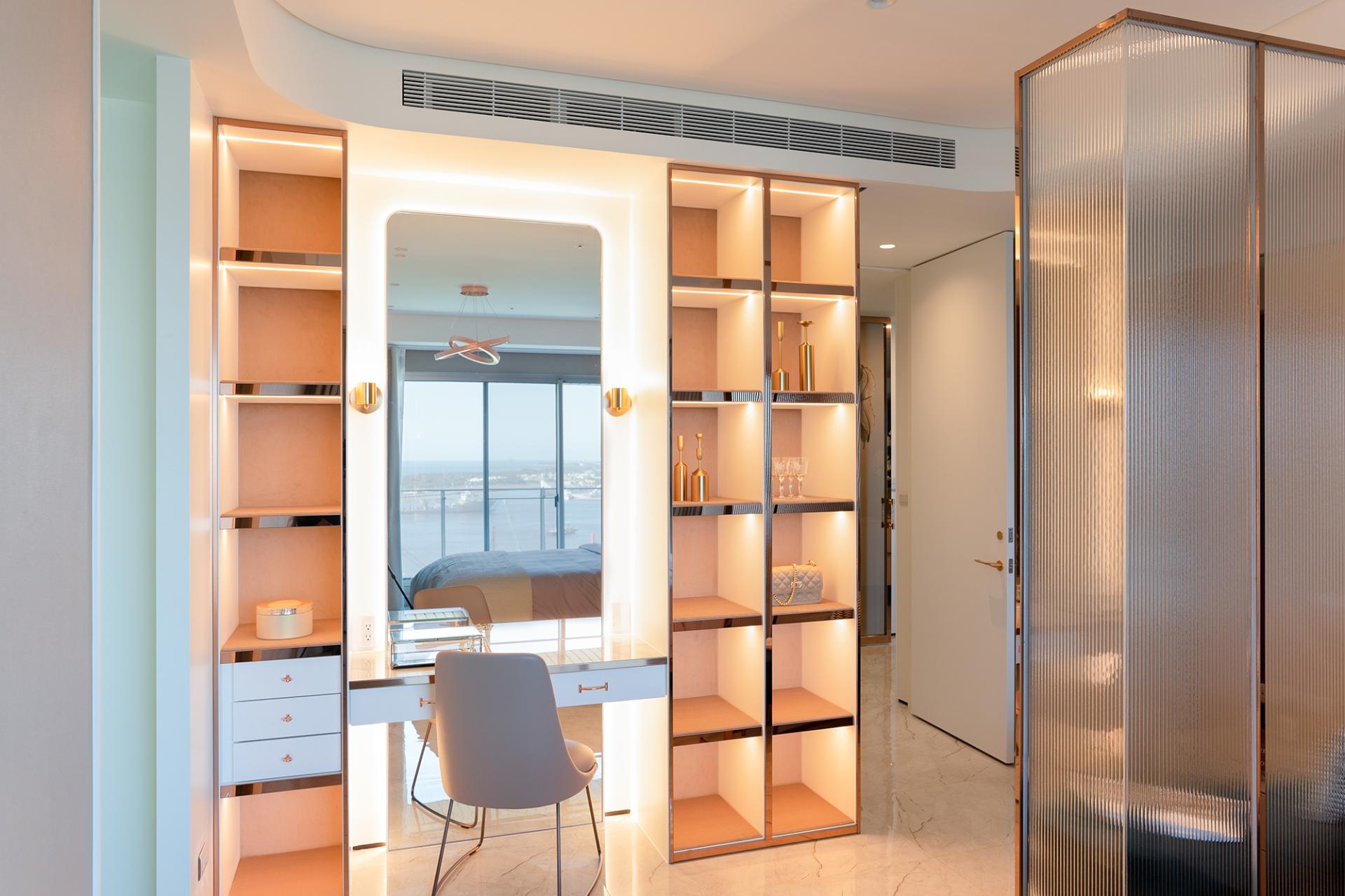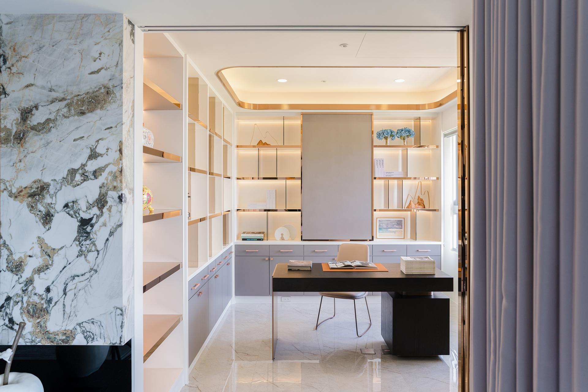 Taking into account the owner’s profession, this designer has meticulously transformed this residence into an elite clubhouse, seamlessly merging both residential comfort and commercial functionality. To effectively accommodate the diverse needs of these dual purposes, the design team transformed the original four-bedroom layout into a more versatile three-bedroom configuration. This strategic redesign features a luxurious double master bedroom, complemented by an expansive open-plan living room, dining area, and study, creating an inviting atmosphere for both relaxation and productivity.