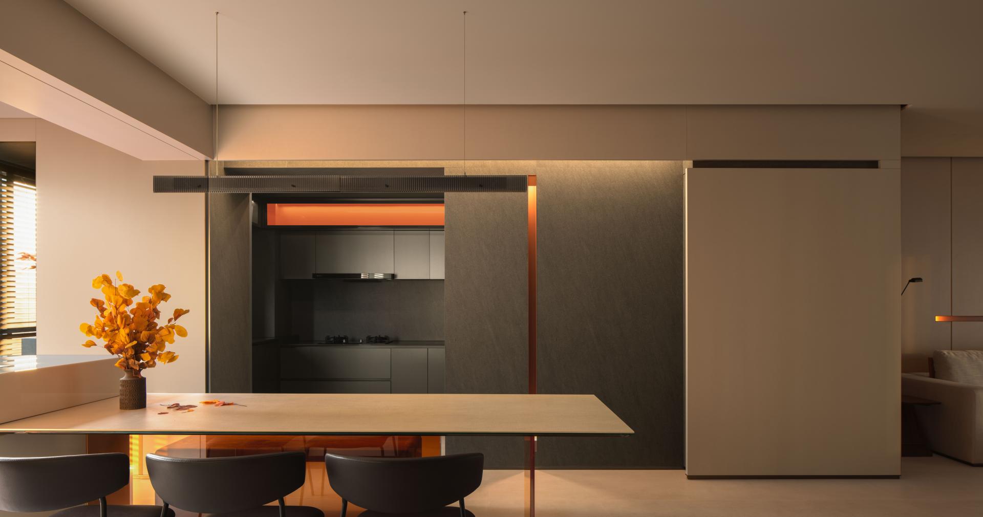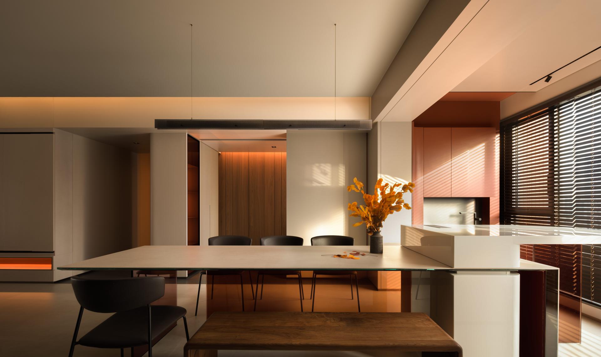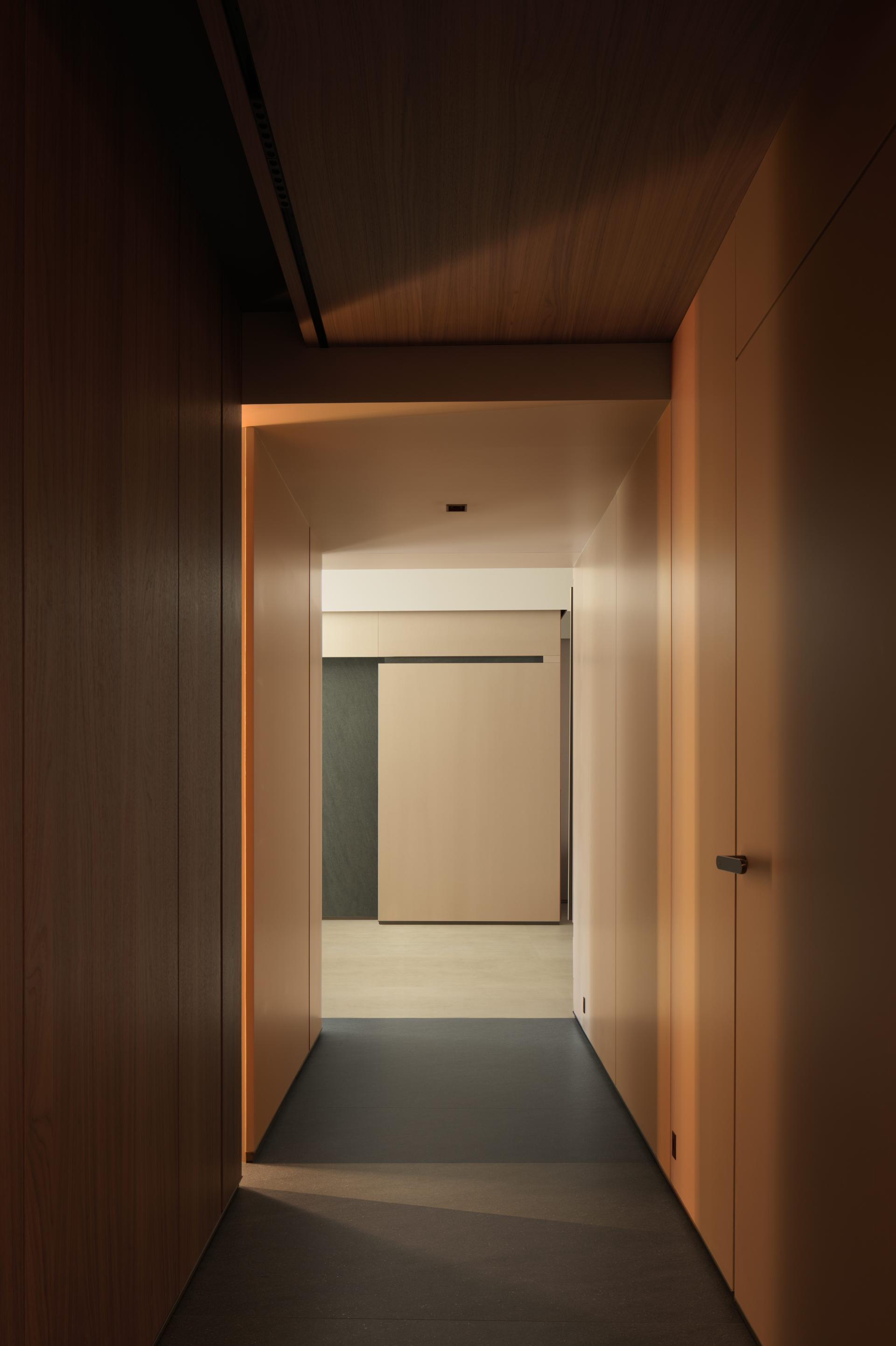 This project embodies a poetic interpretation of daily living by grounding design in perceptual subtlety and emotional cadence. At its core, the residence explores how the minutiae of space—light, texture, proportion—can elevate the everyday into an immersive and meaningful experience. The design draws upon the body as both a perceiving vessel and a medium of expression. Spatial transitions are treated as emotional thresholds: from the "gray space" buffer at the entrance, conceived as a private courtyard for elevator access homes, to the warm timber-clad interiors that unfold with a sense of embrace. An interplay between recessed forms, shifting materials, and lighting sequences establishes mood, rhythm, and intimacy. Central to the project is the notion of proportion—not merely of objects themselves, but in the relational balance between them. This is reflected in the living room’s nested configurations, where layered cabinetry and concealed storage extend across structural elements to seamlessly link the kitchen and public zones. Refined craftsmanship manifests in precise joinery, integrated lighting, and interactive façades, such as retractable honeycomb shades and hidden display systems that blend function with visual delight. Spatial reprogramming further enhances the quality of life: the former balcony is absorbed into an expanded dining and social hub; a compact worktop inserted within a shear wall recess demonstrates spatial optimization. The study, set near a window, uses sliding partitions and tonal flooring transitions to define ambiance while maintaining visual continuity. Circulation is ritualized. A passage between public and private spaces is activated through vertical light slits and layered wall planes, metaphorically evoking fleeting moments of “daily luminosity.” The private zones continue this understated richness: a tatami bedroom showcases material continuity, while the master suite benefits from a newly integrated walk-in closet. Conceptually inspired by Kiyokazu Washida’s philosophy of the “hidden scene,” the project reveals how subtle details—often ignored—can surface through conscious design to evoke timeless emotional depth. In doing so, the space becomes not just a residence, but a meditative vessel for experiencing the profound within the ordinary.