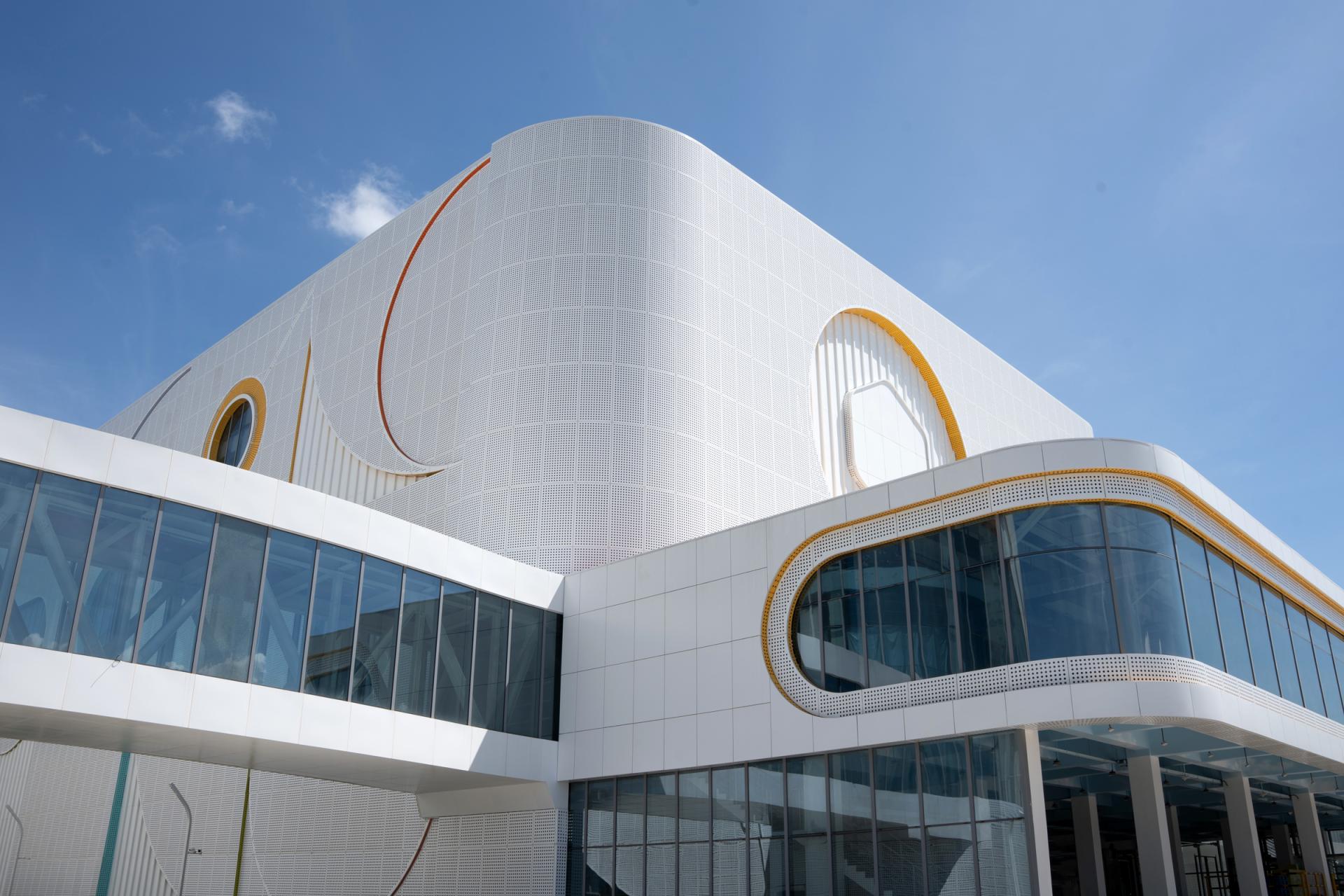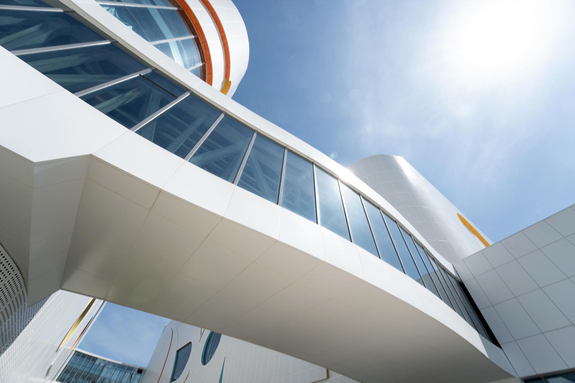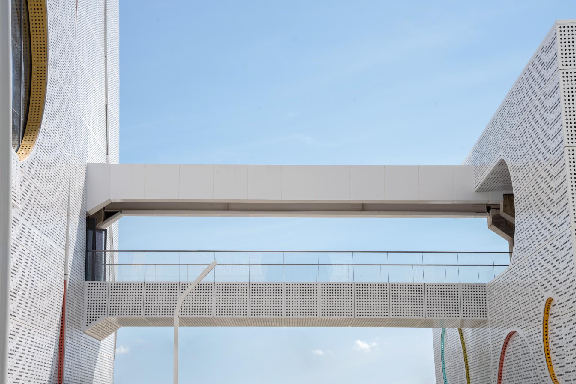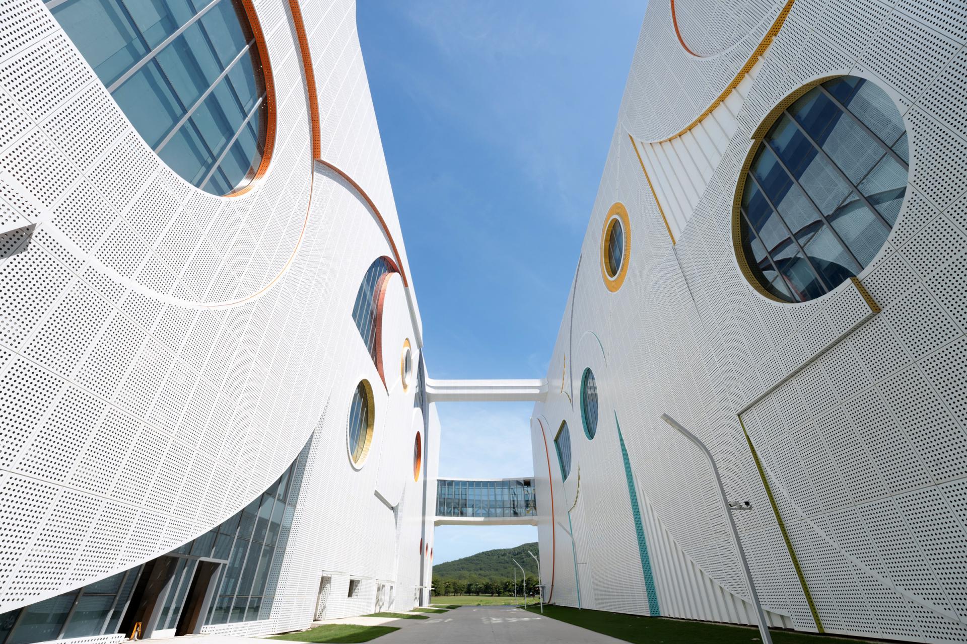 Primary Material: White aluminum perforated panels – Combines lightweight properties with resistance to salt corrosion, making it ideal for Zhuhai's high-humidity coastal environment. The perforation size is parametrically designed to moderate the city's intense sunlight and sea breezes, balancing lighting and insulation needs while contributing to building energy efficiency.