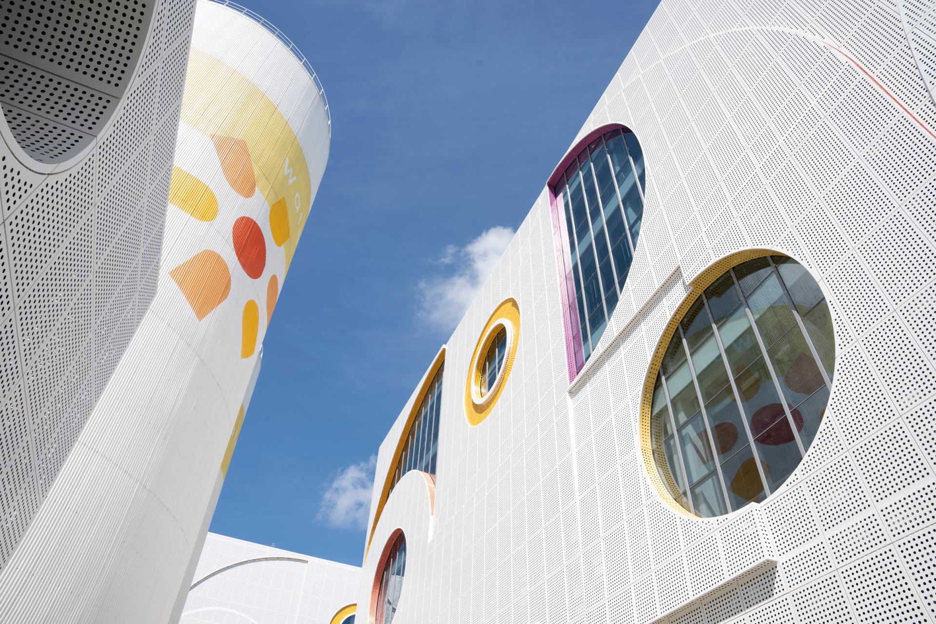 The design takes the brand's Visual Identity (VI) as its starting point. Extracting the layered geometric color blocks from the brand logo, it translates them into three-dimensional building blocks through the sculptural composition of the building facade. Modular color blocks are arranged using staggered and interlocking techniques, creating a rhythmic skin that symbolizes the multidimensional fusion of healthy elements.