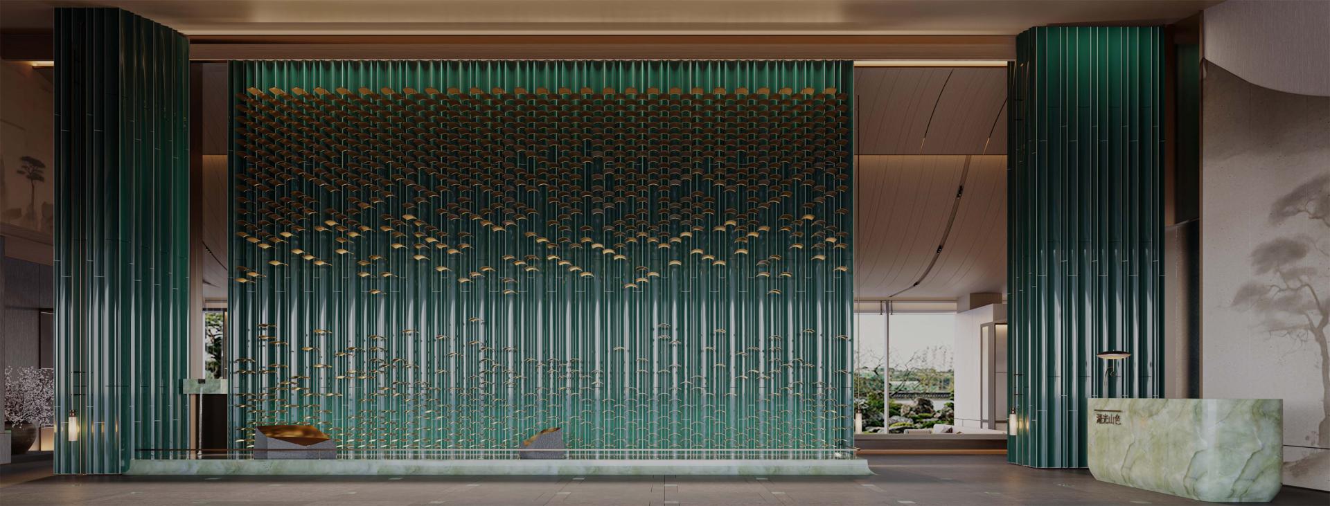 With its overall layout, architectural lines, and home decor inspired by the Song Dynasty architecture, this project adopts a progressive sequence— entrance, antechamber, and main hall— to connect different functional areas, presenting a multi-layered, independent, interconnected spatial arrangement. It continues the asymmetrical roof typical of Song Dynasty architecture, complemented by traditional Eastern design elements such as roof tiles, harmoniously blending the elegant fluidity of ancient architecture with the functionality of modern interior spaces. It applies a distinctive bamboo joint element-adorned folding screen whose upright posture and top curved ceiling form a striking contrast, with deep green tones and metallic textures evoking a unique contemporary elegance.