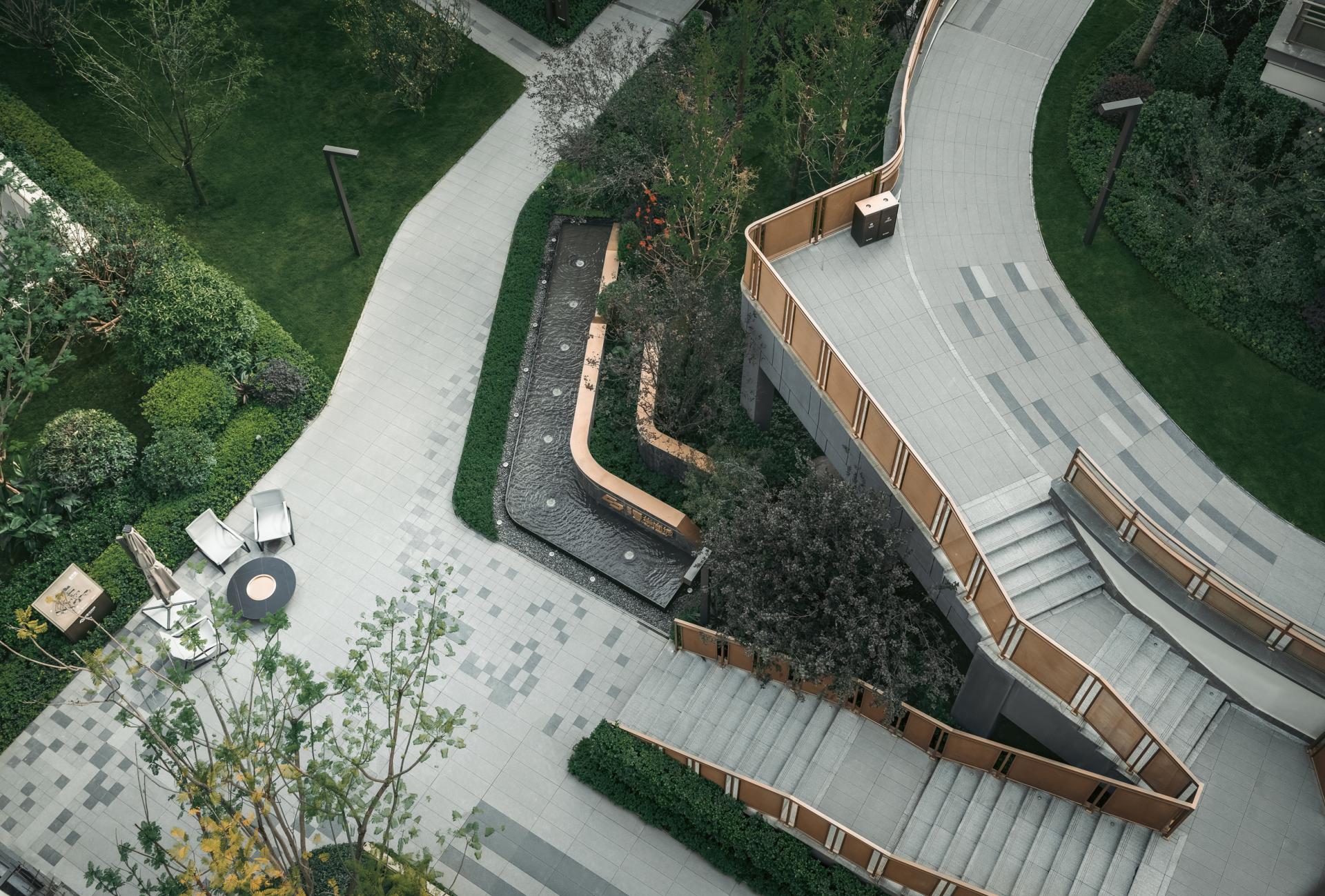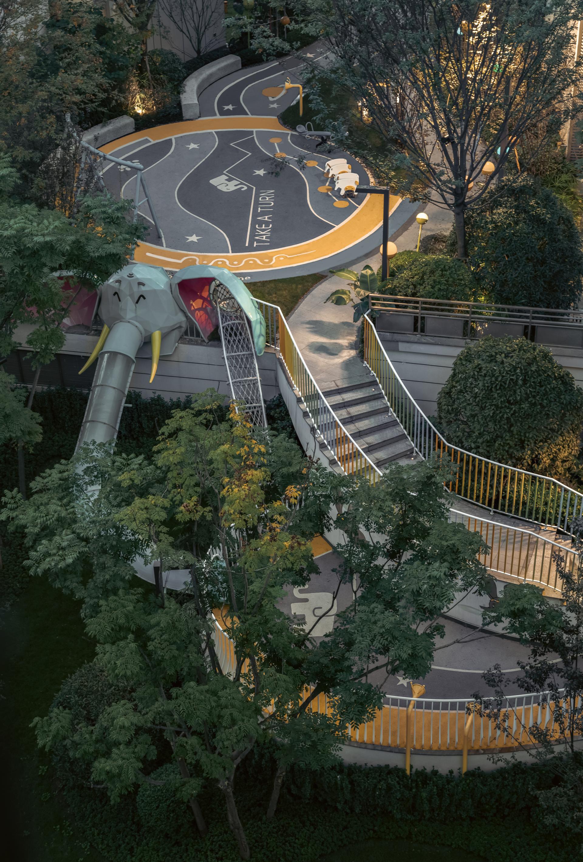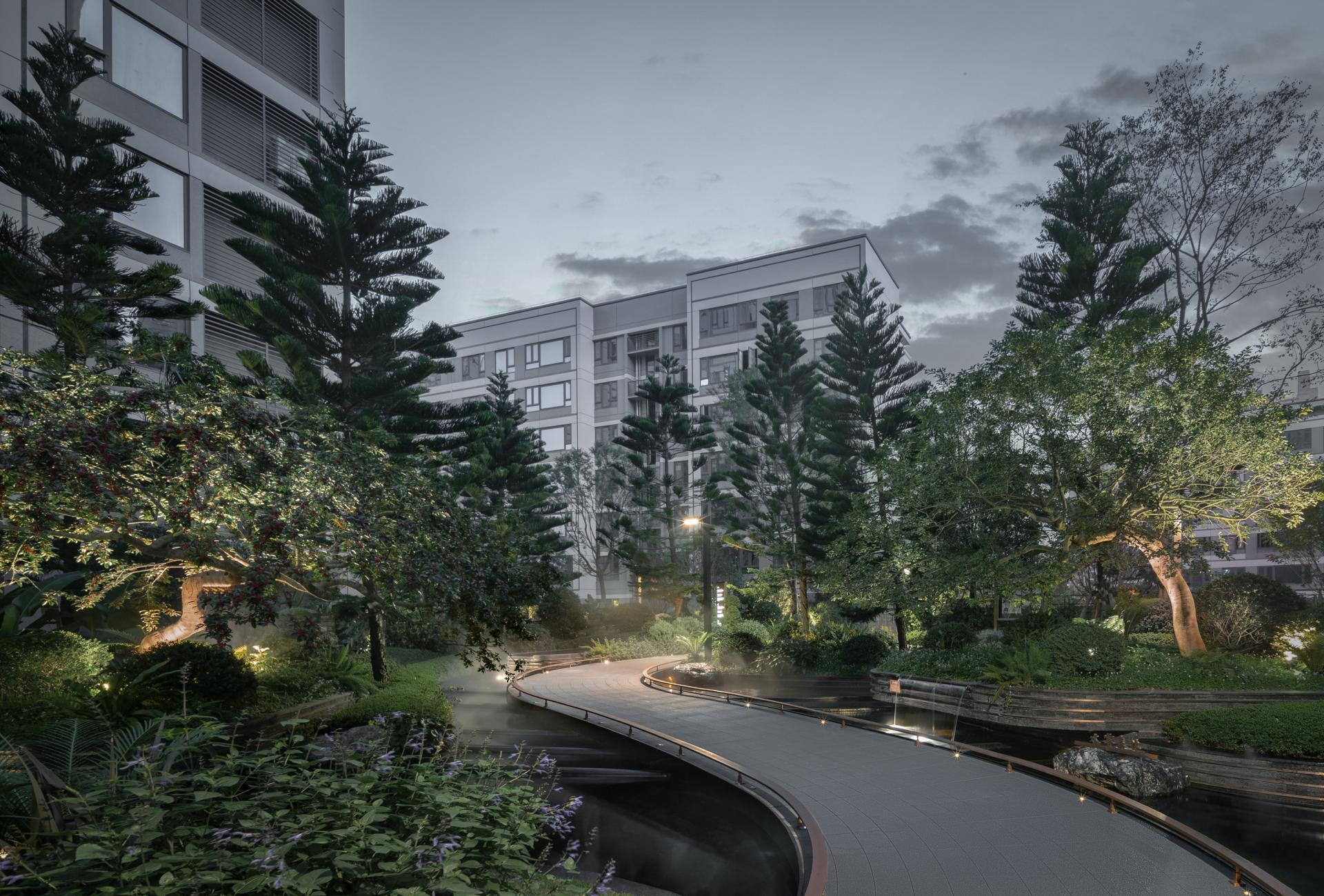 Located in Chongqing, China Overseas Chunhua Shangcheng leverages the region’s dramatic elevation differences to create a mountain-style community landscape that reconnects residents with nature. Rather than relying on superficial symbolism or commercial tropes, the project addresses concrete challenges—such as vertical circulation, site fragmentation, and visual pressure—through deliberate and human-centered spatial interventions. The design employs “Chongqing-style garden craftsmanship” to resolve complex elevation issues across a site with a maximum 35-meter height difference. Through carefully layered platforms, terraced gardens, and direct elevators, the designers transform topographical constraints into spatial assets. Three major terraces formed by tall retaining walls were redesigned as oxygen-rich green valleys, softening hard edges with hanging greenery and cascading waters to form immersive, walkable environments. Landscaped platforms with varied heights incorporate forest balconies, ridge trails, and fluid sightlines that introduce views from the adjacent park into the community. The design seamlessly connects vertical nodes using multi-level pathways, bridges, and plant-covered slopes, ensuring accessibility and cohesion across the site. A major feature is the transformation of challenging edge conditions into poetic experiences. For example, the Flying Elephant Park connects two fire-rescue zones separated by a 7-meter drop. Here, the designers addressed vertical movement, wall concealment, and play integration simultaneously, creating a Disney-style children’s playground that encourages exploration and imagination. Sustainability and ecological sensitivity are embedded in the design through the use of native and seasonal vegetation. Vertical greening techniques, such as soft-hanging terraces and plant-integrated retaining walls, restore disturbed landforms and transform previously scarred slopes—left from mountain blasting—into green “bandages” that symbolize ecological healing. Public and semi-private spaces along circulation routes serve multiple functions: enhancing wayfinding, increasing interaction, and providing visual and sensory relief. The use of multi-sensory planting, natural textures, and elevation-framed viewpoints encourages emotional resonance with the landscape and enhances the daily living experience. Through precise terrain reading, refined detailing, and a strong sense of local identity, the project turns elevation challenges into layered spatial narratives. It creates a community where architecture, landscape, and topography interact harmoniously, forming a mountain dwelling experience that is functional, poetic, and deeply rooted in place.