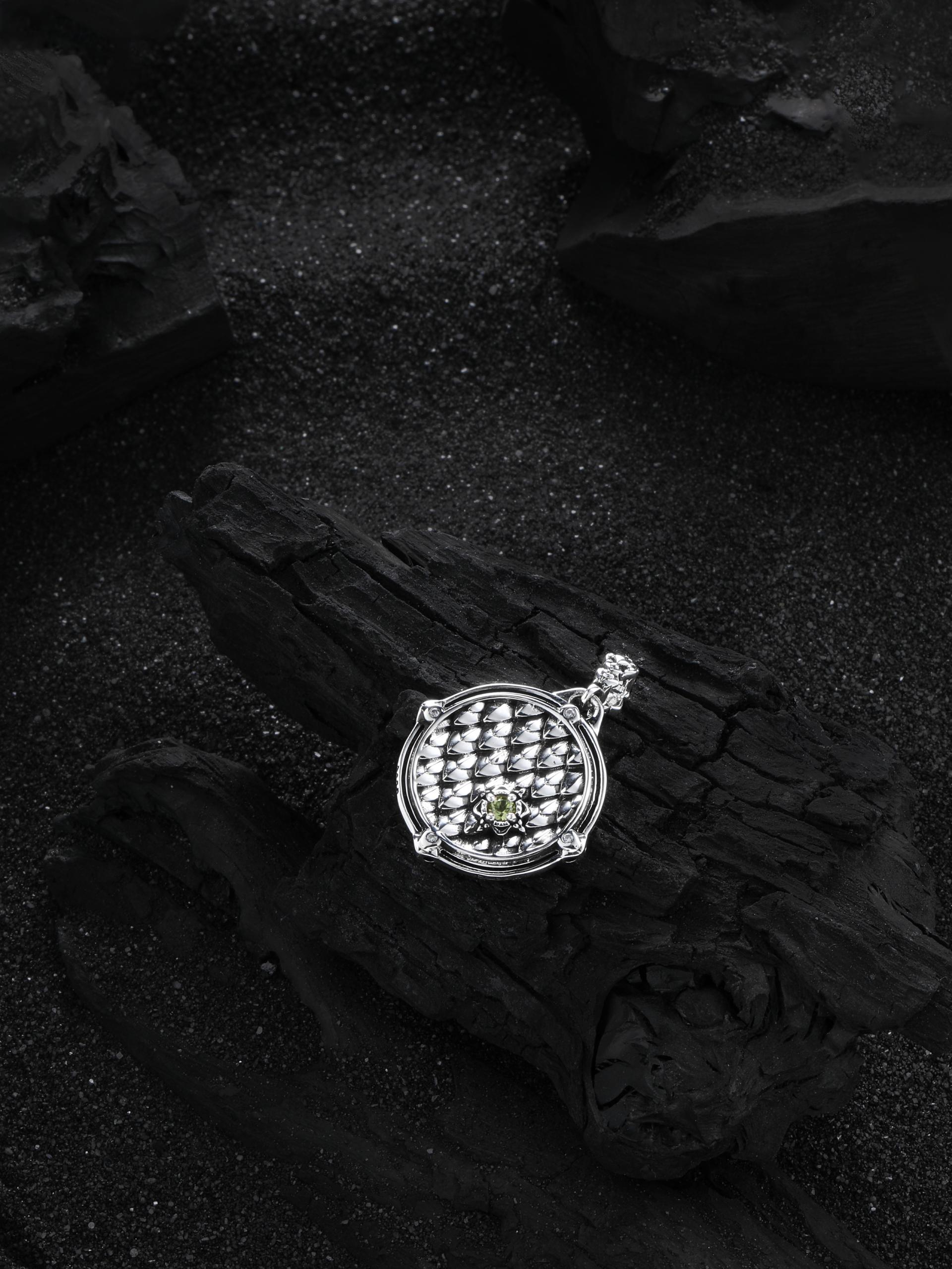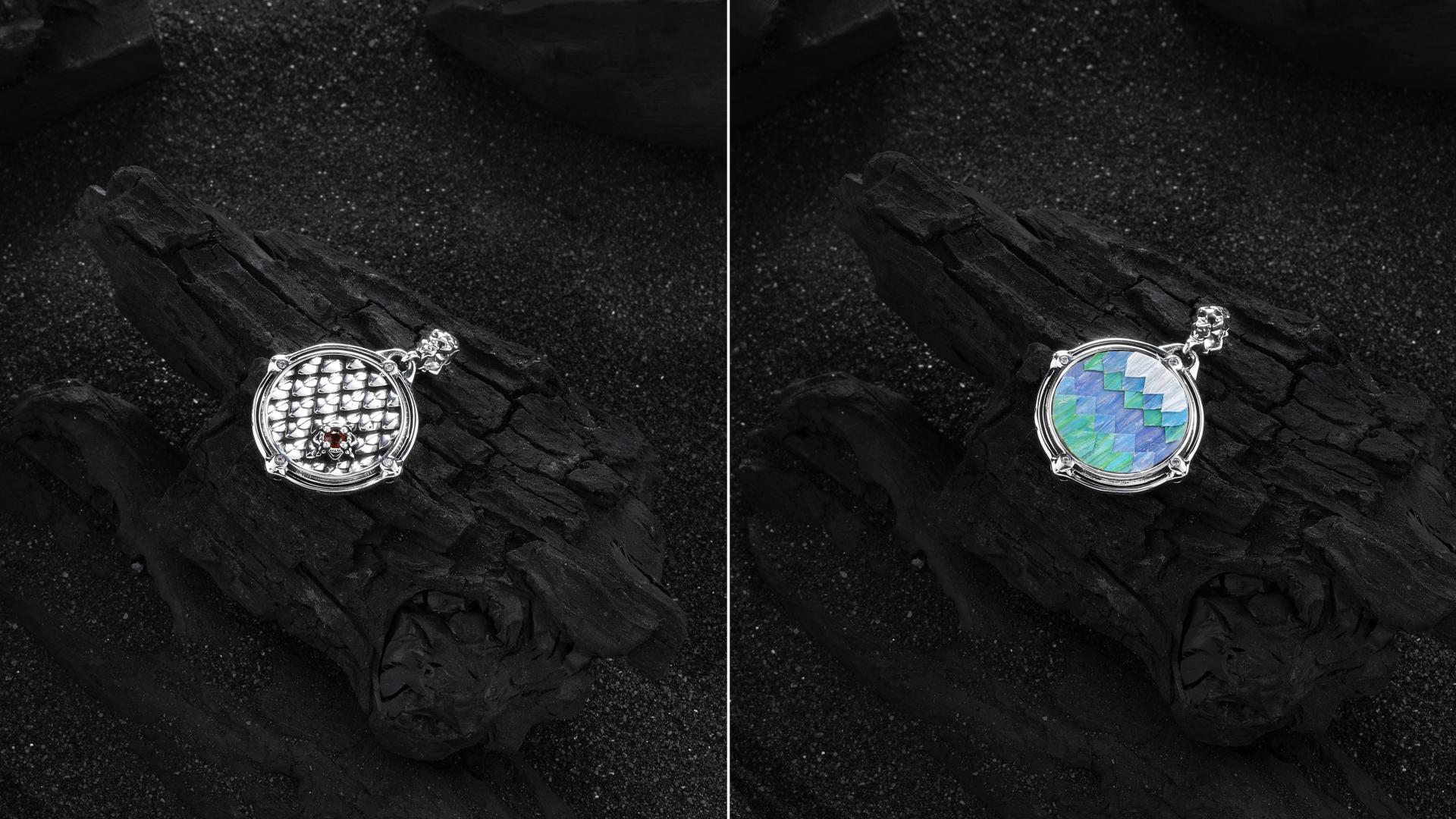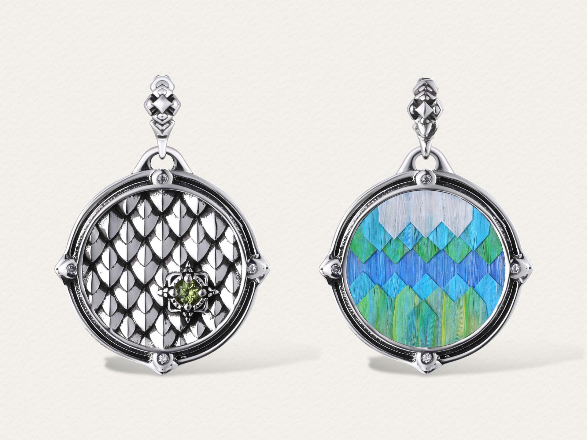 The front side of the pendant features a micro-set "dragon scale" design, with each scale individually carved and assembled to form an intricate dragon-scale texture, symbolizing the gathered divince power of the dragon clan, embodying the meaning of "Descendants of the dragon, summoning wind and rain, moving forward fearlessly", and interpreting the unique charm of traditional culture. Inlaid within the dragon scales is a birthstone, allowing the wearer to customize the gem corresponding to their birth month. This not only helps express personal styles but also highlights the significance of exclusive protective energy. The rear side features a "green mountains and clear waters" motif using parrot feathers and modern mineral glazes through traditional Diancui craft, showcasing the refined craftsmanship while echoing the ecological philosophy of "Clear waters and green mountains are invaluable assets." The dual-sided composite structure juxtaposes the bold metallic dragon scale texture with the soft gradient elegance of the Diancui motif, exemplifying the Eastern aesthetic of "Strength and softness in harmony" and reflecting the Eastern philosophy of "Hiding one's light under a bushel".
